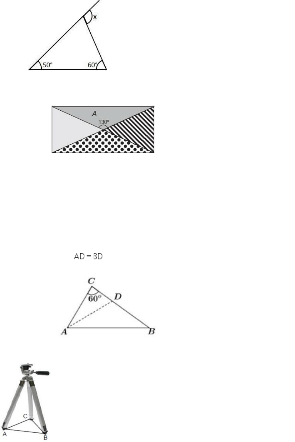 <p>NOME: _______________________________________________________________________</p><p>Prof. Wanderson Lima</p><p>ATIVIDADE DE CLASSIFICAÇÃO DE TRIÂNGULOS</p><p>1. Na imagem abaixo, determine a opção em graus do valor do ângulo x.</p><p>2. (ENCCEJA 2012) Uma colcha de retalhos, com formato retangular, é feita com</p><p>quatro recortes triangulares de tecidos, conforme a figura.</p><p>Considere que as costuras nos sentidos das diagonais dessa colcha são perfeitamente</p><p>retilíneas.</p><p>O retalho A da colcha, que tem o formato de um triângulo, pode ser classificado quanto</p><p>a seus ângulos internos e lados, respectivamente, como</p><p>3. No triângulo ABC exibido na figura a seguir, AD é a bissetriz do ângulo interno</p><p>em A e . O ângulo interno em A é igual a</p><p>4. (Telecurso 2000). Observe a figura de um tripé de câmera fotográfica.</p><p>Pode-se notar que as três pernas do tripé formam um triângulo denominado ABC.</p><p>Considere que os ângulos dos vértices A e B desse triângulo medem,</p><p>respectivamente, 40° e 87°.</p><p>O valor do ângulo C, em graus, é de?</p><p>NOME: _______________________________________________________________________</p><p>Prof. Wanderson Lima</p><p>5. (SAEPE). Observe os triângulos abaixo. Qual desses triângulos é equilátero?</p><p>6. (SAEP). Observe o triângulo EFG abaixo, retângulo em F. Quanto mede o</p><p>ângulo x desse triângulo?</p><p>7. (SAEP 2013). Observe as figuras. Quanto aos lados das figuras abaixo podemos afirmar</p><p>que os triângulos são respectivamente</p><p>8. De acordo com o triângulo abaixo, assinale a alternativa correta:</p><p>9. (SAEGO-2012 – Adaptado). Observe o triângulo a seguir:</p><p>a) O valor de x é 90° e este é um triângulo retângulo.</p><p>b) O valor de x é 80° e este é um triângulo acutângulo.</p><p>c) O valor de x é 75° e este é um triângulo escaleno.</p><p>d) O valor de x é 55° e este é um triângulo isósceles.</p><p>O nome desse triângulo é:</p><p>a) Isósceles</p><p>b) Retângulo</p><p>c) obtusângulo</p><p>d) acutângulo</p>