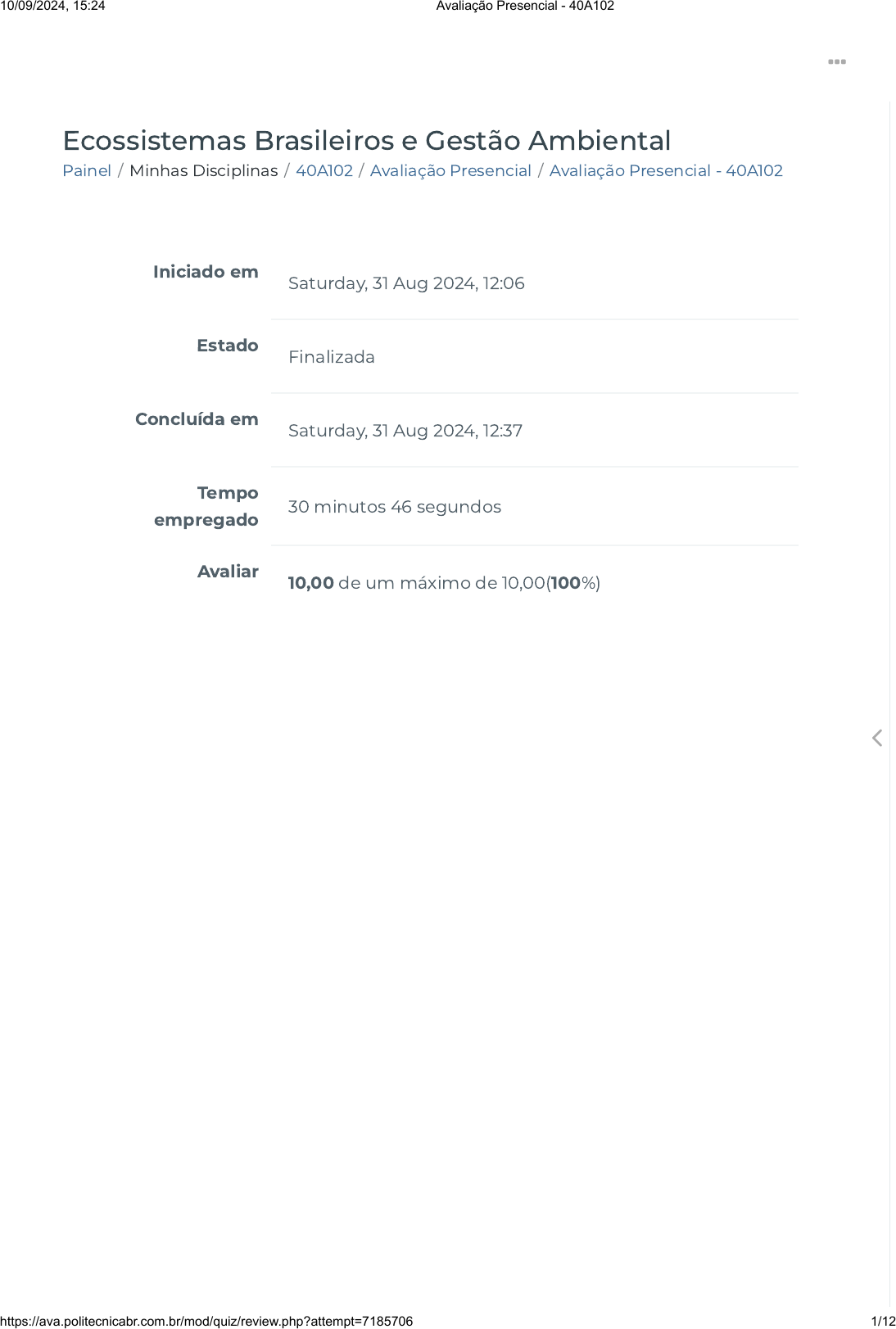 <p>Painel / Minhas Disciplinas / 40A102 / Avaliação Presencial / Avaliação Presencial - 40A102</p><p>Ecossistemas Brasileiros e Gestão Ambiental</p><p>Iniciado em</p><p>Saturday, 31 Aug 2024, 12:06</p><p>Estado</p><p>Finalizada</p><p>Concluída em</p><p>Saturday, 31 Aug 2024, 12:37</p><p>Tempo</p><p>empregado</p><p>30 minutos 46 segundos</p><p>Avaliar</p><p>10,00 de um máximo de 10,00(100%)</p><p></p><p></p><p>10/09/2024, 15:24 Avaliação Presencial - 40A102</p><p>https://ava.politecnicabr.com.br/mod/quiz/review.php?attempt=7185706 1/12</p><p>https://ava.politecnicabr.com.br/my/</p><p>https://ava.politecnicabr.com.br/my/</p><p>https://ava.politecnicabr.com.br/course/view.php?id=1045</p><p>https://ava.politecnicabr.com.br/course/view.php?id=1045#section-17</p><p>https://ava.politecnicabr.com.br/mod/quiz/view.php?id=28899</p><p>https://ava.politecnicabr.com.br/</p><p>Questão 1</p><p>Completo</p><p>Atingiu 1,00 de 1,00</p><p>Com relação a Conservação e alternativas sustentáveis, marque</p><p>Verdadeiro ou Falso:</p><p>Uma das formas mais efetivas para proteção da biodiversidade, são</p><p>as unidades de conservação. Na legislação brasileira que trata</p><p>especi�camente deste assunto (Lei n. 9.985 de 18 de julho de 2000,</p><p>Decreto 4.340 de 22 de agosto de 2002), são reconhecidas duas categorias</p><p>de unidades de conservação, denominadas de “proteção integral” e de “uso</p><p>sustentável”.</p><p>O objetivo principal compatibilizar a conservação da natureza e o</p><p>uso sustentável dos seus recursos naturais, com base no conteúdo do</p><p>chamado plano de manejo da unidade, validado pelo seu respectivo</p><p>Conselho Deliberativo. Esta é a instância responsável pelo gerenciamento da</p><p>área, tendo como presidente o representante do órgão gestor da reserva.</p><p>A Mata dos Cocais, ambiente transicional entre a Amazônia e a</p><p>caatinga, não tem recebido a atenção devida por parte dos estudiosos que</p><p>trabalham em um ou no outro bioma. Muitas vezes interpretadas como</p><p>formações secundárias, não têm sido alvo de ações efetivas de conservação</p><p>da biodiversidade como outros biomas têm sido. Com uma riqueza de</p><p>espécies relativamente baixa, onde três espécies de palmeiras são</p><p>amplamente dominantes dependendo do local considerado. No entanto,</p><p>considerando a importância econômica e social que estas espécies têm na</p><p>região, a proposição de alternativas que sejam de fato sustentáveis para a</p><p>população envolvida e que garantam a manutenção dos palmares é</p><p>urgente. O que se vê na maior parte da região da Mata dos Cocais são</p><p>iniciativas isoladas do poder público e de organizações não governamentais,</p><p>que mostram que alguns caminhos podem ser mais interessantes</p><p>para a utilização destes recursos, especialmente agregando-se valor</p><p>aos produtos obtidos das palmeiras.</p><p>Escolha uma opção:</p><p>Verdadeiro</p><p></p><p></p><p>10/09/2024, 15:24 Avaliação Presencial - 40A102</p><p>https://ava.politecnicabr.com.br/mod/quiz/review.php?attempt=7185706 2/12</p><p>https://ava.politecnicabr.com.br/</p><p>Questão 2</p><p>Completo</p><p>Atingiu 1,00 de 1,00</p><p>Assinale a alternativa que não corresponde ao Atol das Rocas:</p><p>Escolha uma opção:</p><p>Falso</p><p>a. Durante os períodos de maré alta, somente duas</p><p>pequenas ilhas �cam emersas, enquanto na maré baixa surgem</p><p>várias piscinas naturais no interior do atol, sendo importantes</p><p>como locais de crescimento de uma série de espécies de peixes e</p><p>demais organismos marinhos.</p><p>b. O Atol também se destaca por ser uma importante área de</p><p>desova da tartaruga-verde (Chelonia mydas), além de ser área de</p><p>abrigo e alimentação da tartaruga-de-pente (Eretmochelys</p><p>imbricata), tal qual Fernando de Noronha. O Atol das Rocas</p><p>também é uma base importante do Projeto Tamar.</p><p>c. Este ocupa uma área de aproximadamente 3 800</p><p>quilômetros quadrados, entre as coordenadas 17°20´ a 18°10´ S e</p><p>38°35´ a 39°20´ W, no litoral sul da Bahia, a cerca de 65</p><p>quilômetros do continente.</p><p>d. O arquipélago de Fernando de Noronha e o Atol das Rocas</p><p>integram a área denominada de Ilhas Atlânticas Brasileiras,</p><p>designada pela Unesco como Patrimônio Mundial Natural em</p><p>2001.</p><p></p><p></p><p>10/09/2024, 15:24 Avaliação Presencial - 40A102</p><p>https://ava.politecnicabr.com.br/mod/quiz/review.php?attempt=7185706 3/12</p><p>https://ava.politecnicabr.com.br/</p><p>Questão 3</p><p>Completo</p><p>Atingiu 1,00 de 1,00</p><p>O litoral brasileiro, com aproximadamente 9 mil quilômetros de</p><p>extensão, pode ser considerado pobre em termos de grandes recortes,</p><p>principalmente quanto à relação entre sua extensão e a área territorial</p><p>do país. Com base nas características geológicas, oceanográ�cas e climáticas</p><p>da costa brasileira, podem ser reconhecidas cinco regiões: amazônica,</p><p>nordestina, oriental, sudeste e meridional. Associe as alternativas:</p><p>Feições abruptas e íngremes semelhantes a grandes barrancos</p><p>nas proximidades da costa, formadas por sedimentos arenosos</p><p>consolidados e que foram sujeitos à intensa erosão</p><p>marinha, comuns na costa do nordeste do Brasil.</p><p>Cada uma das categorias reconhecidas no sistema de</p><p>classi�cação da vegetação brasileira, incluindo desde os níveis</p><p>mais abrangentes (zonas ou regiões) até os mais especí�cos,</p><p>como formações e subformações.</p><p>Corpo aquoso litorâneo de circulação mais ou menos restrita,</p><p>ainda ligado ao oceano aberto, em muitos casos relacionados à</p><p>desembocadura de rios com intenso processo de sedimentação.</p><p>Correntes essencialmente paralelas à linha de costa, geradas</p><p>pela incidência oblíqua de ondas a esta linha, e que atingem</p><p>m
