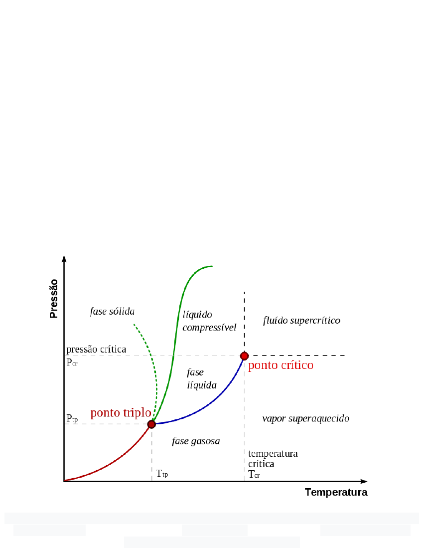 <p>Termodinâmica</p><p>2003 Lourenço/2013 Baêta</p><p>Diagrama de Fases</p><p>Os mais simples diagramas de fase são diagramas pressão-temperatura de uma única</p><p>substância, tais como a água. Os eixos correspondem à pressão e à temperatura. O</p><p>diagrama de fase mostra, em espaço pressão-temperatura, as linhas de equilíbrio ou</p><p>contornos de fase entre as três fases de sólido, líquido e gás.</p><p>Os espaços abertos correspondem a regiões de fase única. Regiões monofásicas são</p><p>separadas por linhas, onde transições de fase ocorrem, que são</p><p>chamados contornos ou limites de fase.</p><p>No diagrama à baixo, o contorno de fase entre líquido e gás não continua indefinidamente.</p><p>Em vez disso, ele termina em um ponto no diagrama de fase chamado ponto crítico. Isto</p><p>reflete o fato que, a extremamente altas temperaturas e pressões, as fases líquidas e</p><p>gasosas tornam-se indistinguíveis, no que é conhecido como um fluido supercrítico.</p><p>Um típico diagrama de fase. A linha pontilhada mostra o comportamento anômalo da água. As linhas</p><p>verdes marcam o ponto de congelamento e a linha azul o ponto de ebulição, mostrando como tais</p><p>grandezas variam de acordo com a pressão</p><p>Obs O contorno de fase líquido-sólido no diagrama de fase da maioria das substâncias</p><p>tem um coeficiente angular positivo; quanto maior a pressão sobre uma determinada</p><p>substância, o aproximar das moléculas da substância as coloca interpostas uma das outras,</p><p>o que aumenta o efeito das forças intermoleculares da substância. Assim, a substância</p><p>requer uma temperatura mais elevada para as suas moléculas terem energia suficiente</p><p>para quebrar o padrão fixo da fase sólida e entrar na fase líquida. Um conceito similar</p><p>aplica-se a mudanças de fase gás-líquido. A água, por causa de suas propriedades</p><p>particulares, é uma das várias exceções à regra. Nos gráficos da água, antimônio, ferro e</p><p>bismuto, a curva de fusão/ solidificação é rotacionada para a esquerda.</p><p>Pressão de vapor</p><p>Em um recipiente fechado, as moléculas de vapor da água se desprenderão, exercendo</p><p>pressão sobre as paredes do recipiente e sobre a superfície do líquido. O vapor também</p><p>poderá atingir a superfície do líquido e se condensar</p><p>Na situação de equilíbrio, quando a condensação se estabiliza com a evaporação, temos</p><p>a pressão máxima de vapor, que é a pressão máxima que a substância pode ter de vapor,</p><p>já que o ambiente estará saturado de vapor.</p><p>A pressão máxima de vapor depende apenas da temperatura e natureza do material, e não</p><p>da quantidade (massa e volume).</p><p>Para deixar essa visualização mais clara, façamos um gráfico que representa a distribuição</p><p>das velocidades das partículas de um líquido em um sistema fechado.</p><p>Pelo conceito de temperatura como velocidade média das partículas, temos uma</p><p>densidade maior de partículas com essa determinada velocidade. Porém, há também</p><p>partículas com velocidades menores e maiores que a média. A essas partículas com</p><p>velocidades maiores, há uma tendência de elas se desprenderem do líquido (assim se dá</p><p>a vaporização)</p><p>Da mesma forma, há partículas do vapor nesse sistema fechado que perdem energia</p><p>cinética e se juntam ao líquido (é a condensação)</p><p>Aqui vemos uma representação de um sistema fechado onde as partículas azuis representam o conjunto</p><p>líquido (ao menos num instante inicial) e as vermelhas as representam o vapor (ao menos inicialmente).</p><p>Dei uma destacada em preto nas partículas mais da superfície por elas serem as primeiras a evaporarem.</p><p>Note que cada partícula possui um vetor velocidade aleatório, que se altera por colisões e afins, gerando</p><p>os processos já citados de evaporação e condensação</p><p>Por fim, vamos analisar a mudança da pressão de máxima de vapor com a mudança de</p><p>temperatura do sistema.</p><p>Essa variação exponencial se dá pelo fato de, ao aumentarmos a energia cinética média do</p><p>sistema, o gráfico da distribuição da energia das partículas se “move” pra esquerda e,</p><p>consequentemente o número de partículas com energia cinética suficiente pra se desprender</p><p>da superfície do líquido e virar vapor aumenta muito (veja o gráfico abaixo para melhor</p><p>compreensão)</p><p>Será que em uma garrafa de água fechada há água evaporada?</p><p>Se deixarmos essa garrafa por alguns dias em repouso, veremos que o nível da água não</p><p>diminuirá como ocorreria se a garrafa estivesse aberta. Será que isso significa, então, que</p><p>a água não evapora se o recipiente estiver fechado?</p><p>Não. Todo sistema que contém um líquido está sujeito à evaporação. Isso acontece</p><p>quando as moléculas da superfície ganham energia suficiente para desfazer as suas</p><p>ligações intermoleculares e escaparem para fora da massa líquida.</p><p>Por exemplo, considere um sistema que contém uma parte de ar e outra de água, como na</p><p>garrafa fechada. Inicialmente, algumas moléculas da superfície evaporam e ocupam os</p><p>espaços entre as partículas de ar. Essa evaporação vai ocorrendo com várias moléculas</p><p>separadas até que o ar fica saturado de vapor de água. Esse vapor de água exerce uma</p><p>pressão sobre a superfície do líquido, sendo que essa é a pressão máxima de vapor da</p><p>água nessa determinada temperatura.</p><p>A partir desse momento, o nível da água não se modifica, ou seja, a quantidade de</p><p>moléculas no estado de vapor permanece constante. Entretanto, isso não significa que não</p><p>haverá mais moléculas que passarão para o estado de vapor. Na realidade, para que uma</p><p>molécula vire vapor, outra molécula que já está no estado de vapor deve voltar 
