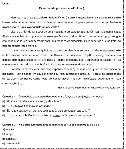 Leia: Experimento policial Algumas manchas são de Se uma blusa ou bermuda estiver suja e não houver jeito de saber se é de chocolate ou doce de leite, ninguém perde muito tempo tentando e vai logo lavar aquela roupa. Certo? se a dúvida for saber se uma mancha é de a situação fica mais complicada. Ainda mais se isto for importante na investigação de um crime Com passar do tempo, sangue escurece e pode até ficar parecido com uma mancha de Para saber do que se trata, só mesmo recorrendo à Existem alguns produtos químicos capazes de identificar se uma mancha é sangue ou não Um desses produtos é chamado um indicador de Ela reage quando em contato com de - como que é ligeiramente - e fica com uma con Mas se a for ou nada a não reage apenas com mas com qualquer substância de pH básico. como em por exemplo. Para aumentar a teste de identificação de sangue conhecido como teste de - também tem oxigenada em sua [...] Disponíval am Questão 1 - O vocabulo destacado desempenha a função de conjunção no trecho: a) manchas são de b) a situação fica mais c) "Ela reage em contato com de caráter básico d) qualquer de pH como sabão em por exemplo." Questão 2 - No trecho apontado anteriormente, a conjunção exprime a ideia de: a) adição b) tempo c) condição d) comparação