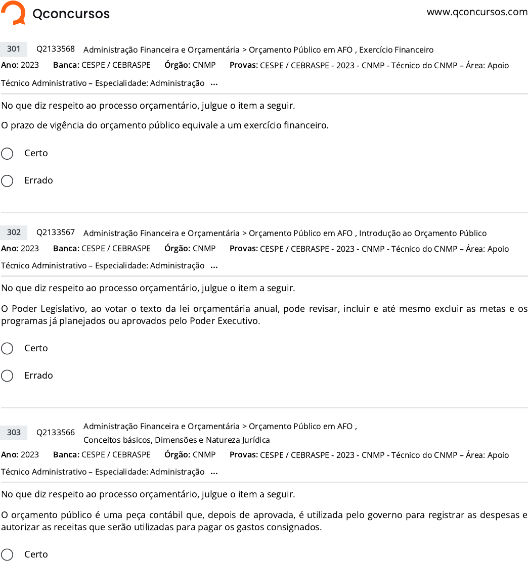 <p>www.qconcursos.com</p><p>Ano: 2023 Banca: CESPE / CEBRASPE Órgão: CNMP</p><p>No que diz respeito ao processo orçamentário, julgue o item a seguir.</p><p>O prazo de vigência do orçamento público equivale a um exercício �nanceiro.</p><p>Certo</p><p>Errado</p><p>Ano: 2023 Banca: CESPE / CEBRASPE Órgão: CNMP</p><p>No que diz respeito ao processo orçamentário, julgue o item a seguir.</p><p>O Poder Legislativo, ao votar o texto da lei orçamentária anual, pode revisar, incluir e até mesmo excluir as metas e os</p><p>programas já planejados ou aprovados pelo Poder Executivo.</p><p>Certo</p><p>Errado</p><p>Ano: 2023 Banca: CESPE / CEBRASPE Órgão: CNMP</p><p>No que diz respeito ao processo orçamentário, julgue o item a seguir.</p><p>O orçamento público é uma peça contábil que, depois de aprovada, é utilizada pelo governo para registrar as despesas e</p><p>autorizar as receitas que serão utilizadas para pagar os gastos consignados.</p><p>Certo</p><p>301 Q2133568 >Administração Financeira e Orçamentária Orçamento Público em AFO , Exercício Financeiro</p><p>Provas: CESPE / CEBRASPE - 2023 - CNMP - Técnico do CNMP – Área: Apoio</p><p>Técnico Administrativo – Especialidade: Administração ...</p><p>302 Q2133567 >Administração Financeira e Orçamentária Orçamento Público em AFO , Introdução ao Orçamento Público</p><p>Provas: CESPE / CEBRASPE - 2023 - CNMP - Técnico do CNMP – Área: Apoio</p><p>Técnico Administrativo – Especialidade: Administração ...</p><p>303 Q2133566</p><p>>Administração Financeira e Orçamentária Orçamento Público em AFO ,</p><p>Conceitos básicos, Dimensões e Natureza Jurídica</p><p>Provas: CESPE / CEBRASPE - 2023 - CNMP - Técnico do CNMP – Área: Apoio</p><p>Técnico Administrativo – Especialidade: Administração ...</p><p>https://www.qconcursos.com/</p><p>https://www.qconcursos.com/questoes-de-concursos/bancas/cespe-cebraspe</p><p>https://www.qconcursos.com/questoes-de-concursos/institutos/cnmp</p><p>https://www.qconcursos.com/questoes-de-concursos/bancas/cespe-cebraspe</p><p>https://www.qconcursos.com/questoes-de-concursos/institutos/cnmp</p><p>https://www.qconcursos.com/questoes-de-concursos/bancas/cespe-cebraspe</p><p>https://www.qconcursos.com/questoes-de-concursos/institutos/cnmp</p><p>https://www.qconcursos.com/questoes-de-concursos/questoes/5af63406-e6</p><p>https://www.qconcursos.com/questoes-de-concursos/disciplinas/administracao-administracao-financeira-e-orcamentaria</p><p>https://www.qconcursos.com/questoes-de-concursos/disciplinas/administracao-administracao-financeira-e-orcamentaria/orcamento-publico-em-afo</p><p>https://www.qconcursos.com/questoes-de-concursos/disciplinas/administracao-administracao-financeira-e-orcamentaria/exercicio-financeiro</p><p>https://www.qconcursos.com/questoes-de-concursos/provas/cespe-cebraspe-2023-cnmp-tecnico-do-cnmp-area-apoio-tecnico-administrativo-especialidade-administracao</p><p>https://www.qconcursos.com/questoes-de-concursos/provas/cespe-cebraspe-2023-cnmp-tecnico-do-cnmp-area-apoio-tecnico-administrativo-especialidade-administracao</p><p>https://www.qconcursos.com/questoes-de-concursos/questoes/5af315d7-e6</p><p>https://www.qconcursos.com/questoes-de-concursos/disciplinas/administracao-administracao-financeira-e-orcamentaria</p><p>https://www.qconcursos.com/questoes-de-concursos/disciplinas/administracao-administracao-financeira-e-orcamentaria/orcamento-publico-em-afo</p><p>https://www.qconcursos.com/questoes-de-concursos/disciplinas/administracao-administracao-financeira-e-orcamentaria/introducao-ao-orcamento-publico</p><p>https://www.qconcursos.com/questoes-de-concursos/provas/cespe-cebraspe-2023-cnmp-tecnico-do-cnmp-area-apoio-tecnico-administrativo-especialidade-administracao</p><p>https://www.qconcursos.com/questoes-de-concursos/provas/cespe-cebraspe-2023-cnmp-tecnico-do-cnmp-area-apoio-tecnico-administrativo-especialidade-administracao</p><p>https://www.qconcursos.com/questoes-de-concursos/questoes/5aeff32e-e6</p><p>https://www.qconcursos.com/questoes-de-concursos/disciplinas/administracao-administracao-financeira-e-orcamentaria</p><p>https://www.qconcursos.com/questoes-de-concursos/disciplinas/administracao-administracao-financeira-e-orcamentaria/orcamento-publico-em-afo</p><p>https://www.qconcursos.com/questoes-de-concursos/disciplinas/administracao-administracao-financeira-e-orcamentaria/conceitos-basicos-dimensoes-e-natureza-juridica</p><p>https://www.qconcursos.com/questoes-de-concursos/provas/cespe-cebraspe-2023-cnmp-tecnico-do-cnmp-area-apoio-tecnico-administrativo-especialidade-administracao</p><p>https://www.qconcursos.com/questoes-de-concursos/provas/cespe-cebraspe-2023-cnmp-tecnico-do-cnmp-area-apoio-tecnico-administrativo-especialidade-administracao</p><p>Errado</p><p>Ano: 2023 Banca: CESPE / CEBRASPE Órgão: CNMP</p><p>Em relação ao orçamento da União, julgue o item que se segue.</p><p>Atualmente, por força do orçamento impositivo, observadas as ressalvas da lei, o Poder Executivo é obrigado a executar a</p><p>programação das emendas individuais dos parlamentares encartadas na peça orçamentária da União.</p><p>Certo</p><p>Errado</p><p>Ano: 2023 Banca: CESPE / CEBRASPE Órgão: CNMP</p><p>Em relação ao orçamento da União, julgue o item que se segue.</p><p>O estado democrático de direito determina que a lei orçamentária deve abarcar todos os programas governamentais e que</p><p>nenhum deles pode ser executado sem ter passado pelo rito tradicional de tramitação e aprovação da referida lei.</p><p>Certo</p><p>Errado</p><p>Ano: 2023 Banca: CESPE / CEBRASPE Órgão: CNMP</p><p>Julgue o seguinte item, acerca das normas de planejamento, orçamento, �nanças, patrimônio e contabilidade do Distrito</p><p>Federal.</p><p>O período de alcance da renúncia da receita tributária �cará adstrito à vigência da lei orçamentária anual.</p><p>304 Q2133565</p><p>>Administração Financeira e Orçamentária Orçamento Pú