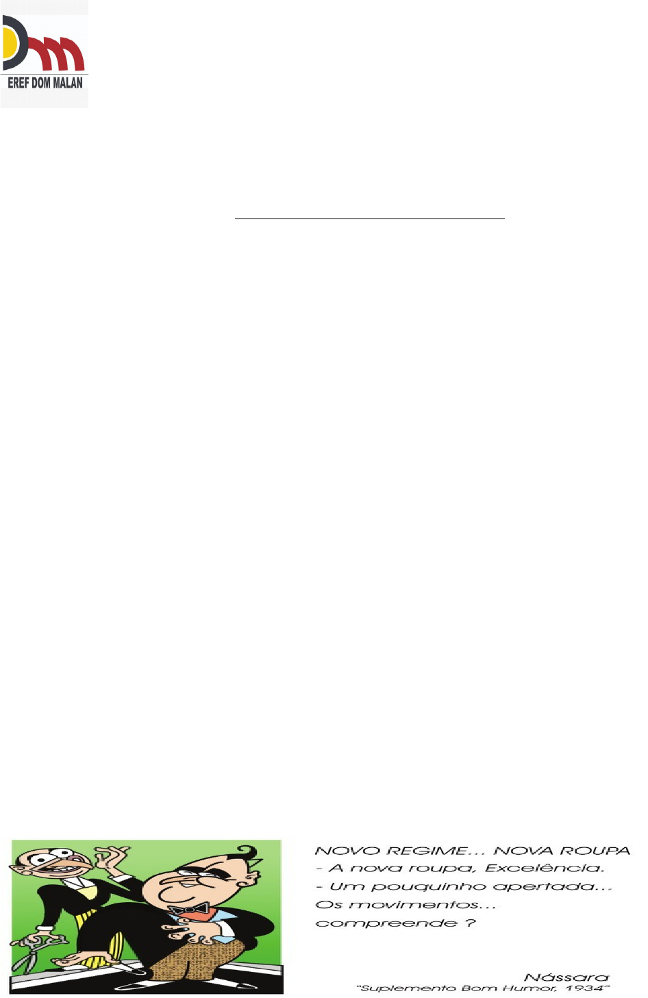 <p>EREF DOM MALAM</p><p>PROFESSORA : DÉBORA BARROS</p><p>DISCIPLINA : HISTÓRIA</p><p>ALUNO ( A):_______________________________________________________SÉRIE: __ TURMA: ____</p><p>ATIVIDADE DE HISTÓRIA 9º ANO</p><p>1ºExplique como Getúlio Vargas chegou poder em 1930.</p><p>_____________________________________________________________________________________________________________________________________________________________________________________________________________________________________________________________________________________________________________________________________________________________________________________________________________________________________________________________</p><p>2º Assinale a alternativa que apresenta corretamente as fases da Era Vargas.</p><p>a) Governo Geral, Governo Provisório e Governo Constitucional.</p><p>b) Governo de Todos, Governo Provisório e Governo Constitucional.</p><p>c) Governo Provisório, Governo Constitucional e Estado Novo</p><p>d) Governo Geral, Governo Constitucional e Estado Novo</p><p>3-Leia o texto a seguir.</p><p>A partir da criação do DIP, todos os serviços de propaganda e publicidade dos ministérios, departamentos e estabelecimentos da administração pública federal e entidades autárquicas passaram a ser executados com exclusividade pelo órgão. O DIP, departamento de propaganda do governo de Getúlio Vargas, criado em 1938, tornou-se um instrumento central da política varguista, pois tinha, entre outras funções, o papel de</p><p>(A) criar o mesmo tipo de propaganda veiculada na União Soviética.</p><p>(B) garantir que todo tipo de informação pudesse chegar ao Brasil.</p><p>(C) controlar a opinião pública nacional durante Governo Provisório.</p><p>(D) divulgar a cultura nacional e a imagem positiva de Getúlio Vargas.</p><p>4º Analise a imagem para responder a questão.</p><p>A caricatura revela um momento da chamada "era de Vargas", quando Getúlio preparava-se para:</p><p>a) assumir a presidência da República, após a sua eleição indireta pela Assembleia Constituinte.</p><p>b) liderar um golpe militar, instaurando um período histórico conhecido por Estado Novo.</p><p>c) disputar as eleições diretas para a presidência da República, no contexto da redemocratização do país.</p><p>D) comandar uma revolução constitucionalista, contra a oligarquia do setor agroexportador</p><p>5º</p><p>Essa imagem foi impressa em cartilha escolar durante a vigência do Estado Novo com o intuito de</p><p>a) destacar a sabedoria inata do líder governamental.</p><p>b) atender a necessidade familiar de obediência infantil.</p><p>c) promover o desenvolvimento consistente das atitudes solidárias.</p><p>d) conquistar a aprovação política por meio do apelo carismático.</p><p>6ºEm 10 de novembro de 1937, Getúlio Vargas se dirigiu à população através do rádio: "A disputa presidencial estava levando o país à desordem. Os comunistas infiltravam-se dia a dia nas instituições nacionais. A Nação corria perigo de uma luta de classes e os partidos políticos inquietavam o nosso povo".</p><p>Este discurso inaugura o período chamado:</p><p>a) Estado Novo</p><p>b) República Nova</p><p>c) Era Vargas</p><p>d) Revolução de 30</p><p>7ºEXPLIQUE QUAL EVENTO DA ERA VARGAS A IMAGEM ABAIXO REPRESENTA.</p><p>______________________________________________________________________________________________________________________________________________________________________________________________________________________________________________________________________________________________________________________________________________________________________________________________________________________________________________________________________________________________________________________________________________________</p><p>8ºQuais foram os motivos que levaram ao fim da Era Vargas? O que foi o Quererismo?</p><p>______________________________________________________________________________________________________________________________________________________________________________________________________________________________________________________________________________________________________________________________________________________________________________________________________________________________________________________________________________________________________________________________________________________</p><p>image3.jpeg</p><p>image1.jpeg</p><p>image2.jpeg</p><p>image4.jpg</p>