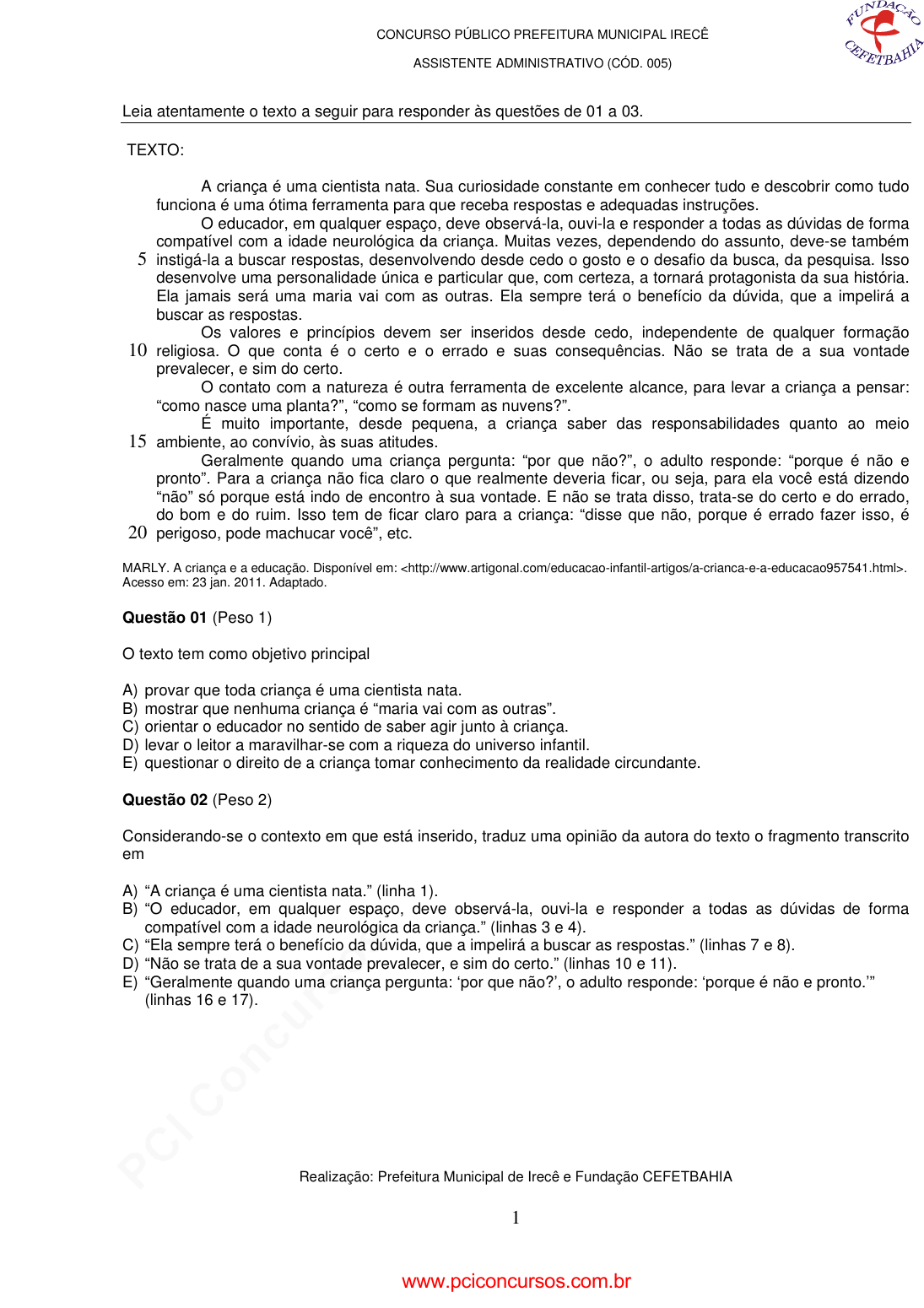 <p>pcimarkpci MDAwMDowMDAwOjAwMDA6MDAwMDowMDAwOmZmZmY6YjEzMzo0YTFi:U3VuLCAyMCBPY3QgMjAyNCAxOTo0NTozNCAtMDMwMA==</p><p>www.pciconcursos.com.br</p><p>CONCURSO PÚBLICO PREFEITURA MUNICIPAL IRECÊ</p><p>ASSISTENTE ADMINISTRATIVO (CÓD. 005)</p><p>Realização: Prefeitura Municipal de Irecê e Fundação CEFETBAHIA</p><p>1</p><p>Leia atentamente o texto a seguir para responder às questões de 01 a 03.</p><p>TEXTO:</p><p>A criança é uma cientista nata. Sua curiosidade constante em conhecer tudo e descobrir como tudo</p><p>funciona é uma ótima ferramenta para que receba respostas e adequadas instruções.</p><p>O educador, em qualquer espaço, deve observá-la, ouvi-la e responder a todas as dúvidas de forma</p><p>compatível com a idade neurológica da criança. Muitas vezes, dependendo do assunto, deve-se também</p><p>instigá-la a buscar respostas, desenvolvendo desde cedo o gosto e o desafio da busca, da pesquisa. Isso 5</p><p>desenvolve uma personalidade única e particular que, com certeza, a tornará protagonista da sua história.</p><p>Ela jamais será uma maria vai com as outras. Ela sempre terá o benefício da dúvida, que a impelirá a</p><p>buscar as respostas.</p><p>Os valores e princípios devem ser inseridos desde cedo, independente de qualquer formação</p><p>religiosa. O que conta é o certo e o errado e suas consequências. Não se trata de a sua vontade 10</p><p>prevalecer, e sim do certo.</p><p>O contato com a natureza é outra ferramenta de excelente alcance, para levar a criança a pensar:</p><p>“como nasce uma planta?”, “como se formam as nuvens?”.</p><p>É muito importante, desde pequena, a criança saber das responsabilidades quanto ao meio</p><p>ambiente, ao convívio, às suas atitudes. 15</p><p>Geralmente quando uma criança pergunta: “por que não?”, o adulto responde: “porque é não e</p><p>pronto”. Para a criança não fica claro o que realmente deveria ficar, ou seja, para ela você está dizendo</p><p>“não” só porque está indo de encontro à sua vontade. E não se trata disso, trata-se do certo e do errado,</p><p>do bom e do ruim. Isso tem de ficar claro para a criança: “disse que não, porque é errado fazer isso, é</p><p>perigoso, pode machucar você”, etc. 20</p><p>MARLY. A criança e a educação. Disponível em: .</p><p>Acesso em: 23 jan. 2011. Adaptado.</p><p>Questão 01 (Peso 1)</p><p>O texto tem como objetivo principal</p><p>A) provar que toda criança é uma cientista nata.</p><p>B) mostrar que nenhuma criança é “maria vai com as outras”.</p><p>C) orientar o educador no sentido de saber agir junto à criança.</p><p>D) levar o leitor a maravilhar-se com a riqueza do universo infantil.</p><p>E) questionar o direito de a criança tomar conhecimento da realidade circundante.</p><p>Questão 02 (Peso 2)</p><p>Considerando-se o contexto em que está inserido, traduz uma opinião da autora do texto o fragmento transcrito</p><p>em</p><p>A) “A criança é uma cientista nata.” (linha 1).</p><p>B) “O educador, em qualquer espaço, deve observá-la, ouvi-la e responder a todas as dúvidas de forma</p><p>compatível com a idade neurológica da criança.” (linhas 3 e 4).</p><p>C) “Ela sempre terá o benefício da dúvida, que a impelirá a buscar as respostas.” (linhas 7 e 8).</p><p>D) “Não se trata de a sua vontade prevalecer, e sim do certo.” (linhas 10 e 11).</p><p>E) “Geralmente quando uma criança pergunta: ‘por que não?’, o adulto responde: ‘porque é não e pronto.’”</p><p>(linhas 16 e 17).</p><p>www.pciconcursos.com.br</p><p>pcimarkpci MDAwMDowMDAwOjAwMDA6MDAwMDowMDAwOmZmZmY6YjEzMzo0YTFi:U3VuLCAyMCBPY3QgMjAyNCAxOTo0NTozNSAtMDMwMA==</p><p>www.pciconcursos.com.br</p><p>CONCURSO PÚBLICO PREFEITURA MUNICIPAL IRECÊ</p><p>ASSISTENTE ADMINISTRATIVO (CÓD. 005)</p><p>Realização: Prefeitura Municipal de Irecê e Fundação CEFETBAHIA</p><p>2</p><p>Questão 03 (Peso 1)</p><p>No texto, a linguagem é</p><p>A) articulada de forma linear, priorizando a oralidade linguística.</p><p>B) didática, pois está voltada para a finalidade específica do ensino.</p><p>C) conotativa, já que recria determinados significados para os termos “criança” e “educador”.</p><p>D) objetiva, uma vez que é marcada explicitamente pelo afastamento do locutor das ações enfocadas.</p><p>E) explicativa, visto que está sendo usada para esclarecer a si mesma, evitando duplicidade de leitura de</p><p>certos termos.</p><p>Leia atentamente o texto a seguir para responder às questões de 04 a 06.</p><p>TEXTO:</p><p>Pior que arrecadar mal é aplicar mal os recursos que são arrecadados. Essa máxima da</p><p>administração pública denota o importante compromisso que os poderes constituídos –– Legislativo,</p><p>Executivo e Judiciário –– são obrigados a absorver e exercitar ao criar, empregar e julgar o destino das</p><p>verbas públicas.</p><p>Sabemos que nenhum país do mundo, por mais rico que seja, sobrevive sem a cobrança de tributo 5</p><p>e que a carga tributária é um ônus a ser pago pela sociedade a fim de que todos tenham acesso aos</p><p>serviços públicos, principalmente os menos favorecidos financeiramente, funcionando como se fosse uma</p><p>espécie de redistribuição de renda.</p><p>O dinheiro público, constitucionalmente, deve ser empregado para fins coletivos que tenham, na</p><p>população, a sua principal e única meta. As escolas, os hospitais, as estradas e pontes, os aeroportos e 10</p><p>prédios públicos, enfim, tudo que o Estado precisa edificar para atender aos anseios da população é</p><p>conquistado com verbas públicas. Inclui-se ainda, por exemplo, o repasse de verbas para os municípios,</p><p>para os poderes Legislativo e Judiciário, para desenvolver os programas de Saúde e Segurança Pública,</p><p>fazer funcionar o Corpo de Bombeiros que salva vidas e patrimônios, o pagamento do funcionalismo</p><p>público inserido nessa estrutura, para administrar, 