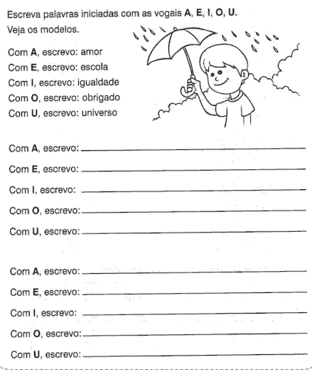 Escreva palavras iniciadas com as vogais A, E, O, U. Veja os modelos. Com A, escrevo: amor Com E, escrevo: escola Com I, escrevo: igualdade Com O, escrevo: obrigado Com U, escrevo: universo Com A, escrevo: Com E, escrevo: Com I, escrevo: Com escrevo: Com U, escrevo: Com A, escrevo: Com escrevo: Com I, escrevo: Com escrevo: Com U, escrevo: