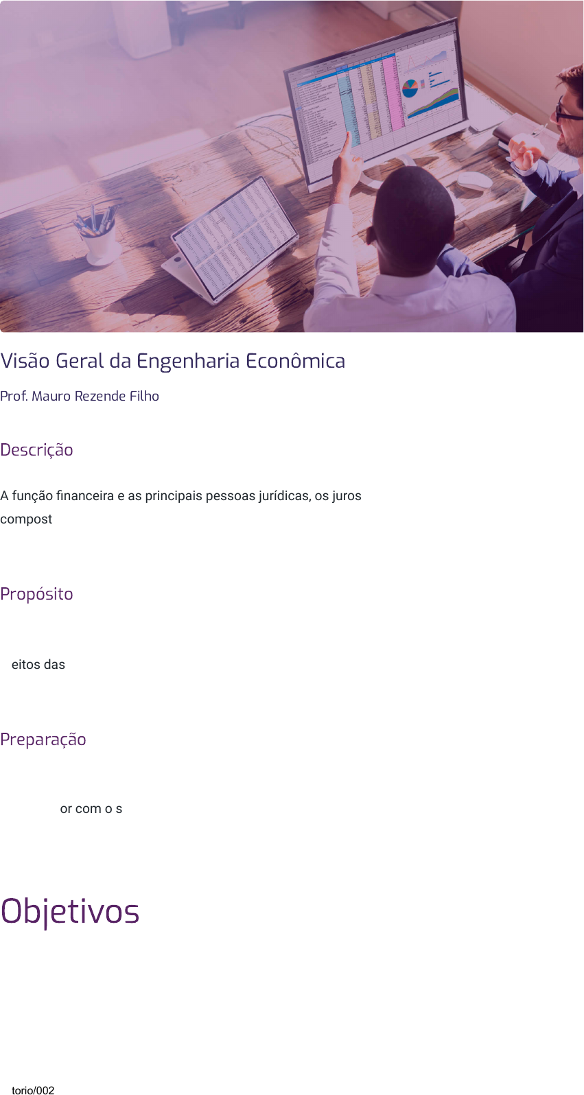 <p>Visão Geral da Engenharia Econômica</p><p>Prof. Mauro Rezende Filho</p><p>Descrição</p><p>A função financeira e as principais pessoas jurídicas, os juros</p><p>compostos, as decisões de investimentos e de financiamento, e o fluxo</p><p>de caixa.</p><p>Propósito</p><p>Compreender a variação do dinheiro no tempo, bem como o cálculo dos</p><p>efeitos das taxas de juros e do tempo nos recursos de uma empresa ou</p><p>na sua vida pessoal.</p><p>Preparação</p><p>Antes de iniciar seus estudos, certifique-se de ter à sua disposição um</p><p>computador com o software Excel, a fim de replicar o conteúdo e os</p><p>exercício apresentados.</p><p>Objetivos</p><p>04/10/2024, 19:58 Visão Geral da Engenharia Econômica</p><p>https://stecine.azureedge.net/repositorio/00212en/04363/index.html?brand=estacio# 1/69</p><p>Módulo 1</p><p>Função �nanceira e principais</p><p>pessoas jurídicas</p><p>Reconhecer a síntese da função financeira e as principais pessoas</p><p>jurídicas.</p><p>Módulo 2</p><p>Demonstrativo – juros</p><p>compostos</p><p>Aplicar juros compostos (Matemática Financeira).</p><p>Módulo 3</p><p>Decisões de investimentos e de</p><p>�nanciamento</p><p>Reconhecer as decisões de investimentos e de financiamento.</p><p>Módulo 4</p><p>Fluxo de caixa</p><p>Aplicar fluxo de caixa.</p><p></p><p>04/10/2024, 19:58 Visão Geral da Engenharia Econômica</p><p>https://stecine.azureedge.net/repositorio/00212en/04363/index.html?brand=estacio# 2/69</p><p>Introdução</p><p>Assista ao vídeo a seguir para conhecer os principais aspectos</p><p>da Engenharia Econômica.</p><p>1 - Função �nanceira e principais pessoas</p><p>jurídicas</p><p>Ao �nal deste módulo, você será capaz de reconhecer a síntese da</p><p>função �nanceira e as principais pessoas jurídicas.</p><p>Vamos começar!</p><p></p><p>04/10/2024, 19:58 Visão Geral da Engenharia Econômica</p><p>https://stecine.azureedge.net/repositorio/00212en/04363/index.html?brand=estacio# 3/69</p><p>Função �nanceira e</p><p>pessoas jurídicas</p><p>Assista ao vídeo a seguir para conhecer os principais aspectos relativos</p><p>à função financeira e às pessoas jurídicas.</p><p>Função �nanceira</p><p>Atividades �nanceiras</p><p>As atividades financeiras são derivadas da análise e interpretação de</p><p>pesquisas sobre o que os CFOs – Chief of Financial Office, Diretor</p><p>Financeiro, em português – e os departamentos financeiros fazem. Uma</p><p>atividade é uma ação, tarefa ou um processo.</p><p>Cada uma das atividades financeiras origina-se de atividades</p><p>organizacionais e se concentra na produção e no uso das informações</p><p>para atender aos seguintes propósitos:</p><p> Contabilidade</p><p>Registrar as consequências financeiras das</p><p>atividades organizacionais.</p><p> Conformidade</p><p>Atender aos requisitos de órgãos governamentais e</p><p>outros órgãos reguladores.</p><p>04/10/2024, 19:58 Visão Geral da Engenharia Econômica</p><p>https://stecine.azureedge.net/repositorio/00212en/04363/index.html?brand=estacio# 4/69</p><p>Interações entre atividades �nanceiras</p><p>A estrutura mostra as interações diretas entre as atividades financeiras,</p><p>que consistem em dois tipos:</p><p></p><p>Informar</p><p>O fluxo de informações,</p><p>tanto financeiras quanto</p><p>de suporte, de uma</p><p>atividade para uso por</p><p>outra. Por exemplo,</p><p>informações contábeis</p><p>básicas são usadas na</p><p></p><p>In�uenciar e</p><p>direcionar</p><p>O uso da informação</p><p>por uma atividade a fim</p><p>de influenciar e</p><p>direcionar quais</p><p>atividades são</p><p>realizadas e como</p><p> Gestão e controle</p><p>Produzir e usar informações financeiras e</p><p>relacionadas para informar, monitorar e instigar</p><p>ações operacionais para atingir os objetivos</p><p>organizacionais.</p><p> Estratégia e risco</p><p>Informar e influenciar, do ponto de vista financeiro,</p><p>o desenvolvimento e a implementação da</p><p>estratégia, bem como gerenciar o risco.</p><p> Financiamento</p><p>Informar e engajar investidores e financiadores,</p><p>atuais e potenciais, para obter e manter os recursos</p><p>financeiros necessários à organização.</p><p></p><p>04/10/2024, 19:58 Visão Geral da Engenharia Econômica</p><p>https://stecine.azureedge.net/repositorio/00212en/04363/index.html?brand=estacio# 5/69</p><p>produção de contas de</p><p>gestão.</p><p>devem ser</p><p>implementadas.</p><p>Conteúdo informativo</p><p>A informação é interpretada em um sentido amplo para incluir o formal</p><p>e o informal, documentado e oral. Para nossos propósitos, consiste em</p><p>dois tipos:</p><p></p><p>Informações �nanceiras</p><p>Consistem em transações, registros, agregações e análises relativos às</p><p>consequências financeiras das ações organizacionais, passadas e</p><p>prospectivas. Consistem em números e descrições.</p><p></p><p>Informações de suporte</p><p>Fornecem contexto e compreensão que permitem que as informações</p><p>financeiras vinculem-se às atividades organizacionais subjacentes.</p><p>Deve-se interpretar e avaliar a significância das informações financeiras.</p><p>Por exemplo, registos de pessoal e comentários nas contas de gestão.</p><p>Dinâmica operacional das atividades</p><p>As atividades interligadas operam de forma dinâmica com os seguintes</p><p>aspectos principais:</p><p> Aberto</p><p>Todas as atividades são abertas, ou seja, sua</p><p>implementação será impactada tanto pela</p><p>interação com outras atividades quanto pelos</p><p>direcionadores.</p><p> Adaptação e mudança</p><p>D d bi b l d</p><p>04/10/2024, 19:58 Visão Geral da Engenharia Econômica</p><p>https://stecine.azureedge.net/repositorio/00212en/04363/index.html?brand=estacio# 6/69</p><p>Tensões e desa�os inerentes – por que surgem?</p><p>A natureza das atividades financeiras e suas inter-relações resultam em</p><p>algumas 