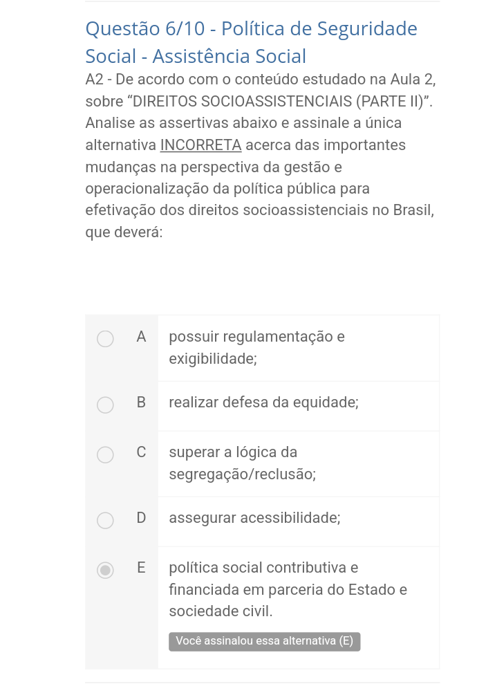 Questão 6/10 - Política de Seguridade Social - Assistência Social A2 - De acordo com o conteúdo estudado na Aula 2, sobre "DIREITOS SOCIOASSISTENCIAIS (PARTE II)". Analise as assertivas abaixo e assinale a única alternativa INCORRETA acerca das importantes mudanças na perspectiva da gestão e operacionalização da política pública para efetivação dos direitos socioassistenciais no Brasil, que deverá: A possuir regulamentação e exigibilidade; B realizar defesa da equidade; C superar a lógica da D assegurar acessibilidade; E política social contributiva e financiada em parceria do Estado e sociedade civil. Você assinalou essa alternativa (E)