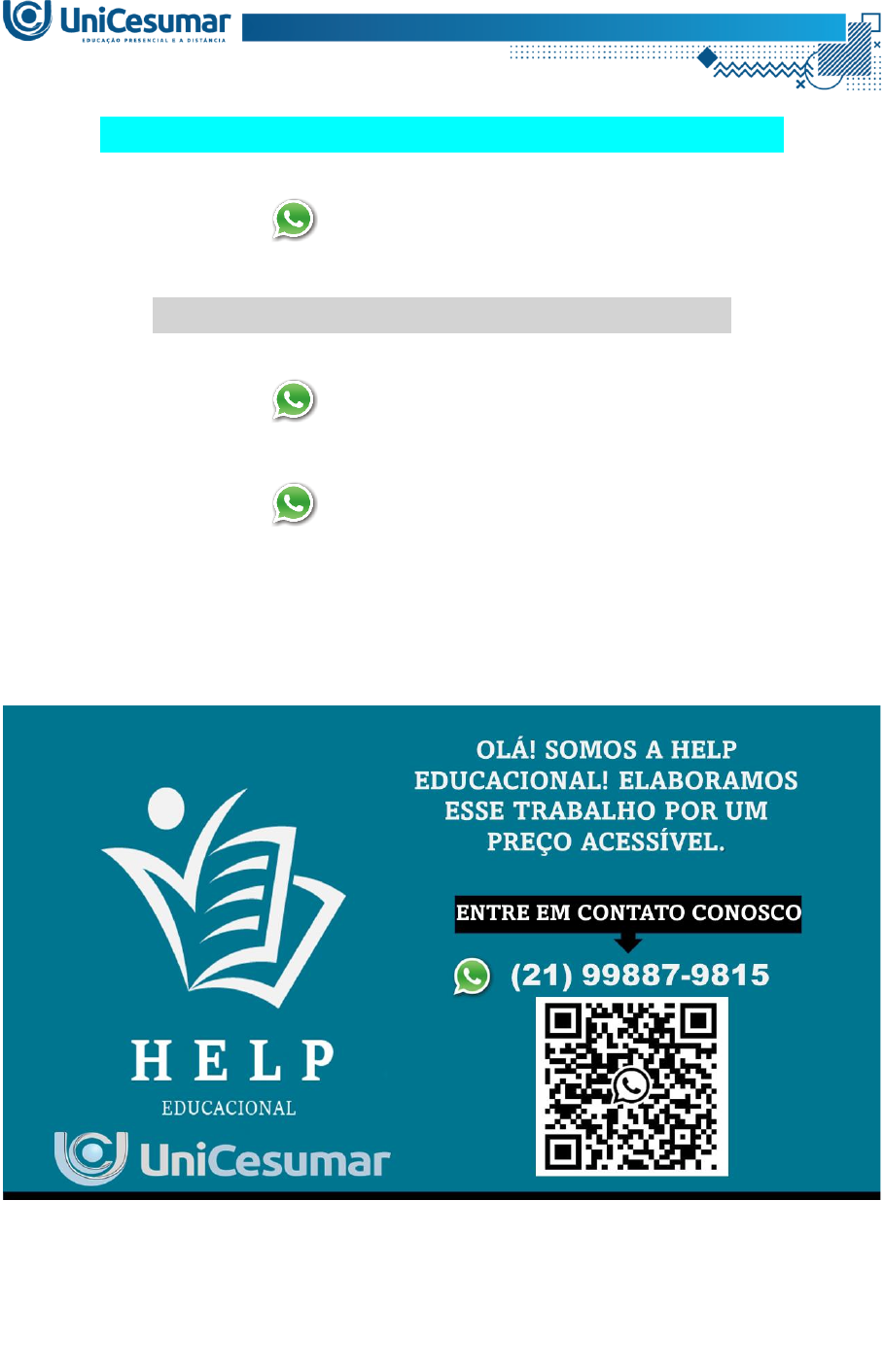 <p>MAPA – TEOL - TEOLOGIA BÍBLICA - 54_2024</p><p>(21) 99887-9815</p><p>ASSESSORIA NOS SEUS TRABALHOS</p><p>(21) 99887-9815</p><p>(21) 99887-9815</p><p>TEXTO 1</p><p>Assim, o primeiro vislumbre que temos do estilo de vida messiânico é o da cidadania coope-</p><p>rativa em prol do evangelho e de modo digno do evangelho. O testemunho do Messias Jesus</p><p>é o eixo ao redor do qual podemos construir o estilo de vida messiânico — dessa forma,</p><p>fazem pouco sentido as distinções classificatórias entre ética, espiritualidade e missão. No</p><p>estilo de vida messiânico, as três são componentes de uma e a mesma realidade: viver como</p><p>o Messias viveu!</p><p>Fonte: ZABATIERO, J. P. T. Teologia Bíblica. Reimp. 2024. Maringá: UniCesumar, p.124,</p><p>2016.</p><p>TEXTO 2</p><p>A unidade a ser desfrutada pelos discípulos de Cristo é baseada em mútua habitação: a mo-</p><p>rada do Espírito em cada um deles e sua morada em Deus - dependentes dele, confiando</p><p>nele, obedientes a ele, preservando o evangelho sagrado que lhes foi confiado e pelo qual</p><p>são salvos. Esses são, ao mesmo tempo, a experiência e o compromisso de todo verdadeiro</p><p>cristão.</p><p>Fonte; CARSON, D. A. O Discurso de Despedida e a Última Oração de Jesus. São Paulo:</p><p>Vida Nova, p. 184, 2019.</p><p>ENUNCIADO:</p><p>Vivemos em um período em que, cada vez mais, surgem diferentes comunidades de fé cristã</p><p>pelas cidades afora. Por um lado, isto pode representar o resultado exponencial do avanço</p><p>da pregação do Evangelho de Jesus em nossos dias por meio da plantação de novas igrejas.</p><p>Por outro, isto também pode significar cismas, divisões e/ou conflitos entre lideranças que,</p><p>ao discordarem de algo, deixam a igreja e fundam a sua própria comunidade</p><p>Seu trabalho, nesta atividade, será baseado na reflexão sobre a Oração Sacerdotal de Jesus</p><p>registrada no Evangelho de João, no capítulo 17. Nesta oração, Jesus pede ao Pai pela uni-</p><p>dade de seus discípulos — pelos que estavam ali com ele no Jardim do Getsêmani e por</p><p>aqueles que viriam a seguí-lo ao longo dos séculos vindouros.</p><p>COMANDO:</p><p>1. Leia o capítulo 17 do Evangelho de João em, pelo menos, 2 versões ou traduções diferen-</p><p>tes. Faça uma leitura comparada das versões, procurando os diferentes termos empregados</p><p>alteram o sentido da passagem.</p><p>2. Escolha uma das versões e transcreva a perícope de João 17.20-26 para o template padrão</p><p>da atividade.</p><p>3. Elabore um texto contendo entre 200 e 300 palavras respondendo à pergunta: como uma</p><p>busca empenhada pela unidade cristã pode auxiliar a Igreja na missão de transformar a so-</p><p>ciedade por meio do anúncio e prática do Evangelho?</p><p>4. Escolha três versículos da perícope de João 17.20-26 e faça um mapa mental apontando</p><p>as principais ideias e significados destes versículos.</p><p>COMPOSIÇÃO DO TRABALHO/NOTAS</p><p>Parte 1 (1,0): Transcrição do texto de João 17 (todo o capítulo).</p><p>Parte 2 (2,0): Texto desenvolvendo uma resposta para a questão do item 3.</p><p>Parte 3 (2,0): Mapa mental com as ideias principais de 3 versículos da perícope.</p><p>ORIENTAÇÕES:</p><p>- O trabalho deverá ser desenvolvido e entregue no template padrão disponível em ‘material</p><p>da disciplina.</p><p>- A parte 2 deverá ser um texto de 200 até 300 palavras. O texto deverá ser escrito no template</p><p>padrão.</p><p>- O Mapa Mental deverá ser feito à mão OBRIGATORIAMENTE e em folha SULFITE</p><p>BRANCA tamanho A4. Você deverá escanear/digitalizar a folha e anexar como imagem no</p><p>local indicado no template da atividade.</p><p>- O campo de envio de arquivos da atividade só aceita o envio de um arquivo, por isso, você</p><p>deverá escanear o seu mapa mental, salvá-lo como IMAGEM (JPG ou PNG) e inseri-lo no</p><p>template padrão (Arquivo Word).</p><p>- Seu mapa mental deverá ser organizado na orientação de ‘paisagem’ (horizontal | ’deitada’)</p><p>da folha. Seja criativo, use canetas coloridas, escreva com letra legível e outros recursos que</p><p>ajudem a fazer um mapa mental bonito, atrativo e com tamanho adequado à leitura. Ativida-</p><p>des indecifráveis serão invalidadas</p><p>- Escreva seu nome e R.A no canto inferior direito da folha sulfite em que você desenvolver</p><p>o seu Mapa Mental.</p><p>- Redija seu texto de forma acadêmica. Utilize linguagem adequada e se atente aos erros de</p><p>digitação.</p><p>- Se usar citações, indique as referências corretamente, conforme as normas da ABNT.</p><p>- Assista ao vídeo de orientação na ‘sala do café’. Se tiver dúvidas, entre em contato com o</p><p>professor mediador.</p><p>- Atividades geradas por meio de Inteligência Artificial serão identificadas e invalidadas!</p><p>OLÁ! SOMOS A HELP EDUCACIONAL!</p><p>ELABORAMOS ESSE TRABALHO POR UM PREÇO</p><p>ACESSÍVEL.</p><p>ENTRE EM CONTATO CONOSCO</p><p>(21) 99887-9815</p>