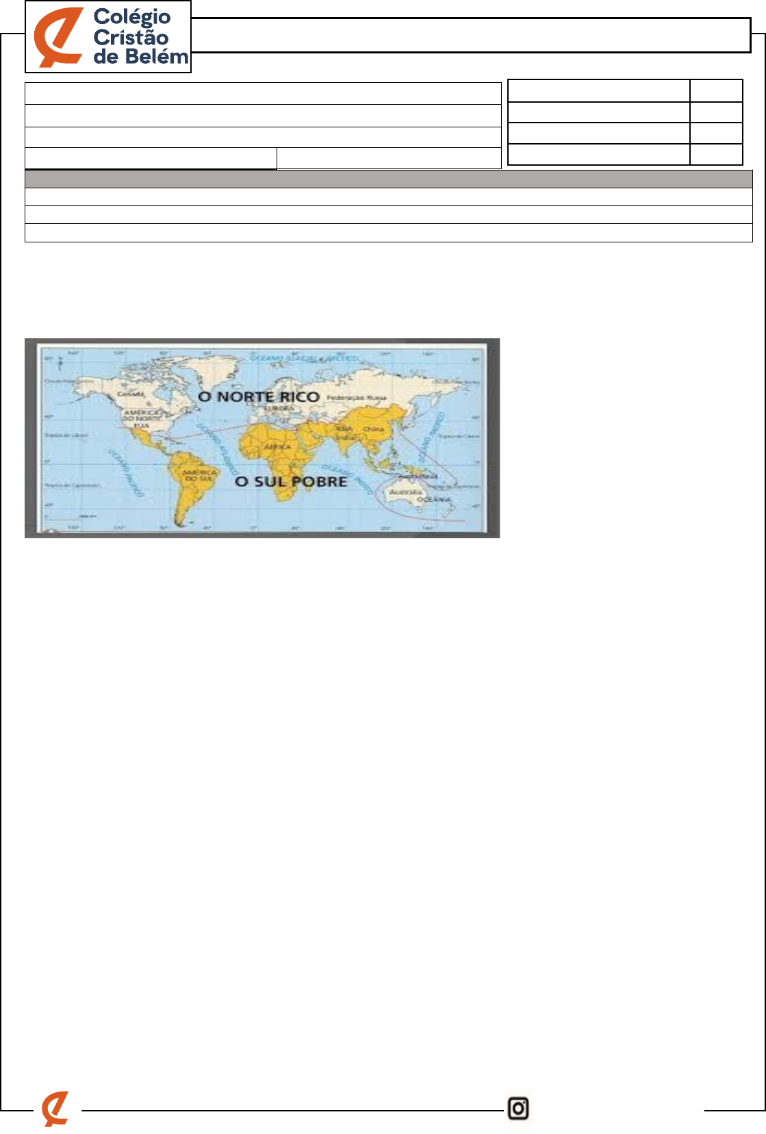 <p>2ª AVALIAÇÃO BIMESTRAL</p><p>Disciplina: Geografia</p><p>Professor (a): Mário Jorge</p><p>Aluno (a):</p><p>Série: 8° ano</p><p>Data: / /</p><p>Critérios avaliativos</p><p>INSTRUÇÕES</p><p>· Não rasure sua prova, questões rasuradas não serão aceitas;</p><p>· A prova deverá ser respondida com caneta azul ou preta, não serão aceitas respostas a lápis;</p><p>· O tempo disponível para esta prova é de 1 h e 40 minutos.</p><p>Recuperação Geografia</p><p>1- Os países subdesenvolvidos industrializados ou em desenvolvimento são países pobres que dispõem de um padrão de vida entre baixo e médio, com uma base industrial em desenvolvimento. É um exemplo de nação que faz parte do grupo em questão.</p><p>a) França</p><p>b) México.</p><p>c) Inglaterra.</p><p>d) Noruega.</p><p>4- O continente americano destaca-se por sua grande extensão no sentido norte-sul e pela variedade de solos, climas e formações vegetais.</p><p>Dentro do conjunto de características que compõem o continente americano é possível concluir que:</p><p>a) é considerado o maior continente do mundo, com uma área de 42.209.248 km²,</p><p>b) as terras americanas estão localizadas completamente no Hemisfério Ocidental.</p><p>c) o continente americano é cortado unicamente pelo Equador e pelo Trópico de Capricórnio.</p><p>d) entre as três Américas, a maior delas é a América Central com 55% da superfície total.</p><p>5- A proporção entre a população e a superfície territorial é um dos elementos que define a relação entre sociedade e espaço. Observe os dados informados abaixo:</p><p>De acordo com a tabela, o país mais povoado é a:</p><p>a) China.</p><p>b) França.</p><p>c) Holanda.</p><p>d) Índia</p><p>e) Argentina</p><p>6- 0 socialismo é um sistema de organização econômico e social, hoje presente em poucos países. A proposta desse sistema é a construção de uma sociedade sem classes e sem desigualdades. Para atingir esse fim, o socialismo defende a extinção da propriedade privada dos meios de produção.</p><p>Nas experiências socialistas existentes até hoje foram observadas características como:</p><p>a) economia planificada.</p><p>b) economia de mercado.</p><p>c) elevados índices de desemprego.</p><p>d) privatizações.</p><p>7- Você está fazendo uma pesquisa sobre a globalização e lê a seguinte passagem em um livro:</p><p>A SOCIEDADE GLOBAL</p><p>As pessoas se alimentam, se vestem, moram, se comunicam, se divertem, por meio de bens e serviços mundiais, utilizando mercadorias produzidas pelo capitalismo mundial, globalizado.</p><p>Suponhamos que você vá com seus amigos comer Big Mac e tomar Coca-Cola no McDonald's. Em seguida, assiste a um filme de Steven Spielberg e volta para casa num ônibus de marca Mercedes.</p><p>Ao chegar em casa, liga seu aparelho de TV Philips para ver o videoclipe de Michael Jackson e, em seguida, deve ouvir um CD do grupo Simply Red, gravado pela BMG Ariola Discos em seu equipamento AIWA.</p><p>Veja quantas empresas transnacionais estiveram presentes nesse seu curto programa de algumas horas.</p><p>Praxedes et alli, 1997. O Mercosul. SP, Ed. São Paulo: Atica, 1997. (adaptada)</p><p>Com base no texto e em seus conhecimentos de geografia, podemos entender:</p><p>a) que o capitalismo globalizado está eliminando as particularidades culturais dos povos da terra.</p><p>b) que a cultura, transmitida por empresas transnacionais, tornou-se um fenômeno criador das novas nações.</p><p>c) que a globalização do capitalismo neutralizou o surgimento de movimentos nacionalistas de forte cunho cultural e divisionista.</p><p>d) que o capitalismo globalizado atinge apenas a Europa e a América do Norte.</p><p>8- Com 325,7 milhões (dados de 2017), os Estados Unidos possuem a terceira maior população do planeta, superados apenas pela China e pela Índia. O crescimento vegetativo do país apresenta números positivos, o que não é muito comum entre as nações mais desenvolvidas.</p><p>O crescimento vegetativo estadunidense ainda alcança números não tão baixos por conta:</p><p>a) das políticas de incentivo à natalidade efetuadas pelo governo.</p><p>b) do intenso fluxo migratório vindo principalmente do México e da América Central.</p><p>c) do atual papel da mulher no mercado de trabalho.</p><p>d) da popularização cada vez maior dos métodos contraceptivos.</p><p>8- A produção agropecuária efetuada no continente americano é bastante diversificada, variando muito de país para país e também por conta das condições climáticas. Acerca das características que possui a agricultura efetuada na América Anglo-Saxônica podemos citar:</p><p>a) o baixo grau de mecanização.</p><p>b) a grande quantidade de trabalhadores rurais.</p><p>c) que é uma das mais desenvolvidas do mundo.</p><p>d) a baixa produtividade</p><p>9- Os 45 anos que vão do lançamento das bombas atômicas até o fim da União Soviética não foram um período homogêneo único na história do mundo. [...] Dividem-se em duas metades, tendo como divisor de águas o início da década de 1970. Apesar disso, a história desse período foi reunida sob um padrão único pela situação internacional peculiar que o dominou até a queda da União Soviética.</p><p>HOBSBAWM, Eric J. A era dos extremos. São Paulo: Companhia das Letras, 1996.</p><p>O período citado no texto e conhecido por Guerra Fria pode ser definido como aquele momento histórico em que houve</p><p>a) constante confronto das duas superpotências que emergiram da Segunda Guerra Mundial.</p><p>b) domínio dos países socialistas do Sul do globo pelos países capitalistas do Norte.</p><p>c) choque ideológico entre a Alemanha Nazista/União Soviética Stalinista durante os anos 1930.</p><p>d) disputa pela supremacia da economia mundial entre o Ocidente e as potências orientais, como a China e o Japão.</p><p>10- Países desenvolvidos também são denominados países centrais ou países do Norte; e