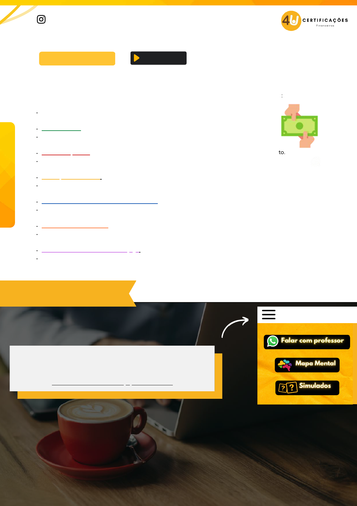<p>01</p><p>Para escolher dentre os diferentes tipos de planos, preliminarmente o consumidor terá que ter em mente o tipo</p><p>de cobertura que deseja contratar, ou seja, cobertura por morte, invalidez ou sobrevivência. Veja os possíveis</p><p>tipos de plano/benefício que podem ser ofertados. Na fase de benefícios o risco é da seguradora:</p><p>Resgate total ou parcial: Respeitando prazo de carência do plano</p><p>Renda Vitalícia: Recebe renda até o último dia de vida (risco da seguradora).</p><p>Falecimento: Cessa com falecimento (risco do titular). Dinheiro fica para seguradora.</p><p>Renda Temporária: O titular estabelece, junto a administradora um prazo para o recebimento.</p><p>Falecimento: Cessa com falecimento do participante ou fim do tempo contratado.</p><p>Renda por Prazo Certo: Renda paga por um prazo pré-estabelecido.</p><p>Falecimento: Se antes do prazo, os beneficiários recebem a renda até completar o prazo</p><p>Renda Vitalícia com Prazo Mínimo Garantido: Recebe a renda até seu último dia de vida.</p><p>Falecimento: beneficiários dão continuidade até se completar o prazo mínimo.</p><p>Renda Vitalícia Reversível: Renda paga vitaliciamente ao participante.</p><p>Falecimento: Uma % será revertido vitaliciamente ao beneficiário indicado</p><p>Renda Vitalícia Reversível ao Cônjuge com continuidade aos menores: Renda paga vitaliciamente.</p><p>Falecimento: Repassado ao cônjuge. Na falta, aos menores</p><p>www.4ucertifica.com.br</p><p>M</p><p>ód</p><p>ul</p><p>o</p><p>6</p><p>-</p><p>CP</p><p>A2</p><p>0</p><p>4u.certifica</p><p>Fase de Benefícios</p><p>01www.4ucertifica.com.br</p><p>01www.4ucertifica.com.br</p><p>Clique aqui</p><p>Clique aqui</p><p>Clique aqui</p><p>O que você precisa?</p><p>Chegamos no final do do MÓDULO 6! É hora de</p><p>fazermos nossas anotações, tirarmos as dúvidas</p><p>com o professor e exercitarmos com os simulados!</p><p>Selecione uma das opções ao lado.</p><p>FIM DE MÓDULO!</p><p>VOCÊ DEU MAIS UM PASSO!</p><p>Pausa para o cafézinho...</p><p>Assistir Aula</p><p>Clique acima</p>