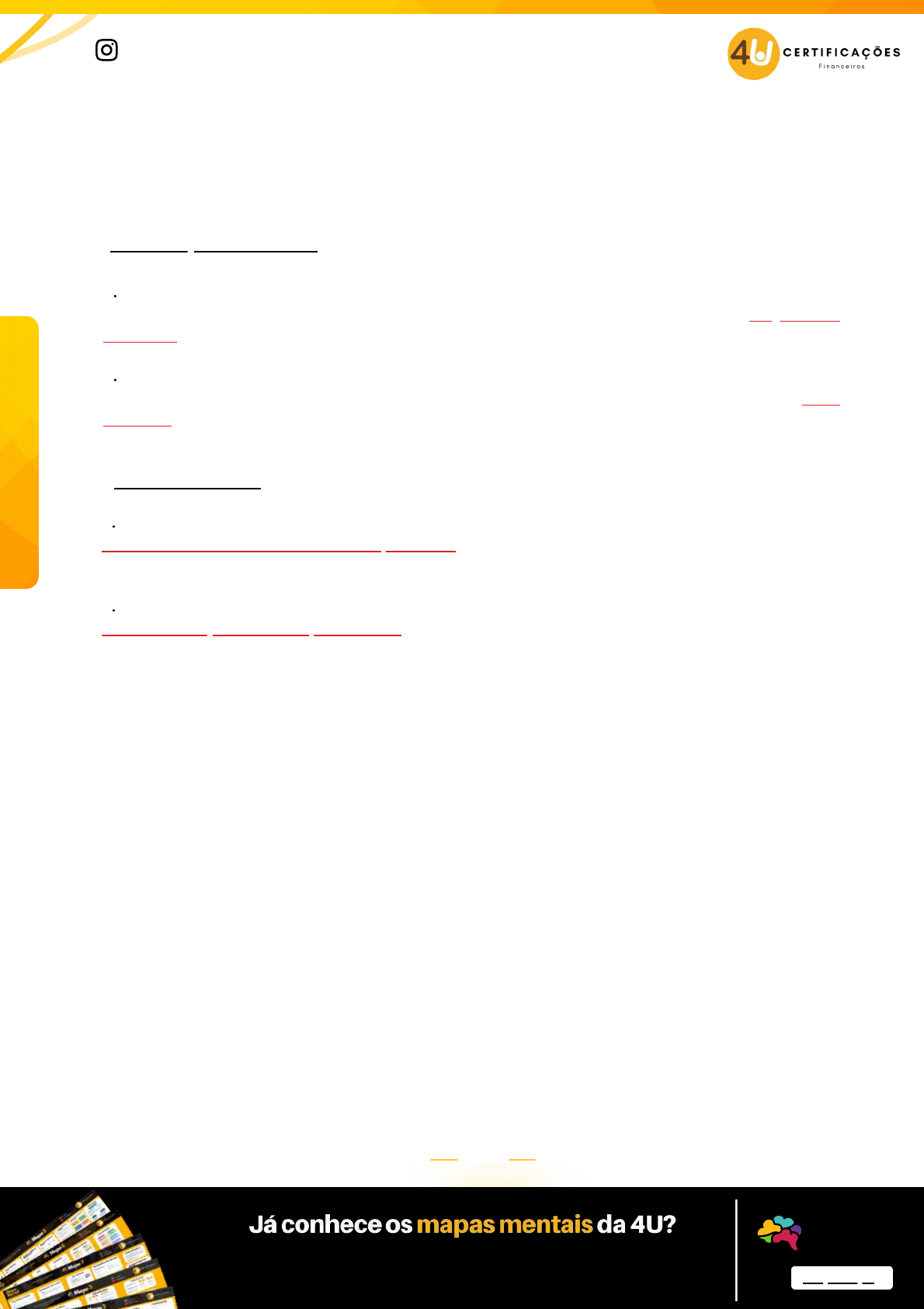 <p>159www.4ucertifica.com.br</p><p>M</p><p>ód</p><p>ul</p><p>o</p><p>6</p><p>-</p><p>CP</p><p>A2</p><p>0</p><p>4u.certifica</p><p>CURSO</p><p>Clique e saiba mais</p><p>Clique aqui</p><p>CURSOS COMPLETOS SIMULADOS</p><p>SIMULADOS</p><p>COMENTADOS</p><p>+ 1000 questões comentadas</p><p>+ Painel de desepenho</p><p>+ Questões reais de prova 2022 + SIMULADOS</p><p>COMENTADOS</p><p>CURSO</p><p>+SIMULADOS</p><p>COMENTADOS</p><p>CURSO</p><p>Clique e saiba mais</p><p>R$R$</p><p>/mês</p><p>Assinatura</p><p>R$R$</p><p>Até 12xAté 12x</p><p>/mês</p><p>/mês</p><p>R$R$</p><p>Até 12xAté 12x</p><p>SOU4U</p><p>Use o cupom!</p><p>Quero saber mais</p><p>Clique aqui</p><p>Compilamos todo o conteúdo necessário de CPA10, CPA20 e CEA para sua</p><p>prova em grandes mapas mentais, onde você consegue navegar por eles.</p><p>Mapas</p><p>Mentais 4U</p><p>Declaração no IR Anual</p><p>PGBL (saldo do plano)</p><p>As contribuições efetuadas no ano, devem ser declaradas em um campo específico na ficha "Pagamentos</p><p>efetuados", reduzindo a base tributária em até 12% da Renda Bruta.</p><p>VGBL(saldo do plano)</p><p>Deve ser declarado somente o principal depositado, a soma das contribuições sem rendimentos, como "Bens</p><p>e Direitos"</p><p>Contribuições Realizadas</p><p>TABELA PROGRESSIVA (resgate ou renda)</p><p>Rendimentos tributáveis recebidos de PJ pelo titular. Se for um PGBL considerar o valor total recebido, se for</p><p>um VGBL, somente os rendimentos.</p><p>TABELA REGRESSIVA (resgate ou renda)</p><p>Rendimentos sujeitos à tributação exclusiva. Se for um PGBL considerar o valor total recebido, se for um VGBL,</p><p>somente os rendimentos.</p><p>Valores Recebidos</p><p>Quando o contribuinte for realizar a sua Declaração de Imposto de Renda Anual, algumas regras devem ser</p><p>seguidas com relação as contribuições realizadas e valores recebidos:</p><p>Destinar recursos do 13º salário para planos de previdência pode ser uma ótima estratégia, especialmente</p><p>quando a intenção é aliar o investimento com um planejamento fiscal. O 13º salário é tributado pelo Imposto</p><p>de Renda exclusivamente na fonte, com base na tabela progressiva mensal, calculado de forma separada</p><p>dos demais rendimentos recebidos no mês pelo empregado. Isso significa que o valor do 13º salário não está</p><p>sujeito ao "ajuste" anual, ou seja, não deve ser considerado para fins de determinação do IR devido na</p><p>Declaração de Ajuste Anual da pessoa física.</p><p>Além disso, a legislação fiscal permite algumas deduções na apuração da base de cálculo do IR devido sobre</p><p>o 13º salário, dentre as quais se destacam as contribuições para entidades de previdência privada</p><p>domiciliadas no país, cujo ônus tenha sido suportado pelo empregado. Assim, as contribuições para planos de</p><p>previdência privada, como o PGBL, efetuadas com recursos do 13º salário poderão ser totalmente deduzidas</p><p>do IR devido sobre o 13º.</p><p>Na prática, ainda que a pessoa física já tenha efetuado contribuições para um PGBL no limite de 12% da</p><p>renda tributável anual, ainda assim poderá destinar os recursos do 13º salário para o plano de previdência e</p><p>se beneficiar pela dedução do IR. Em tempos de carga tributária nas alturas, essa é uma forma legal de a</p><p>pessoa física se beneficiar ainda mais do vantajoso regime tributário aplicável aos planos de previdência.</p><p>Este investimento pode zerar o Imposto de Renda do 13º salário</p>