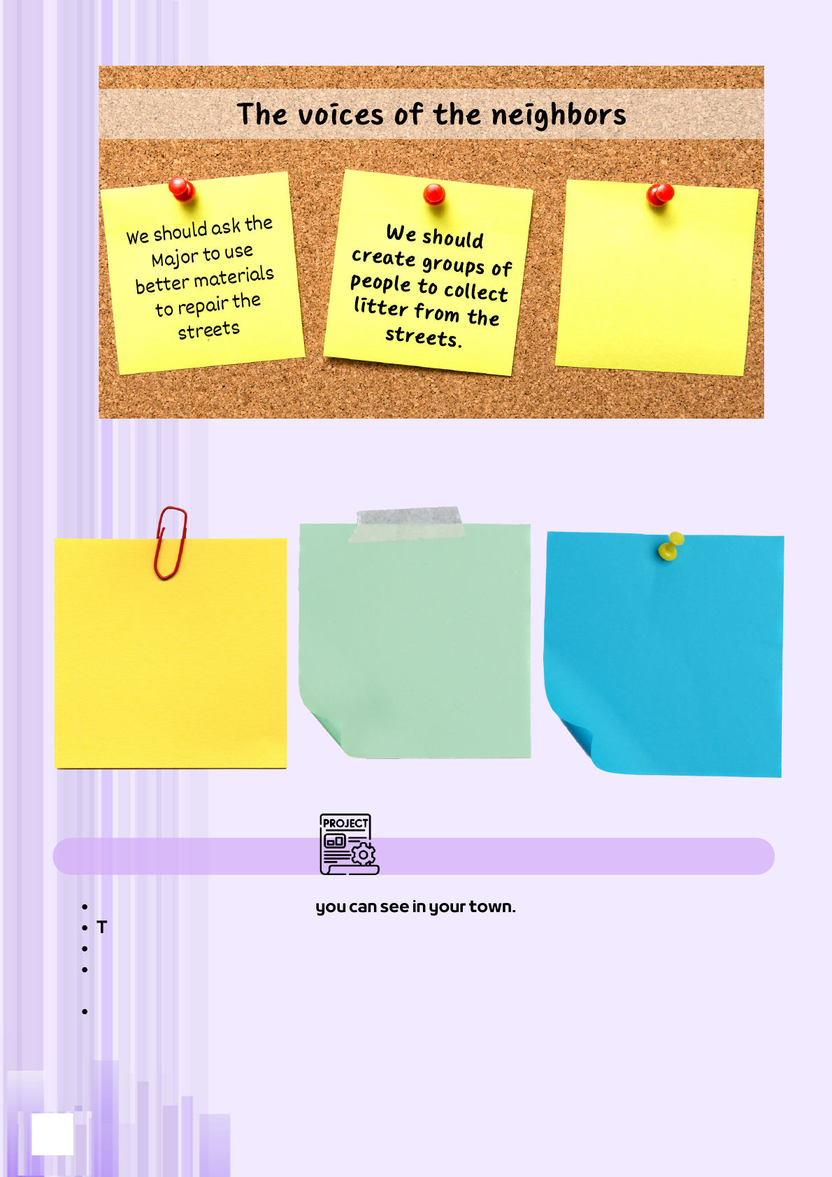 <p>40</p><p>We should ask the</p><p>Major to use</p><p>better materials</p><p>to repair the</p><p>streets.</p><p>We should</p><p>remove the loose</p><p>or destroyed</p><p>parts of the</p><p>sidewalks.</p><p>We should</p><p>create groups ofpeople to collect</p><p>litter from the</p><p>streets.</p><p>We should ask the</p><p>Major to use</p><p>better materials</p><p>to repair the</p><p>streets.</p><p>The voices of the neighbors</p><p>What other solutions can you think of?</p><p>Think of possible problems you can see in your town.</p><p>Think of possible solutions for those problems.</p><p>What attractions should you include in your town? What services should be offered?</p><p>Is traffic a problem in your city? What changes should be done?</p><p>Present your project to the class and enjoy it!</p><p>Mini project: My ideal town</p>
