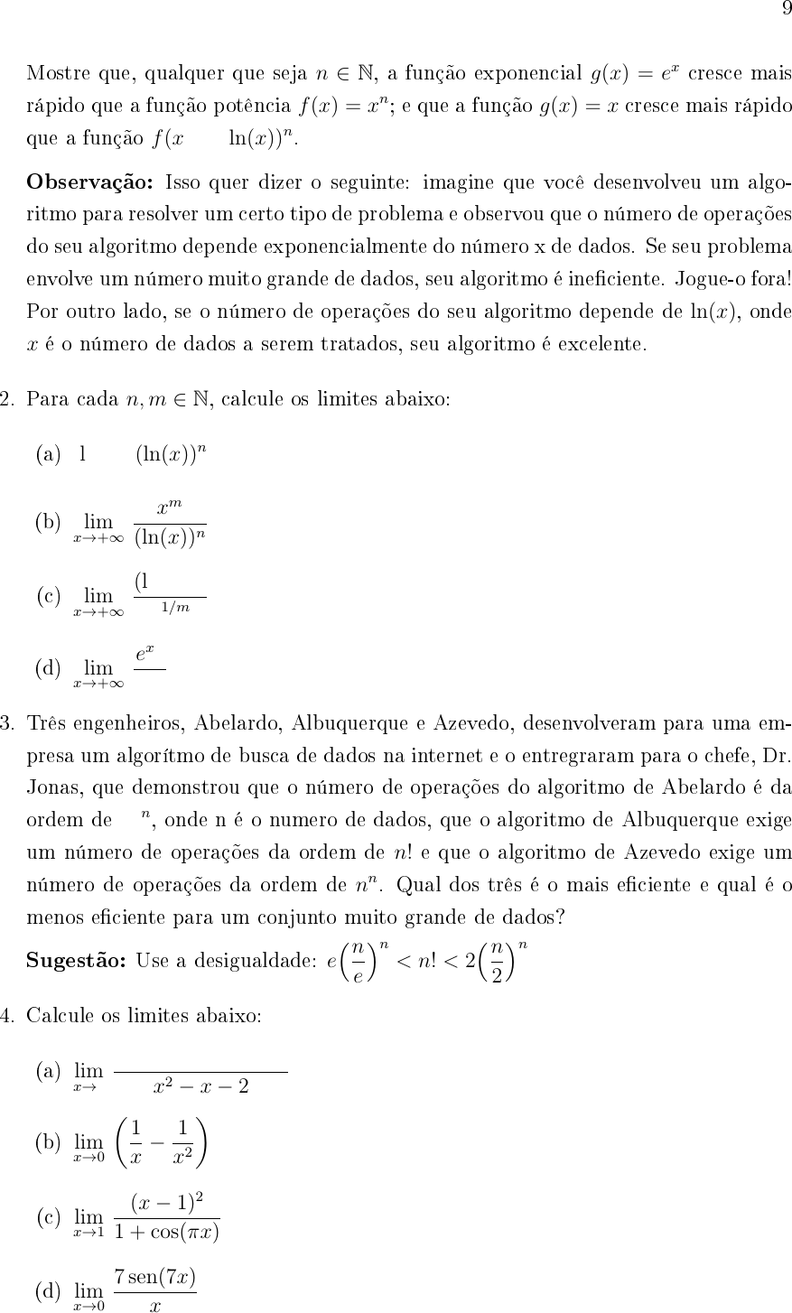 <p>9</p><p>Mostre que, qualquer que seja n ∈ N, a função exponencial g(x) = ex cresce mais</p><p>rápido que a função potência f(x) = xn; e que a função g(x) = x cresce mais rápido</p><p>que a função f(x) = (ln(x))n.</p><p>Observação: Isso quer dizer o seguinte: imagine que você desenvolveu um algo-</p><p>ritmo para resolver um certo tipo de problema e observou que o número de operações</p><p>do seu algoritmo depende exponencialmente do número x de dados. Se seu problema</p><p>envolve um número muito grande de dados, seu algoritmo é ine�ciente. Jogue-o fora!</p><p>Por outro lado, se o número de operações do seu algoritmo depende de ln(x), onde</p><p>x é o número de dados a serem tratados, seu algoritmo é excelente.</p><p>2. Para cada n,m ∈ N, calcule os limites abaixo:</p><p>(a) lim</p><p>x→0+</p><p>x(ln(x))n</p><p>(b) lim</p><p>x→+∞</p><p>xm</p><p>(ln(x))n</p><p>(c) lim</p><p>x→+∞</p><p>(ln(x))n</p><p>x1/m</p><p>(d) lim</p><p>x→+∞</p><p>ex</p><p>n</p><p>emx</p><p>3. Três engenheiros, Abelardo, Albuquerque e Azevedo, desenvolveram para uma em-</p><p>presa um algorítmo de busca de dados na internet e o entregraram para o chefe, Dr.</p><p>Jonas, que demonstrou que o número de operações do algoritmo de Abelardo é da</p><p>ordem de 10n, onde n é o numero de dados, que o algoritmo de Albuquerque exige</p><p>um número de operações da ordem de n! e que o algoritmo de Azevedo exige um</p><p>número de operações da ordem de nn. Qual dos três é o mais e�ciente e qual é o</p><p>menos e�ciente para um conjunto muito grande de dados?</p><p>Sugestão: Use a desigualdade: e</p><p>(n</p><p>e</p><p>)n</p>