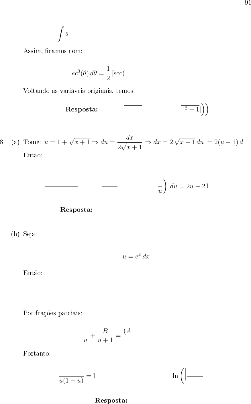 <p>91</p><p>∫</p><p>sec3(θ) dθ =</p><p>1</p><p>2</p><p>[tg(θ) sec(θ) + ln(tg(θ) + sec(θ))] + C</p><p>Assim, �camos com:</p><p>∫</p><p>sec3(θ) dθ =</p><p>1</p><p>2</p><p>[sec(θ) tg(θ)− ln (| sec(θ) + tg(θ)|)]</p><p>Voltando as variáveis originais, temos:</p><p>Resposta:</p><p>1</p><p>2</p><p>(</p><p>x</p><p>√</p><p>x2 − 1− ln</p><p>(</p><p>|x+</p><p>√</p><p>x2 − 1|</p><p>))</p><p>8. (a) Tome: u = 1 +</p><p>√</p><p>x+ 1⇒ du =</p><p>dx</p><p>2</p><p>√</p><p>x+ 1</p><p>⇒ dx = 2</p><p>√</p><p>x+ 1 du = 2(u− 1) du</p><p>Então:</p><p>∫</p><p>dx</p><p>1 +</p><p>√</p><p>x+ 1</p><p>= 2</p><p>∫</p><p>u− 1</p><p>u</p><p>= 2</p><p>∫ (</p><p>1− 1</p><p>u</p><p>)</p><p>du = 2u− 2 ln(|u|) + C</p><p>Resposta: 2(1 +</p><p>√</p><p>x+ 1)− ln</p><p>(</p><p>(1 +</p><p>√</p><p>x+ 1)2</p><p>)</p><p>+ C</p><p>(b) Seja:</p><p>u = ex ⇒ du = ex dx⇒ dx =</p><p>du</p><p>u</p><p>Então:</p><p>∫</p><p>dx</p><p>1 + ex</p><p>=</p><p>∫</p><p>du</p><p>u(u+ 1)</p><p>=</p><p>∫</p><p>du</p><p>u2 + u</p><p>Por frações parciais:</p><p>1</p><p>u(u+ 1)</p><p>=</p><p>A</p><p>u</p><p>+</p><p>B</p><p>u+ 1</p><p>=</p><p>(A+B)u + A</p><p>u(u+ 1)</p><p>⇐⇒ A = 1, B = −1</p><p>Portanto:</p><p>∫</p><p>du</p><p>u(1 + u)</p><p>= ln(|u|)− ln(|u+ 1|) + C = ln</p><p>(∣∣∣∣ u</p><p>u+ 1</p><p>∣∣∣∣)+ C</p><p>Resposta: ln</p><p>(</p><p>ex</p><p>ex + 1</p><p>)</p><p>+ C</p>