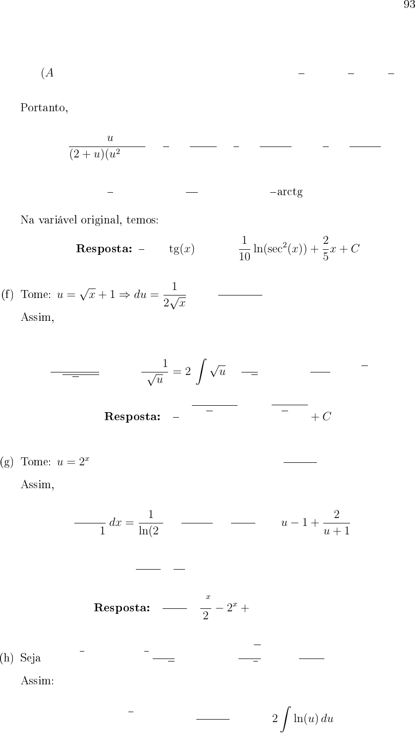 <p>93</p><p>(A+B)u2 + (2B + C)u+ (2C + A) ≡ 1⇐⇒ A =</p><p>1</p><p>5</p><p>, B = −1</p><p>5</p><p>, C =</p><p>2</p><p>5</p><p>Portanto,∫</p><p>du</p><p>(2 + u)(u2 + 1)</p><p>=</p><p>1</p><p>5</p><p>∫</p><p>du</p><p>2 + u</p><p>− 1</p><p>5</p><p>∫</p><p>u</p><p>u2 + 1</p><p>du+</p><p>2</p><p>5</p><p>∫</p><p>du</p><p>u2 + 1</p><p>=</p><p>1</p><p>5</p><p>ln (|u+ 2|)− 1</p><p>10</p><p>ln</p><p>(</p><p>u2 + 1</p><p>)</p><p>+</p><p>2</p><p>5</p><p>arctg(u) + C</p><p>Na variável original, temos:</p><p>Resposta:</p><p>1</p><p>5</p><p>ln (| tg(x) + 2|)− 1</p><p>10</p><p>ln(sec2(x)) +</p><p>2</p><p>5</p><p>x+ C</p><p>(f) Tome: u =</p><p>√</p><p>x+ 1⇒ du =</p><p>1</p><p>2</p><p>√</p><p>x</p><p>dx =</p><p>dx</p><p>2 (u− 1)</p><p>⇒ dx = 2 (u− 1) du</p><p>Assim,</p><p>∫</p><p>dx√√</p><p>x+ 1</p><p>= 2</p><p>∫</p><p>u− 1√</p><p>u</p><p>= 2</p><p>∫ √</p><p>u− 1√</p><p>u</p><p>du = 2</p><p>(</p><p>u3/2</p><p>3</p><p>− 2</p><p>√</p><p>u</p><p>)</p><p>+ C</p><p>Resposta:</p><p>4</p><p>3</p><p>√</p><p>(</p><p>√</p><p>x+ 1)− 4</p><p>√√</p><p>x+ 1 + C</p><p>(g) Tome: u = 2x du = ln(2) 2x dx = ln(2)u dx⇒ dx =</p><p>1</p><p>ln(2)u</p><p>du</p><p>Assim, ∫</p><p>4x + 1</p><p>2x + 1</p><p>dx =</p><p>1</p><p>ln(2)</p><p>∫</p><p>u2 + 1</p><p>u+ 1</p><p>=</p><p>1</p><p>ln(2)</p><p>∫ (</p><p>u− 1 +</p><p>2</p><p>u+ 1</p><p>)</p><p>du</p><p>=</p><p>1</p><p>ln(2)</p><p>(</p><p>u2</p><p>2</p><p>− u+ 2 ln(|u+ 1|)</p><p>)</p><p>+ C</p><p>Resposta:</p><p>1</p><p>ln(2)</p><p>(</p><p>4x</p><p>2</p><p>− 2x + 2 ln(2x + 1)</p><p>)</p><p>+ C</p><p>(h) Seja u = e</p><p>√</p><p>x ⇒ du = e</p><p>√</p><p>x 1</p><p>2</p><p>√</p><p>x</p><p>dx⇒ dx =</p><p>2</p><p>√</p><p>x</p><p>e</p><p>√</p><p>x</p><p>du = 2</p><p>ln(u)</p><p>u</p><p>du</p><p>Assim: ∫</p><p>e</p><p>√</p><p>x dx =</p><p>∫</p><p>u</p><p>(</p><p>2 ln(u)</p><p>u</p><p>)</p><p>du = 2</p><p>∫</p><p>ln(u) du</p>
