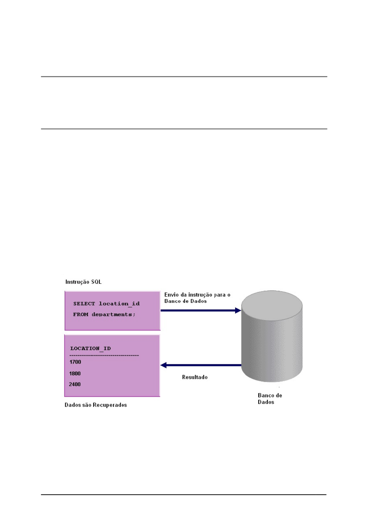 <p>7/9/2019 APOSTILA_BDI_2011</p><p>http://slidepdf.com/reader/full/apostilabdi2011 129/154</p><p>B A N C O D E D A D O S I F A T E C D E P R A I A G R A N D E</p><p>129</p><p>ANEXO A - OBJETO RELACIONAL</p><p>A IBM desenvolveu a versão original da SQL, chamada de Sequel, comoparte do projeto R no início da década de 1970. Esta linguagem evoluiu e seu</p><p>nome mudou para SQL (Structured Query Language).</p><p>SQL</p><p>A IBM desenvolveu a versão original da SQL, chamada de Sequel, como</p><p>parte do projeto R no início da década de 1970. Esta linguagem evoluiu e seu</p><p>nome mudou para SQL (Structured Query Language).</p><p>A SQL se estabeleceu como a linguagem padrão de banco de dados</p><p>relacional.</p><p>Em 1986, o American National Standards Institute (ANSI) e a International Organization for Standardization (ISO) publicaram um padrão SQL, chamado</p><p>SQL-86. Em 1989, o ANSI publicou um padrão estendido para a linguagem: a</p><p>SQL-89.</p><p>A próxima versão do padrão foi a SQL-92, seguida da SQL:1999; a versão</p><p>mais recente é a SQL:2003.</p><p>Muitos banco de dados aceitam a maioria do padrão SQL-92 e algumas das</p><p>novas construções do SQL:1999 e SQL:2003, embora atualmente nenhum</p><p>sistema de banco de dados aceite todas as novas construções. Também temos</p><p>alguns bancos de dados que não aceitam alguns recursos da SQL-92 e muitos</p><p>fornecem recursos não padronizados.</p><p>Figura 106 – Funcionamento do SGBD (extraído do curso Oracle)</p><p>Esta linguagem é dividida em partes:</p><p>o LINGUAGEM DE DEFINIÇÃO DE DADOS (DDL), que fornece</p><p>comandos para definir esquemas de relação, excluir relação e modificar</p><p>esquemas. Comandos: CREATE, ALTER, DROP, RENAME, TRUNCATE e</p><p>COMMENT.</p><p>o LINGUAGEM DE MANIPULAÇÃO DE DADOS (DML): possui consultas</p><p>baseadas na álgebra relacional e no cálculo relacional de tupla. Possui</p>