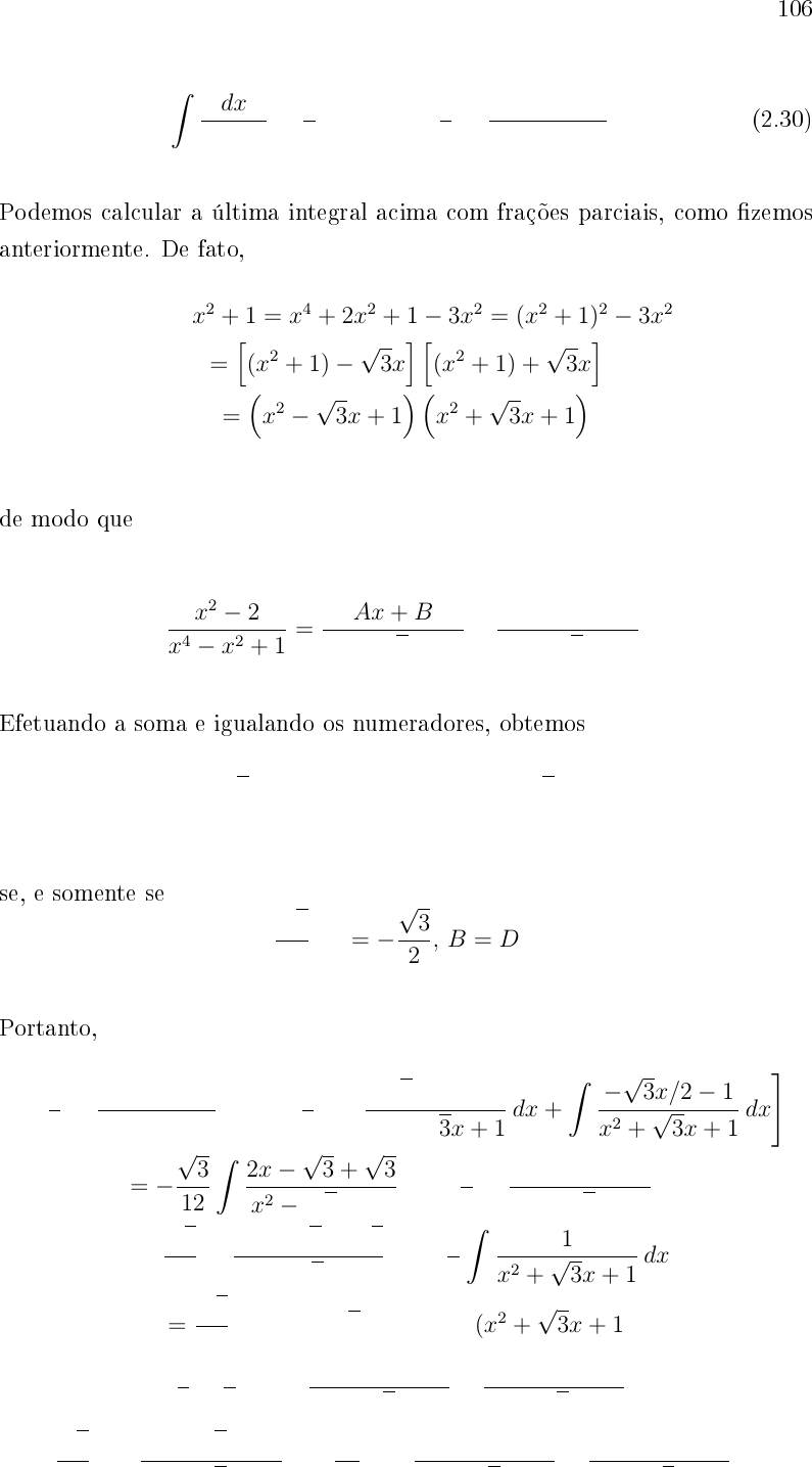 <p>106</p><p>∫</p><p>dx</p><p>x6 + 1</p><p>=</p><p>1</p><p>3</p><p>arctg(x)− 1</p><p>3</p><p>∫</p><p>x2 − 2</p><p>x4 − x2 + 1</p><p>dx. (2.30)</p><p>Podemos calcular a última integral acima com frações parciais, como �zemos</p><p>anteriormente. De fato,</p><p>x4 − x2 + 1 = x4 + 2x2 + 1− 3x2 = (x2 + 1)2 − 3x2</p><p>=</p><p>[</p><p>(x2 + 1)−</p><p>√</p><p>3x</p><p>] [</p><p>(x2 + 1) +</p><p>√</p><p>3x</p><p>]</p><p>=</p><p>(</p><p>x2 −</p><p>√</p><p>3x+ 1</p><p>)(</p><p>x2 +</p><p>√</p><p>3x+ 1</p><p>)</p><p>de modo que</p><p>x2 − 2</p><p>x4 − x2 + 1</p><p>=</p><p>Ax+B</p><p>x3 −</p><p>√</p><p>3x+ 1</p><p>+</p><p>Cx+D</p><p>x2 +</p><p>√</p><p>3x+ 1</p><p>.</p><p>Efetuando a soma e igualando os numeradores, obtemos</p><p>x2−2 = (A+C)x3+(</p><p>√</p><p>3(A−C)+B+D)+(A+C+</p><p>√</p><p>3(B−D))+B+D, ∀x ∈ R</p><p>se, e somente se</p><p>A =</p><p>√</p><p>3</p><p>2</p><p>, C = −</p><p>√</p><p>3</p><p>2</p><p>, B = D = −1.</p><p>Portanto,</p><p>−1</p><p>3</p><p>∫</p><p>x2 − 2</p><p>x4 − x2 + 1</p><p>dx = −1</p><p>3</p><p>[∫ √</p><p>3x/2− 1</p><p>x2 −</p><p>√</p><p>3x+ 1</p><p>dx+</p><p>∫ −</p><p>√</p><p>3x/2− 1</p><p>x2 +</p><p>√</p><p>3x+ 1</p><p>dx</p><p>]</p><p>= −</p><p>√</p><p>3</p><p>12</p><p>∫</p><p>2x−</p><p>√</p><p>3 +</p><p>√</p><p>3</p><p>x2 −</p><p>√</p><p>3x+ 1</p><p>dx+</p><p>1</p><p>3</p><p>∫</p><p>1</p><p>x2 −</p><p>√</p><p>3x+ 1</p><p>dx</p><p>+</p><p>√</p><p>3</p><p>12</p><p>∫</p><p>2x+</p><p>√</p><p>3−</p><p>√</p><p>3</p><p>x2 +</p><p>√</p><p>3x+ 1</p><p>dx+</p><p>1</p><p>3</p><p>∫</p><p>1</p><p>x2 +</p><p>√</p><p>3x+ 1</p><p>dx</p><p>=</p><p>√</p><p>3</p><p>12</p><p>[</p><p>ln(x2 −</p><p>√</p><p>3x+ 1)− ln(x2 +</p><p>√</p><p>3x+ 1)</p><p>]</p><p>+</p><p>(</p><p>1</p><p>3</p><p>− 1</p><p>4</p><p>)∫ (</p><p>1</p><p>x2 −</p><p>√</p><p>3x+ 1</p><p>+</p><p>1</p><p>x2 +</p><p>√</p><p>3x+ 1</p><p>)</p><p>dx</p><p>=</p><p>√</p><p>3</p><p>12</p><p>ln</p><p>(</p><p>x2 −</p><p>√</p><p>3x+ 1</p><p>x2 +</p><p>√</p><p>3x+ 1</p><p>)</p><p>+</p><p>1</p><p>12</p><p>∫ (</p><p>1</p><p>x2 −</p><p>√</p><p>3x+ 1</p><p>+</p><p>1</p><p>x2 +</p><p>√</p><p>3x+ 1</p><p>)</p><p>dx</p>
