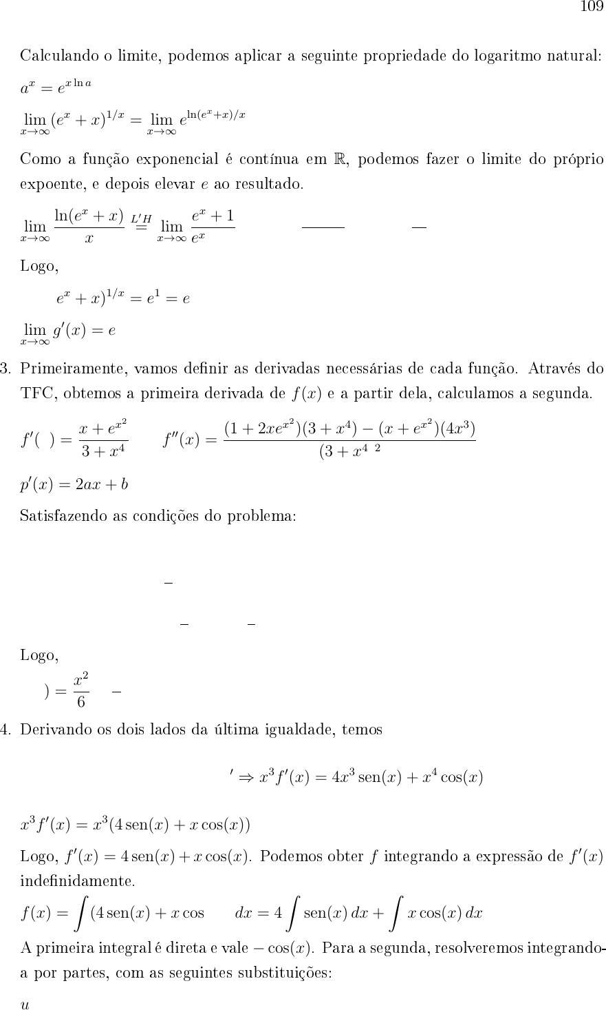 <p>109</p><p>Calculando o limite, podemos aplicar a seguinte propriedade do logaritmo natural:</p><p>ax = ex ln a</p><p>lim</p><p>x→∞</p><p>(ex + x)1/x = lim</p><p>x→∞</p><p>eln(ex+x)/x</p><p>Como a função exponencial é contínua em R, podemos fazer o limite do próprio</p><p>expoente, e depois elevar e ao resultado.</p><p>lim</p><p>x→∞</p><p>ln(ex + x)</p><p>x</p><p>L′H</p><p>= lim</p><p>x→∞</p><p>ex + 1</p><p>ex + x</p><p>L′H</p><p>= lim</p><p>x→∞</p><p>ex</p><p>ex + 1</p><p>L′H</p><p>= lim</p><p>x→∞</p><p>ex</p><p>ex</p><p>= 1</p><p>Logo,</p><p>lim</p><p>x→∞</p><p>(ex + x)1/x = e1 = e</p><p>lim</p><p>x→∞</p><p>g′(x) = e</p><p>3. Primeiramente, vamos de�nir as derivadas necessárias de cada função. Através do</p><p>TFC, obtemos a primeira derivada de f(x) e a partir dela, calculamos a segunda.</p><p>f ′(x) =</p><p>x+ ex</p><p>2</p><p>3 + x4</p><p>f ′′(x) =</p><p>(1 + 2xex</p><p>2</p><p>)(3 + x4)− (x+ ex</p><p>2</p><p>)(4x3)</p><p>(3 + x4)2</p><p>p′(x) = 2ax+ b p′′(x) = 2a</p><p>Satisfazendo as condições do problema:</p><p>p(0) = f(0)⇒ c = 4</p><p>p′(0) = f ′(0)⇒ b =</p><p>1</p><p>3</p><p>p′′(0) = f ′′(0)⇒ 2a =</p><p>1</p><p>3</p><p>⇒ a =</p><p>1</p><p>6</p><p>Logo,</p><p>p(x) =</p><p>x2</p><p>6</p><p>+</p><p>x</p><p>3</p><p>+ 4</p><p>4. Derivando os dois lados da última igualdade, temos x∫</p><p>0</p><p>t3f ′(t) dt</p><p>′ = (x4 sen(x))′ ⇒ x3f ′(x) = 4x3 sen(x) + x4 cos(x)</p><p>x3f ′(x) = x3(4 sen(x) + x cos(x))</p><p>Logo, f ′(x) = 4 sen(x) +x cos(x). Podemos obter f integrando a expressão de f ′(x)</p><p>inde�nidamente.</p><p>f(x) =</p><p>∫</p><p>(4 sen(x) + x cos(x)) dx = 4</p><p>∫</p><p>sen(x) dx+</p><p>∫</p><p>x cos(x) dx</p><p>A primeira integral é direta e vale− cos(x). Para a segunda, resolveremos integrando-</p><p>a por partes, com as seguintes substituições:</p><p>u = x⇒ du = dx</p>