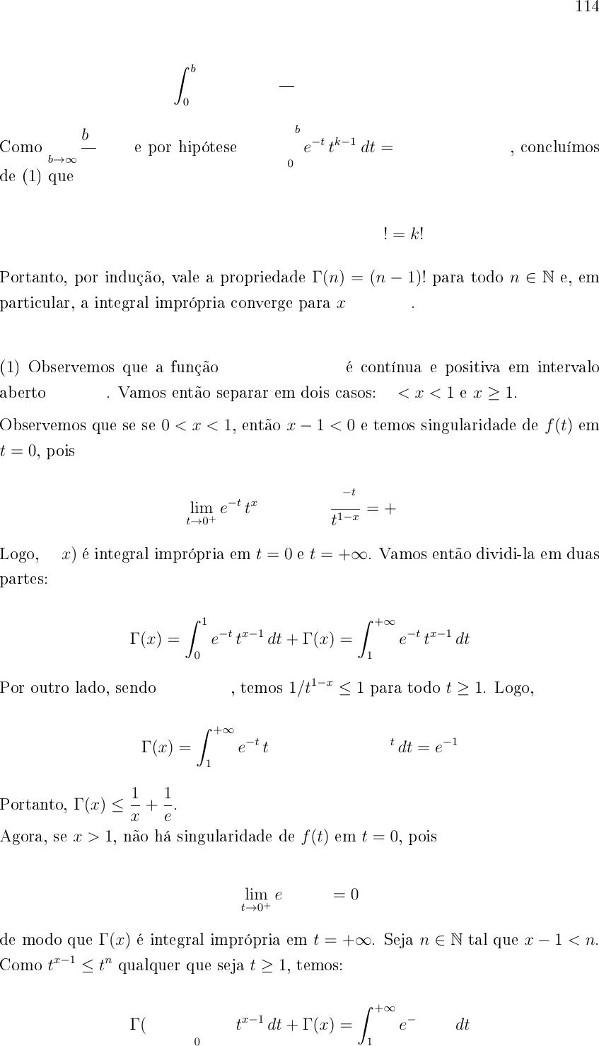 <p>114</p><p>∫ b</p><p>0</p><p>e−t tk dt =</p><p>bk</p><p>eb</p><p>+ k</p><p>∫ b</p><p>0</p><p>e−ttk−1 dt</p><p>Como lim</p><p>b→∞</p><p>bk</p><p>eb</p><p>= 0 e por hipótese lim</p><p>b→∞</p><p>∫ b</p><p>0</p><p>e−t tk−1 dt = Γ(k) = (k − 1)!, concluímos</p><p>de (1) que</p><p>Γ(k + 1) = kΓ(k) = k(k − 1)! = k!</p><p>Portanto, por indução, vale a propriedade Γ(n) = (n − 1)! para todo n ∈ N e, em</p><p>particular, a integral imprópria converge para x = n ∈ N.</p><p>(1) Observemos que a função f(t) = e−t tx−1 é contínua e positiva em intervalo</p><p>aberto ]0,+∞[. Vamos então separar em dois casos: 0 0, temos 1/t1−x ≤ 1 para todo t ≥ 1. Logo,</p><p>Γ(x) =</p><p>∫ +∞</p><p>1</p><p>e−t tx−1 dt ≤</p><p>∫ +∞</p><p>1</p><p>e−t dt = e−1</p><p>Portanto, Γ(x) ≤ 1</p><p>x</p><p>+</p><p>1</p><p>e</p><p>.</p><p>Agora, se x > 1, não há singularidade de f(t) em t = 0, pois</p><p>lim</p><p>t→0+</p><p>e−t tx−1 = 0</p><p>de modo que Γ(x) é integral imprópria em t = +∞. Seja n ∈ N tal que x− 1</p>
