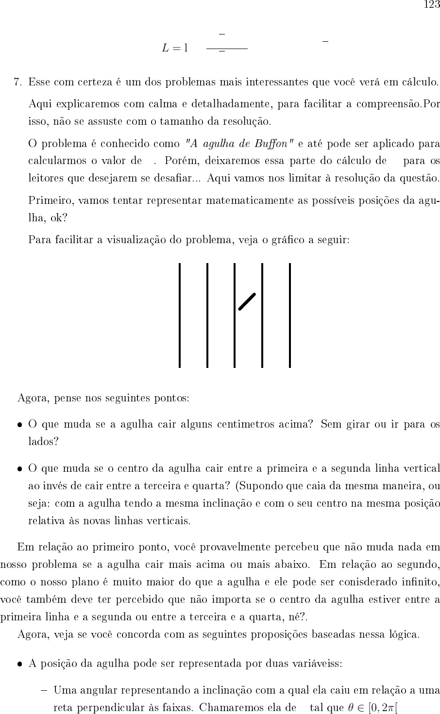 <p>123</p><p>L = ln</p><p>(</p><p>|</p><p>√</p><p>2 + 1|</p><p>|</p><p>√</p><p>2− 1|</p><p>)</p><p>= ln(3 + 2</p><p>√</p><p>2)</p><p>7. Esse com certeza é um dos problemas mais interessantes que você verá em cálculo.</p><p>Aqui explicaremos com calma e detalhadamente, para facilitar a compreensão.Por</p><p>isso, não se assuste com o tamanho da resolução.</p><p>O problema é conhecido como "A agulha de Bu�on" e até pode ser aplicado para</p><p>calcularmos o valor de π. Porém, deixaremos essa parte do cálculo de π para os</p><p>leitores que desejarem se desa�ar... Aqui vamos nos limitar à resolução da questão.</p><p>Primeiro, vamos tentar representar matematicamente as possíveis posições da agu-</p><p>lha, ok?</p><p>Para facilitar a visualização do problema, veja o grá�co a seguir:</p><p>Agora, pense nos seguintes pontos:</p><p>� O que muda se a agulha cair alguns centimetros acima? Sem girar ou ir para os</p><p>lados?</p><p>� O que muda se o centro da agulha cair entre a primeira e a segunda linha vertical</p><p>ao invés de cair entre a terceira e quarta? (Supondo que caia da mesma maneira, ou</p><p>seja: com a agulha tendo a mesma inclinação e com o seu centro na mesma posição</p><p>relativa às novas linhas verticais.</p><p>Em relação ao primeiro ponto, você provavelmente percebeu que não muda nada em</p><p>nosso problema se a agulha cair mais acima ou mais abaixo. Em relação ao segundo,</p><p>como o nosso plano é muito maior do que a agulha e ele pode ser conisderado in�nito,</p><p>você também deve ter percebido que não importa se o centro da agulha estiver entre a</p><p>primeira linha e a segunda ou entre a terceira e a quarta, né?.</p><p>Agora, veja se você concorda com as seguintes proposições baseadas nessa lógica.</p><p>� A posição da agulha pode ser representada por duas variáveiss:</p><p>� Uma angular representando a inclinação com a qual ela caiu em relação a uma</p><p>reta perpendicular às faixas. Chamaremos ela de θ tal que θ ∈ [0, 2π[</p>