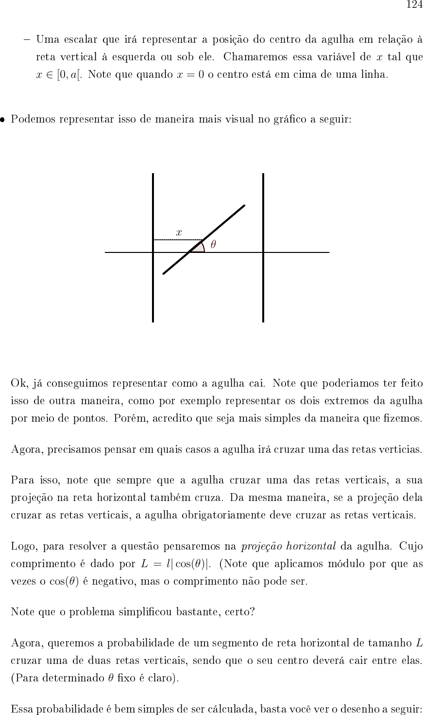 <p>124</p><p>� Uma escalar que irá representar a posição do centro da agulha em relação à</p><p>reta vertical à esquerda ou sob ele. Chamaremos essa variável de x tal que</p><p>x ∈ [0, a[. Note que quando x = 0 o centro está em cima de uma linha.</p><p>� Podemos representar isso de maneira mais visual no grá�co a seguir:</p><p>θ</p><p>x</p><p>Ok, já conseguimos representar como a agulha cai. Note que poderiamos ter feito</p><p>isso de outra maneira, como por exemplo representar os dois extremos da agulha</p><p>por meio de pontos. Porém, acredito que seja mais simples da maneira que �zemos.</p><p>Agora, precisamos pensar em quais casos a agulha irá cruzar uma das retas verticias.</p><p>Para isso, note que sempre que a agulha cruzar uma das retas verticais, a sua</p><p>projeção na reta horizontal também cruza. Da mesma maneira, se a projeção dela</p><p>cruzar as retas verticais, a agulha obrigatoriamente deve cruzar as retas verticais.</p><p>Logo, para resolver a questão pensaremos na projeção horizontal da agulha. Cujo</p><p>comprimento é dado por L = l| cos(θ)|. (Note que aplicamos módulo por que as</p><p>vezes o cos(θ) é negativo, mas o comprimento não pode ser.</p><p>Note que o problema simpli�cou bastante, certo?</p><p>Agora, queremos a probabilidade de um segmento de reta horizontal de tamanho L</p><p>cruzar uma de duas retas verticais, sendo que o seu centro deverá cair entre elas.</p><p>(Para determinado θ �xo é claro).</p><p>Essa probabilidade é bem simples de ser cálculada, basta você ver o desenho a seguir:</p>