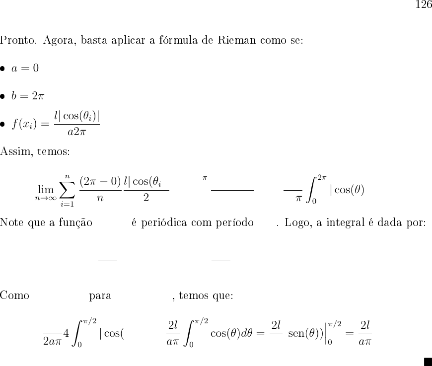 <p>126</p><p>Pronto. Agora, basta aplicar a fórmula de Rieman como se:</p><p>� a = 0</p><p>� b = 2π</p><p>� f(xi) =</p><p>l| cos(θi)|</p><p>a2π</p><p>Assim, temos:</p><p>lim</p><p>n→∞</p><p>n∑</p><p>i=1</p><p>(2π − 0)</p><p>n</p><p>l| cos(θi)|</p><p>a2π</p><p>=</p><p>∫ 2π</p><p>0</p><p>l| cos(θ)|</p><p>a2π</p><p>dθ =</p><p>l</p><p>2aπ</p><p>∫ 2π</p><p>0</p><p>| cos(θ)|dθ</p><p>Note que a função | cos θ| é periódica com período π/2. Logo, a integral é dada por:</p><p>l</p><p>2aπ</p><p>∫ 2π</p><p>0</p><p>| cos(θ)|dθ =</p><p>l</p><p>2aπ</p><p>4</p><p>∫ π/2</p><p>0</p><p>| cos(θ)|dθ</p><p>Como cos(θ) ≥ 0 para θ ∈ [0, π/2], temos que:</p><p>l</p><p>2aπ</p><p>4</p><p>∫ π/2</p><p>0</p><p>| cos(θ)|dθ =</p><p>2l</p><p>aπ</p><p>∫ π/2</p><p>0</p><p>cos(θ)dθ =</p><p>2l</p><p>aπ</p><p>(sen(θ))</p><p>∣∣∣π/2</p><p>0</p><p>=</p><p>2l</p><p>aπ</p><p>�</p>