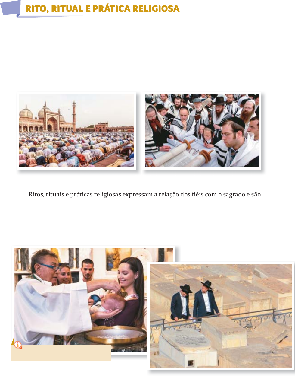 <p>RITO, RITUAL E PRÁTICA RELIGIOSA</p><p>considerados manifestações religiosas.</p><p>Muitas vezes, rito e ritual são usados como sinônimos. Mas podemos pensar da</p><p>seguinte maneira: o ritual é uma cerimônia especial (como a missa ou o culto) formada</p><p>por um conjunto de ritos, gestos e palavras próprios de cada religião.</p><p>| Prática religiosa do islamismo: leitura das escrituras e oração | Prática religiosa do judaísmo: leitura das escrituras e oração</p><p>©</p><p>Sh</p><p>ut</p><p>te</p><p>rs</p><p>to</p><p>ck</p><p>/S</p><p>au</p><p>vi</p><p>k</p><p>Ac</p><p>ha</p><p>ry</p><p>ya</p><p>©</p><p>Sh</p><p>ut</p><p>te</p><p>rs</p><p>to</p><p>ck</p><p>/M</p><p>ik</p><p>ha</p><p>il</p><p>©Shutterstock/Meunierd</p><p>©Shutterstock/Angelo Giampiccolo</p><p>O batismo católico e o enterro judaico são</p><p>exemplos de rituais religiosos.</p><p>orações, leituras e outras expressões.</p><p>Essas práticas religiosas revelam a relação do ser humano com o sagrado e englobam</p><p>seus participantes.</p><p>unido em torno de práticas de fé, ritos e rituais que são conhecidos e vivenciados pelos</p><p>um mesmo objetivo. As instituições religiosas pretendem manter um grupo de pessoas</p><p>o tempo todo. Práticas e crenças semelhantes podem aproximar as pessoas na busca por</p><p>Vivemos em sociedade e estamos em contato com as mais diversas culturas e religiões</p><p>partes que foram grifadas pelo professor. Bom estudo.</p><p>Leia todo o material disponibilizado e depois, anote em seu caderno as</p><p>Aula de Religião 027 - 6º anos - Data: 12/11/2020</p><p>Não precisa enviar</p><p>por e-mail.</p><p>Prof Cristiano</p><p>Destacar</p><p>Prof Cristiano</p><p>Destacar</p><p>Prof Cristiano</p><p>Destacar</p><p>Prof Cristiano</p><p>Destacar</p><p>Prof Cristiano</p><p>Destacar</p><p>Prof Cristiano</p><p>Destacar</p><p>Prof Cristiano</p><p>Destacar</p><p>Prof Cristiano</p><p>Destacar</p><p>Prof Cristiano</p><p>Destacar</p><p>Prof Cristiano</p><p>Destacar</p><p>Prof Cristiano</p><p>Destacar</p><p>Prof Cristiano</p><p>Destacar</p><p>Durante a cerimônia da missa, esse momento é relem-</p><p>brado por meio do rito da Eucaristia. Algumas religiões</p><p>evangélicas realizam a chamada Santa Ceia em homenagem</p><p>a esse momento. Além de relembrar um momento da vida de</p><p>LUCAS. In: BÍBLIA de Jerusalém. São Paulo: Paulus, 2002. Cap. 22, vers. 17-20.</p><p>Então, recebendo uma taça, deu graças e disse: “Tomai isto e reparti entre vós; pois</p><p>eu vos digo que doravante não beberei do fruto da videira até que venha o Reino de</p><p>Deus”. E tomou um pão, deu graças, partiu e deu-o a eles, dizendo: “Isto é o meu corpo</p><p>dado por vós. Fazei isto em minha memória”. E, depois de comer, fez o mesmo com a</p><p>taça, dizendo: “Esta taça é a Nova Aliança em meu sangue, que é derramado por vós”.</p><p>| Representação de alimentos</p><p>da Santa Ceia</p><p>| Eucaristia</p><p>Um mesmo texto religioso pode ser interpretado de</p><p>diversas maneiras e gerar diferentes ritos, de acordo com</p><p>cada religião.</p><p>©</p><p>Sh</p><p>ut</p><p>te</p><p>rs</p><p>to</p><p>ck</p><p>/S</p><p>hy</p><p>nt</p><p>ar</p><p>ta</p><p>ny</p><p>a</p><p>©</p><p>Sh</p><p>ut</p><p>te</p><p>rs</p><p>to</p><p>ck</p><p>/M</p><p>ag</p><p>da</p><p>le</p><p>na</p><p>K</p><p>uc</p><p>ov</p><p>a</p><p>doravante: a partir de agora.</p><p>Prof Cristiano</p><p>Destacar</p><p>Prof Cristiano</p><p>Destacar</p><p>Prof Cristiano</p><p>Destacar</p><p>Prof Cristiano</p><p>Destacar</p><p>Escola Municipal Irmã Filomena Rabelo</p><p>Diretora: Helga Feilstrecker</p><p>Orientadora: Vanda Falcheti Hofsteter</p><p>Professor: Cristiano</p><p>Disciplina:_________________________</p><p>Aluno(a):__________________________________________________ TURMA(ANO)_______</p><p>DATA:____/____/____</p><p>Atividade – copie e responda em seu caderno</p><p>1. Vimos que estamos em contato com diversas culturas e essas diversas culturas,</p><p>apresentam crenças que podem ser semelhantes e diferentes. Diante disso qual é o</p><p>papel que as instituições religiosas devem realizar?</p><p>__________________________________________________________________________</p><p>__________________________________________________________________________</p><p>__________________________________________________________________________</p><p>__________________________________________________________________________</p><p>__________________________________________________________________________</p><p>__________________________________________________________________________</p><p>__________________________________________________________________________</p><p>__________________________________________________________________________</p><p>2. O que é rito?</p><p>__________________________________________________________________________</p><p>__________________________________________________________________________</p><p>__________________________________________________________________________</p><p>__________________________________________________________________________</p><p>__________________________________________________________________________</p><p>3. O que é ritual?</p><p>__________________________________________________________________________</p><p>__________________________________________________________________________</p><p>__________________________________________________________________________</p><p>__________________________________________________________________________</p><p>__________________________________________________________________________</p><p>4. Explique a seguinte afirmação: “Um mesmo texto religioso pode ser interpretado de</p><p>diversas maneiras e gerar diferentes ritos.”</p><p>__________________________________________________________________________</p><p>__________________________________________________________________________</p><p>______________