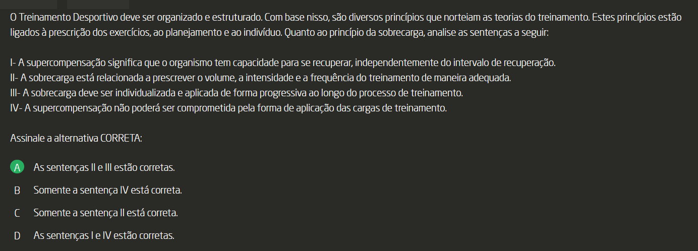 Treinamento Desportivo deve ser organizado e estruturado. Com base nisso, são diversos princípios que norteiam as teorias do treinamento. Estes princípios estão ligados à prescrição dos exercícios, ao planejamento e ao indivíduo. Quanto ao princípio da sobrecarga, analise as sentenças a seguir: I- A supercompensação significa que organismo tem capacidade para se recuperar, independentemente do intervalo de recuperação. II- A sobrecarga está relacionada a prescrever volume, a intensidade e a frequência do treinamento de maneira III- - A sobrecarga deve ser individualizada e aplicada de forma progressiva ao longo do processo de treinamento. IV- A supercompensação não poderá ser comprometida pela forma de aplicação das cargas de treinamento. Assinale a alternativa CORRETA: A As sentenças II e III estão corretas. B Somente a sentença IV está correta. C Somente a sentença II está correta. D As sentenças I e IV estão corretas.