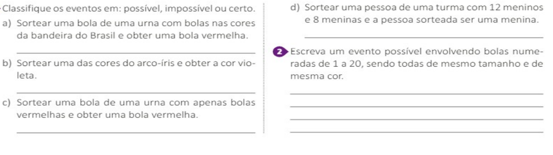 <p>Nome;_________data:__/09/2023 ** Baronesa** Matemática ** Módulo 18 **Probabili</p><p>1. O que evento? 308</p><p>___________________________________________________________________________________</p><p>___________________________________________________________________________________</p><p>2. No laçamento de um dado de 6 faces temos:308</p><p>a) espaço amostral: __________________________________________________________________</p><p>b) evento A (par) :____________________________________________________________________</p><p>c) evento B ( ímpar): __________________________________________________________________</p><p>3. Como podemos classificar os três tipos de eventos? 308</p><p>___________________________________________________________________________________</p><p>4. Qual a fórmula do cálculo da probabilidade de um evento A? 308</p><p>___________________________________________________________________________________</p><p>5. O que é probabilidade? 309</p><p>___________________________________________________________________________________</p><p>___________________________________________________________________________________</p><p>6. Uma turma é composta dee 15 meninas e 10 meninos . Qual é a probabilidade de a professora escolher aleatoriamente uma menina dessa turma?</p><p>image1.png</p><p>image2.png</p><p>image3.png</p>