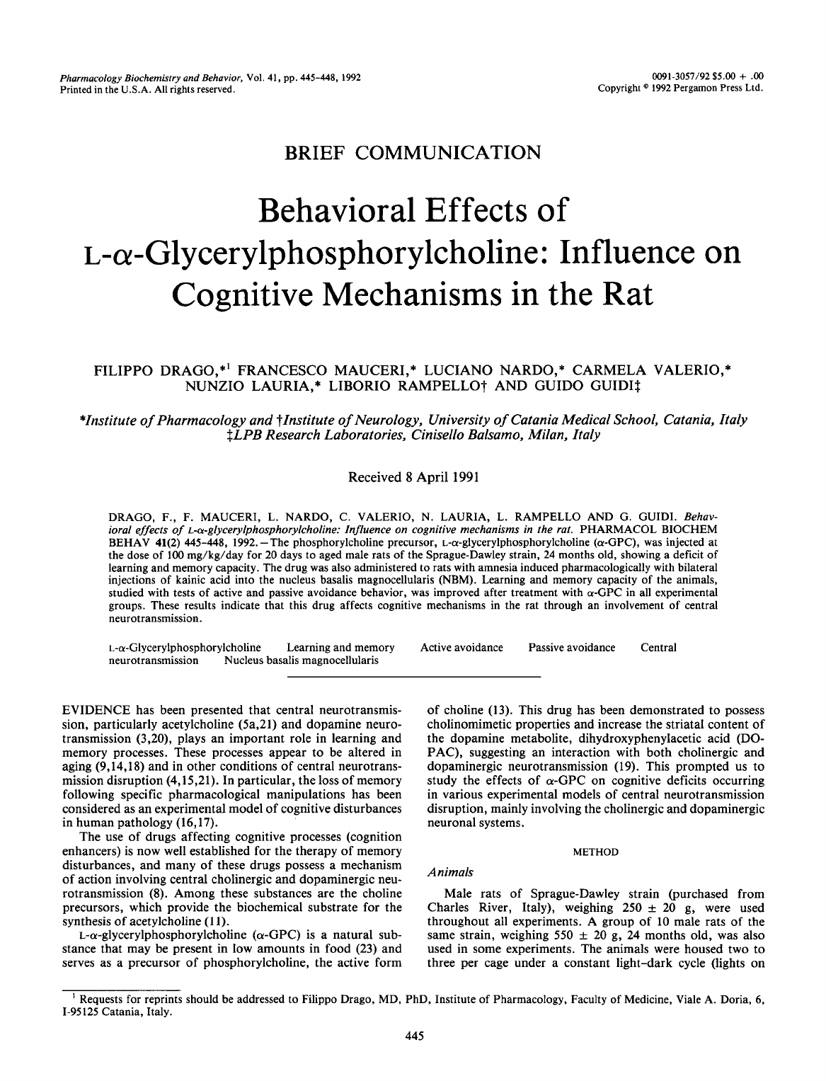 <p>Pharmacology Biochemistry and Behavior, Vol. 41, pp. 445-448, 1992 0091-3057/92 $5.00 + .00</p><p>Printed in the U.S.A. All rights reserved. Copyright © 1992 Pergamon Press Ltd.</p><p>BRIEF COMMUNICATION</p><p>Behavioral Effects of</p><p>L-c -Glycerylphosphorylcholine: Influence on</p><p>Cognitive Mechanisms in the Rat</p><p>F I L I P P O D R A G O , *l F R A N C E S C O M A U C E R I , * L U C I A N O N A R D O , * C A R M E L A V A L E R I O , *</p><p>N U N Z I O L A U R I A , * L I B O R I O R A M P E L L O t - A N D G U I D O G U I D I ~</p><p>*Institute o f Pharmacology and t lnst i tute o f Neurology, University o f Catania Medical School, Catania, Italy</p><p>~LPB Research Laboratories, Cinisello Balsamo, Milan, Italy</p><p>Received 8 Apr i l 1991</p><p>DRAGO, F., F. MAUCERI, L. NARDO, C. VALERIO, N. LAURIA, L. RAMPELLO AND G. GUIDI. Behav-</p><p>ioral effects of L-c~-glycerylphosphorylcholine: Influence on cognitive mechanisms in the rat. PHARMACOL BIOCHEM</p><p>BEHAV 41(2) 445-448, 1992.--The phosphorylcholine precursor, L-a-glycerylphosphorylcholine (c~-GPC), was injected at</p><p>the dose of 100 mg/kg/day for 20 days to aged male rats of the Sprague-Dawley strain, 24 months old, showing a deficit of</p><p>learning and memory capacity. The drug was also administered to rats with amnesia induced pharmacologically with bilateral</p><p>injections of kainic acid into the nucleus basalis magnocellularis (NBM). Learning and memory capacity of the animals,</p><p>studied with tests of active and passive avoidance behavior, was improved after treatment with ct-GPC in all experimental</p><p>groups. These results indicate that this drug affects cognitive mechanisms in the rat through an involvement of central</p><p>neurotransmission.</p><p>L-a-Glycerylphosphorylcholine Learning and memory</p><p>neurotransmission Nucleus basalis magnocellularis</p><p>Active avoidance Passive avoidance Central</p><p>EVIDENCE has been presented that central neurotransmis-</p><p>sion, particularly acetylcholine (5a,21) and dopamine neuro-</p><p>transmission (3,20), plays an important role in learning and</p><p>memory processes. These processes appear to be altered in</p><p>aging (9,14,18) and in other conditions of central neurotrans-</p><p>mission disruption (4,15,21). In particular, the loss of memory</p><p>following specific pharmacological manipulations has been</p><p>considered as an experimental model of cognitive disturbances</p><p>in human pathology (16,17).</p><p>The use of drugs affecting cognitive processes (cognition</p><p>enhancers) is now well established for the therapy of memory</p><p>disturbances, and many of these drugs possess a mechanism</p><p>of action involving central cholinergic and dopaminergic neu-</p><p>rotransmission (8). Among these substances are the choline</p><p>precursors, which provide the biochemical substrate for the</p><p>synthesis of acetylcholine (11).</p><p>L-c~-glycerylphosphorylcholine (u-GPC) is a natural sub-</p><p>stance that may be present in low amounts in food (23) and</p><p>serves as a precursor of phosphorylcholine, the active form</p><p>I Requests for reprints should be addressed to Filippo Drago, MD,</p><p>1-95125 Catania, Italy.</p><p>of choline (13). This drug has been demonstrated to possess</p><p>cholinomimetic properties and increase the striatal content of</p><p>the dopamine metabolite, dihydroxyphenylacetic acid (DO-</p><p>PAC), suggesting an interaction with both cholinergic and</p><p>dopaminergic neurotransmission (19). This prompted us to</p><p>study the effects of ct-GPC on cognitive deficits occurring</p><p>in various experimental models of central neurotransmission</p><p>disruption, mainly involving the cholinergic and dopaminergic</p><p>neuronal systems.</p><p>METHOD</p><p>Animals</p><p>Male rats of Sprague-Dawley strain (purchased from</p><p>Charles River, Italy), weighing 250 ___ 20 g, were used</p><p>throughout all experiments. A group of 10 male rats of the</p><p>same strain, weighing 550 +_ 20 g, 24 months old, was also</p><p>used in some experiments. The animals were housed two to</p><p>three per cage under a constant light-dark cycle (lights on</p><p>PhD, Institute of Pharmacology, Faculty of Medicine, Viale A. Doria, 6,</p><p>445</p><p>446 DRAGO ET AL.</p><p>between 0800 and 2000) at 21 nC. Food and water were avail-</p><p>able ad lib.</p><p>All animals were used only once in the behavioral experi-</p><p>ments.</p><p>Surgical Manipulations</p><p>A group of animals, fixed in a Kopf stereotaxic apparatus</p><p>after being anesthesized with pentobarbital, received the bilat-</p><p>eral implantation of stainless steel cannulas into the nucleus</p><p>basalis magnocellularis (NBS, 0.8 mm anterior and 3.0 mm</p><p>lateral of the bregma, 7.2 mm deep).</p><p>At the end of behavioral procedures, all animals were killed</p><p>by decapitation. Localization of cannulas was checked by in-</p><p>jecting Evans blue and microscopical inspection of the color-</p><p>ing of brain tissue in formalin-fixed preparations.</p><p>Drugs</p><p>t-c~-glycerylphosphorylcholine (LPB Research Labora-</p><p>tories, Italy) was dissolved in saline and injected IP at doses</p><p>of 100 mg/kg/day for 20 days, the last injection being made</p><p>1 h prior to behavioral testing. Control animals received an</p><p>injection of placebo with the same procedure.</p><p>Kainic acid (Sigma, USA) was dissolved in saline and in-</p><p>jected bilaterally into the NBM at the dose of 1 #g/ l #1.</p><p>Placebo-treated animals served as controls.</p><p>Behavioral Tests</p><p>Shuttle-box acquisition was studied in a single-session test</p><p>as described elsewhere (2). Briefly, rats were trained to avoid</p><p>the unconditioned stimulus (US) of a scrambled electrical foot</p><p>shock (0.20 mA) delivered through the grid floor. The condi-</p><p>tioned stimulus (CS) was a buzzer presented for 3 s prior to</p><p>the US. If no escape occurred within 20 s of CS/US presenta-</p><p>tion, the sh