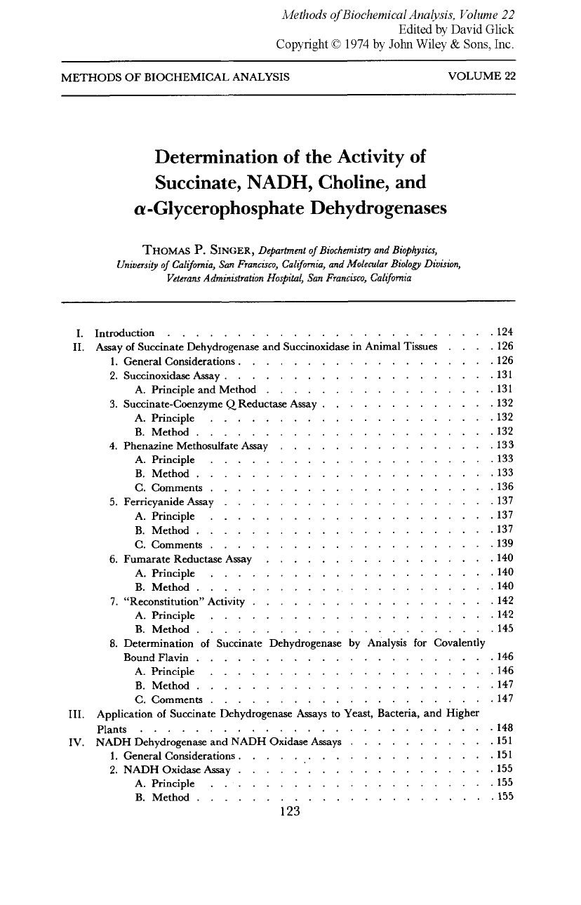 <p>METHODS OF BIOCHEMICAL ANALYSIS VOLUME 22</p><p>Determination of the Activity of</p><p>Succinate. NADH. Choline. and</p><p>a-Glycerophosphate Dehydrogenases</p><p>THOMAS P . SINGER. Department of Biochemistry and Biophysics.</p><p>Universiy af California. San Franckca. Calgarnia. and Molentlar Biology Diuision.</p><p>Yeterans Administration Hospital. San Francisco. California</p><p>I . Introduction . . . . . . . . . . . . . . . . . . . . . . . . 124</p><p>I1 . . . . . 126</p><p>1 . General Considerations . . . . . . . . . . . . . . . . . . . 126</p><p>. . . . . . . . . . . . . . . . . 131</p><p>3 . Succinate-Coenzyme QReductase Assay . . . . . . . . . . . . . 132</p><p>A . Principle . . . . . . . . . . . . . . . . . . . . . 132</p><p>B . Method . . . . . . . . . . . . . . . . . . . . . . 132</p><p>. . . . . . . . . . . . . . . . 133</p><p>B . Method . . . . . . . . . . . . . . . . . . . . . . 133</p><p>C . Comments . . . . . . . . . . . . . . . . . . . . . 136</p><p>5 . Ferricyanide Assay . . . . . . . . . . . . . . . . . . . . 137</p><p>A . Principle . . . . . . . . . . . . . . . . . . . . . 137</p><p>B . Method . . . . . . . . . . . . . . . . . . . . . . 137</p><p>C . Comments . . . . . . . . . . . . . . . . . . . . . 139</p><p>. . . . . . . . . . . . . . . . . 140</p><p>B . Method . . . . . . . . . . . . . . . . . . . . . . 140</p><p>7 . “Reconstitution” Activity . . . . . . . . . . . . . . . . . . 142</p><p>A . Principle . . . . . . . . . . . . . . . . . . . . . 142</p><p>B . Method . . . . . . . . . . . . . . . . . . . . . . 145</p><p>Bound Flavin . . . . . . . . . . . . . . . . . . . . . . 146</p><p>A . Principle . . . . . . . . . . . . . . . . . . . . . 146</p><p>B . Method . . . . . . . . . . . . . . . . . . . . . . 147</p><p>C . Comments . . . . . . . . . . . . . . . . . . . . . 147</p><p>Plants . . . . . . . . . . . . . . . . . . . . . . . . . . 148</p><p>IV . NADH Dehydrogenase and NADH Oxidase Assays . . . . . . . . . . . 151</p><p>1 . General Considerations . . . . . . . . . . . . . . . . . . . 151</p><p>2 . NADH Oxidase Assay . . . . . . . . . . . . . . . . . . . 155</p><p>A . Principle . . . . . . . . . . . . . . . . . . . . . 155</p><p>Assay of Succinate Dehydrogenase and Succinoxidase in Animal Tissues</p><p>2 . Succinoxidase Assay . . . . . . . . . . . . . . . . . . . . 131</p><p>A . Principle and Method</p><p>4 . Phenazine Methosulfate Assay</p><p>A . Principle . . . . . . . . . . . . . . . . . . . . . 133</p><p>6 . Fumarate Reductase Assay</p><p>A . Principle . . . . . . . . . . . . . . . . . . . . . 140</p><p>8 . Determination of Succinate Dehydrogenase by Analysis for Covalently</p><p>111 . Application of Succinate Dehydrogenase Assays to Yeast, Bacteria, and Higher</p><p>B . Method . . . . . . . . . . . . . . . . . . . . . . 155</p><p>123</p><p>Methods of Biochemical Analysis, Volume 22</p><p>Edited by David Glick</p><p>Copyright © 1974 by John Wiley & Sons, Inc.</p><p>124 THOMAS P . SINGER</p><p>3 . NADH-Coenzyme Q Reductase Assay . . . . . . . . . . .</p><p>A . Principle . . . . . . . . . . . . . . . . . . .</p><p>B.Method . . . . . . . . . . . . . , . . . . . .</p><p>C . Comments . . . . . . . . . . . . . . . . . . .</p><p>4 . NADH-Ferricyanide Assay . . . . . . . . . . . . . . .</p><p>B . Method . . . . . . . . . . . . . . . . . . . .</p><p>C . Comments . . . . . . . . . . . . . . . . . . .</p><p>. . . .</p><p>A . Principle . . . . . . . . . . . . . . . . . . .</p><p>B . Method . . . . . . . . . . . . . . . . . . . .</p><p>. C . Comments . . . . . . . . . . . . . . . . . . .</p><p>A . Principle . . . . . . . . . . . . . . . . . . .</p><p>5 . Assay of Low-Molecular-Weight Derivatives of the Enzyme</p><p>6 . Transhydrogenase Assay . . . . . . . . . . . . . . . .</p><p>A . Principle . . . . . . . . . . . . . . . . . . .</p><p>B . Method . . . . . . . . . . . . . . . . . . . .</p><p>. . . . . . . . . . . . . . . . .</p><p>A . Saccharomyccs cercviszat . . . . . . . . . . . . . . .</p><p>B . Candtda utilis . . . . . . . . . . . . . . . . . .</p><p>8 . Determination of NADH Dehydrogenase Content by Piericidin Binding</p><p>V . Assay of Choline Dehydrogenase . . . . . . . . . . . . . . .</p><p>1 . Principle . . . . . . . . . . . . . . . . . . . . .</p><p>2 .Method . . . . . . . . . . . . . . . . . . . . . .</p><p>3 . Comments . . . . . . . . . . . . . . . . . . . . .</p><p>VI . Assay of Mitochondria1 a-Glycerophosphate Dehydrogenase . . . . . .</p><p>1 . Principle . . . . . . . . . . . . . . . . . . . . .</p><p>2 .Method . . . . . . . . . . . . . . . . . . . . . .</p><p>References . . . . . . . . . . . . . . . . . . . . . . . . .</p><p>7 . Application to Yeast</p><p>. .156</p><p>. .156</p><p>. .156</p><p>. .157</p><p>. .158</p><p>. .158</p><p>. .160</p><p>. .161</p><p>. .161</p><p>. .161</p><p>. .163</p><p>. .163</p><p>. .164</p><p>. .164</p><p>. .165</p><p>. .165</p><p>. .165</p><p>. .166</p><p>. . 167</p><p>. .168</p><p>. .168</p><p>. .168</p><p>. .170</p><p>. .170</p><p>. .170</p><p>. .172</p><p>. . 172</p><p>INTRODUCTION</p><p>More than 15 years have elapsed since the publication of the author’s</p><p>previous review in this series on methods of determination of succinate</p><p>dehydrogenase activity (1) . In the intervening years the phenazine metho-</p><p>sulfate (PMS)* assay described in that article has been widely adopted. its</p><p>limitations and the complexities imposed by the unusual regulatory proper-</p><p>ties of succinate dehydrogenase have been recognized. and improved proce-</p><p>dures designed to deal with these problems have been devised . It seems</p><p>appropriate. therefore. to review available information on the determination</p><p>of the activity of the enzyme. as well as its concentration. in various</p><p>biological materials .</p><p>* The following abbreviations are used in this article: CoQ and CoQH2. oxidized and</p><p>reduced forms of coenzyme Q (ubiquinone); CoQdl. CoQ2. etc., homologs of CoQ with one.</p><p>two. etc., isopre
