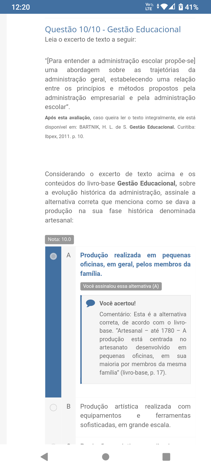 12:20 LTE 41% Questão 10/10 - Gestão Educacional Leia o excerto de texto a seguir: "[Para entender a administração escolar propõe-se] uma abordagem sobre as trajetórias da administração geral, estabelecendo uma relação entre os princípios e métodos propostos pela administração empresarial e pela administração escolar". Após esta avaliação, caso queira texto integralmente, ele está disponível em: BARTNIK, H. L. de S. Gestão Educacional. Curitiba: Ibpex, 2011. p. 10. Considerando o excerto de texto acima e os conteúdos do livro-base Gestão Educacional, sobre a evolução histórica da administração, assinale a alternativa correta que menciona como se dava a produção na sua fase histórica denominada artesanal: Nota: 10.0 A Produção realizada em pequenas oficinas, em geral, pelos membros da família. Você assinalou essa alternativa (A) Você acertou! Comentário: Esta é a alternativa correta, de acordo com o livro- base. "Artesanal - até 1780 - A produção está centrada no artesanato desenvolvido em pequenas oficinas, em sua maioria por membros da mesma (livro-base, p. 17). B Produção artística realizada com equipamentos e ferramentas sofisticadas, em grande escala.