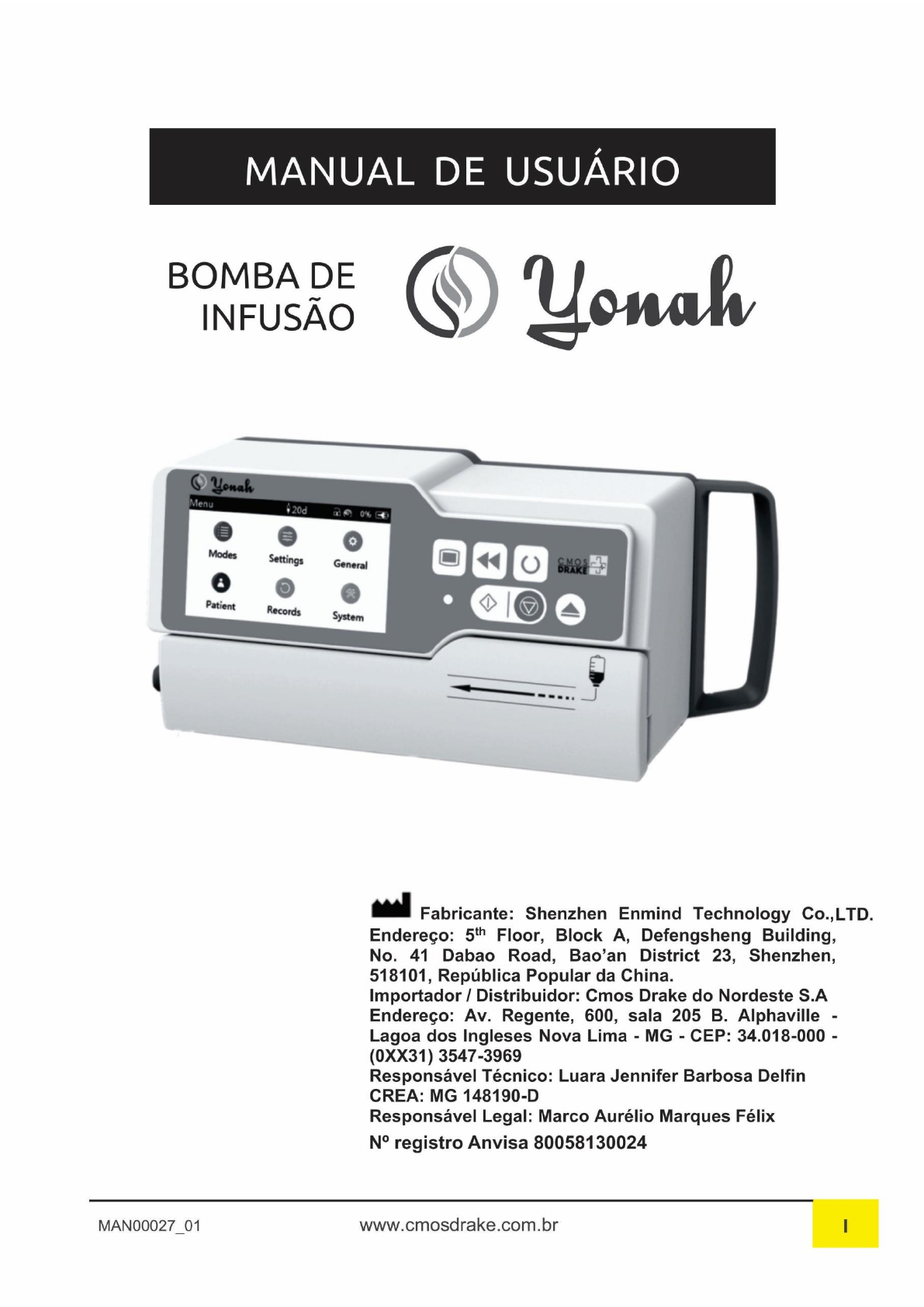 <p>1 MAN00027_01 www.cmosdrake.com.br</p><p>2 MAN00027_01 www.cmosdrake.com.br</p><p>ATENÇÃO!</p><p>A CMOS DRAKE está isenta de toda e qualquer responsabilidade acerca de danos</p><p>pessoais ou materiais causados pelo uso incorreto Da Bomba de Infusão Yonah e</p><p>seus acessórios. As seguintes situações são consideradas uso incorreto:</p><p>Uso fora das recomendações, informações e avisos do Manual do Usuário.</p><p>Aplicação diferente da finalidade pretendida.</p><p>Rompimento dos lacres de segurança.</p><p>Intervenções, reparos ou alterações do equipamento fora da rede de</p><p>assistências técnicas autorizadas.</p><p>Uso de acessórios ou componentes defeituosos, fora das especificações,</p><p>validade ou não fornecidos pelo fabricante;</p><p>Operação do equipamento por pessoa não qualificada.</p><p>Para obter mais informações sobre garantia ou assistência técnica, entre em</p><p>contato com o suporte técnico da CMOS DRAKE.</p><p>Parabéns pela aquisição da Bomba de Infusão</p><p>Yonah.</p><p>Todas as informações necessárias para a utilização</p><p>segura e correta equipamento encontram-se neste</p><p>manual, além de informações sobre os cuidados</p><p>essenciais, conservação, esclarecimentos</p><p>relacionados à Assistência Técnica e Certificado de</p><p>Garantia.</p><p>A leitura completa deste manual deve ser realizada</p><p>antes do uso do equipamento, sendo condição</p><p>obrigatória e imprescindível. Mantenha o manual</p><p>sempre próximo ao equipamento para consulta,</p><p>dúvidas e esclarecimentos.</p><p>3 MAN00027_01 www.cmosdrake.com.br</p><p>1 VISÃO GERAL 10</p><p>USO PRETENDIDO 10</p><p>USO DESTINADO 10</p><p>A bomba de infusão poder ser utilizada em pacientes adulto, pediátricos e</p><p>neonatais. 10</p><p>PRINCÍPIO DE FUNCIONAMENTO 10</p><p>ESTRUTURA E DESEMPENHO 10</p><p>ACESSÓRIOS 11</p><p>DESCRIÇÃO DO MODELO 11</p><p>2 ADVERTENCIAS 12</p><p>3 SIMBOLOGIA 17</p><p>4 VISÃO GERAL 18</p><p>VISTA FRONTAL 18</p><p>5 PAINEL DE OPERAÇÃO 19</p><p>6 VISOR 20</p><p>7 BARRA DE CONFIGURAÇÕES 20</p><p>8 INTERFACE TÍPICA 20</p><p>9 ÍCONES INTERFACE TÍPICA 21</p><p>10 INTERFACE DE SETUP 21</p><p>11 VISTA POSTERIOR 22</p><p>SUMÁRIO</p><p>file:///C:/Users/aline.aquino.CMOSDRAKE/Desktop/MAN00027_01%20-%20Manual%20do%20Usuario%20Bomba%20de%20Infusao%20Yonah.docx%23_Toc41919539</p><p>file:///C:/Users/aline.aquino.CMOSDRAKE/Desktop/MAN00027_01%20-%20Manual%20do%20Usuario%20Bomba%20de%20Infusao%20Yonah.docx%23_Toc41919547</p><p>file:///C:/Users/aline.aquino.CMOSDRAKE/Desktop/MAN00027_01%20-%20Manual%20do%20Usuario%20Bomba%20de%20Infusao%20Yonah.docx%23_Toc41919548</p><p>file:///C:/Users/aline.aquino.CMOSDRAKE/Desktop/MAN00027_01%20-%20Manual%20do%20Usuario%20Bomba%20de%20Infusao%20Yonah.docx%23_Toc41919549</p><p>4 MAN00027_01 www.cmosdrake.com.br</p><p>12 SENSOR DE QUEDA (OPCIONAL) 23</p><p>13 INSTALAÇÃO 24</p><p>14 INSTALAÇÃO 24</p><p>15 ETAPAS DE INSTALAÇÃO 25</p><p>INSTALAÇAO SENSOR DE QUEDA 26</p><p>16 OPERAÇÃO 27</p><p>17 PREPARAÇÃO DO USO 27</p><p>18 PRECAUÇÕES DE OPERAÇÃO 27</p><p>19 CONFIGURAÇÃO DE FABRICA 28</p><p>20 OPERAÇÃO BÁSICA 29</p><p>21 OPERAÇÃO DA INFUSÃO 29</p><p>22 INÍCIO E AUTOTESTE 29</p><p>23 CONFIGURAÇÃO DOS PARÂMETROS DE INFUSÃO 31</p><p>Expurgue o Ar 31</p><p>Inicie a Infusão 31</p><p>Alteração dos parâmetros de infusão durante a infusão 31</p><p>Aplicação em Bolus 32</p><p>Conclusão da Infusão 32</p><p>Interromper a Infusão 33</p><p>Remova o Aparelho de Infusão 33</p><p>Desligado ou em Espera 33</p><p>Substitua a Linha de Infusão / Recipiente de Infusão 34</p><p>24 CONFIGURAÇÃO PARAMETROS INFUSÃO 35</p><p>file:///C:/Users/aline.aquino.CMOSDRAKE/Desktop/MAN00027_01%20-%20Manual%20do%20Usuario%20Bomba%20de%20Infusao%20Yonah.docx%23_Toc41919559</p><p>file:///C:/Users/aline.aquino.CMOSDRAKE/Desktop/MAN00027_01%20-%20Manual%20do%20Usuario%20Bomba%20de%20Infusao%20Yonah.docx%23_Toc41919563</p><p>file:///C:/Users/aline.aquino.CMOSDRAKE/Desktop/MAN00027_01%20-%20Manual%20do%20Usuario%20Bomba%20de%20Infusao%20Yonah.docx%23_Toc41919580</p><p>5 MAN00027_01 www.cmosdrake.com.br</p><p>25 INTRODUÇÃO À CONFIGURAÇÃO DOS</p><p>PARÂMETROS DE INFUSÃO 35</p><p>26 Faixa de Configuração dos Parâmetros de Infusão 35</p><p>27 Configuração do Modo de Infusão 36</p><p>Modo ml/h 37</p><p>Modo de peso Corporal 37</p><p>Modo de Gotejamento 37</p><p>Modo de dose de Carregamento 37</p><p>Modo de Aceleração / Desaceleração 38</p><p>Modo de Sequência 38</p><p>Modo de Biblioteca de Drogas 38</p><p>28 CONFIGURAÇÃO DO SISTEMA 39</p><p>29 CONFIGURAÇÃO DO SISTEMA 39</p><p>30 Configurações 39</p><p>Biblioteca de Drogas 39</p><p>Introdução à biblioteca da Drogas 39</p><p>Configuração da Biblioteca de Drogas 39</p><p>Taxa KVO 39</p><p>Taxa de Bolus 40</p><p>Pressão de Oclusão 40</p><p>DPS (Sistema Dinâmico de Pressão) 41</p><p>Tamanho das Bolhas 41</p><p>Bolha Cumulativa 41</p><p>Concluir Pré-Alarme 42</p><p>Alarme de Lembrete 42</p><p>Unidade de Peso 42</p><p>Unidade de Pressão 42</p><p>Modo Micro 43</p><p>file:///C:/Users/aline.aquino.CMOSDRAKE/Desktop/MAN00027_01%20-%20Manual%20do%20Usuario%20Bomba%20de%20Infusao%20Yonah.docx%23_Toc41919591</p><p>6 MAN00027_01 www.cmosdrake.com.br</p><p>Sensor de Queda 43</p><p>Nível do Sensor de Queda 43</p><p>Marca do tubo comumente usado 43</p><p>Redefinir o Volume Total 44</p><p>31 Geral 44</p><p>Rede 44</p><p>MODO DE CONEXÃO 45</p><p>Retransmissão 45</p><p>WLAN 45</p><p>Som 45</p><p>Data e Hora 46</p><p>Bloqueio de Tela 46</p><p>Brilho 46</p><p>Modo Noturno 46</p><p>Chamada da Enfermagem 47</p><p>Nível de Alarme de Chamada da Enfermagem 47</p><p>Exibição da Capacidade da Bateria 47</p><p>32 Paciente 47</p><p>Informações do Paciente 47</p><p>Prescrição 47</p><p>33 Registros 48</p><p>Entradas do histórico 48</p><p>Últimas terapias 48</p><p>Exportar registros do histórico 48</p><p>O ambiente de execuçã