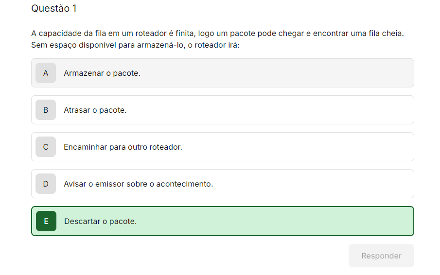 Questão 1 A capacidade da fila em um roteador é finita, logo um pacote pode e encontrar uma fila cheia. Sem espaço disponível para roteador irá: A Armazenar pacote. B Atrasar pacote. C Encaminhar para outro roteador. D Avisar emissor sobre acontecimento. E Descartar o pacote. Responder
