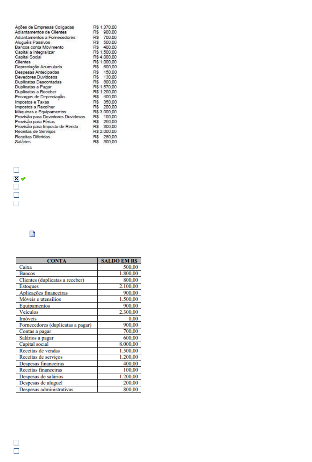 <p>A empresa Mercantil de Varejos Ltda., no encerramento do exercício social, apurou os saldos do livro Razão</p><p>apresentando-os da seguinte forma, em ordem alfabética:</p><p>Analisando-se o balancete de verificação acima, pode-se dizer que o valor dos saldos devedores é de:</p><p>R$ 9.500,00.</p><p>R$ 11.000,00.</p><p>R$ 6.320,00.</p><p>R$ 8.000,00.</p><p>R$ 6.500,00.</p><p>2. Ref.: 5331269 Pontos: 1,00 / 1,00</p><p>Os saldos apresentados foram extraídos da contabilidade em 31/10/20X1.</p><p>Ao levantar o balancete de verificação, o contador identificou um erro no lançamento do fato contábil a seguir.</p><p>31/10/20X1 - Pagamento de aluguel no valor de R$ 200,00, com cheque.</p><p>Com base nessas informações, assinale a alternativa que identifica o erro cometido pelo contador.</p><p>Lançamento com valor errado.</p><p>Omissão do registro.</p><p>javascript:alert('C%C3%B3digo da quest%C3%A3o: 5331269.');</p><p>javascript:alert('C%C3%B3digo da quest%C3%A3o: 5331269.');</p><p>Lançamento a crédito na conta errada.</p><p>Lançamento em duplicidade.</p><p>A conta a ser creditada foi debitada.</p><p>3. Ref.: 5329012 Pontos: 1,00 / 1,00</p><p>A Cia. Fechadura apresentava seu Balancete em 31/12/X7, com os saldos, em reais, nas seguintes contas:</p><p>Fornecedores 120.000,00;</p><p>Aplicações Financeiras 105.000,00;</p><p>Promissórias a Pagar 19.000,00;</p><p>Fretes sobre Vendas 13.000,00;</p><p>ContaCorrente 80.000,00;</p><p>Clientes 175.000,00;</p><p>Provisão para Créditos de Liquidação Duvidosa 5.000,00;</p><p>Seguros Pagos Antecipadamente 40.000,00;</p><p>Adiantamento de Clientes 25.000,00;</p><p>Despesas Financeiras 17.500,00;</p><p>Despesas de Comissões sobre vendas 7.500,00;</p><p>Receitas Financeiras 6.000,00;</p><p>Custo das Mercadorias Vendidas 140.000,00;</p><p>Despesas de Salários 10.000,00;</p><p>Reserva Legal 40.000,00;</p><p>Abatimento sobre Vendas 1.500,00;</p><p>Estoques de Mercadorias 150.000,00;</p><p>Receita de Vendas 310.000,00;</p><p>Capital Social 200.000,00;</p><p>Títulos a Pagar de Longo Prazo 65.500,00;</p><p>Devolução de Vendas 5.500,00;</p><p>Empréstimos de Curto Prazo Obtidos 80.000,00;</p><p>Terrenos 85.000,00;</p><p>Despesas de Depreciação de Imóveis 2.500,00;</p><p>Imóveis 50.000,00;</p><p>Depreciação Acumulada Imóveis 12.000,00.</p><p>O lucro líquido do exercício foi, em reais,</p><p>125.500,00</p><p>118.500,00</p><p>111.500,00</p><p>121.000,00</p><p>113.500,00</p><p>javascript:alert('C%C3%B3digo da quest%C3%A3o: 5329012.');</p><p>javascript:alert('C%C3%B3digo da quest%C3%A3o: 5329012.');</p><p>00290-TEGE-2009: OPERAÇÕES CONTÁBEIS - PARTE I</p><p>4. Ref.: 5322285 Pontos: 0,00 / 1,00</p><p>Considerando que uma empresa aplicou determinada quantia, por certo período, que rendeu juros prefixados,</p><p>assinale a opção correta a respeito da contabilização das operações envolvidas na aplicação.</p><p>A conta juros ativos a vencer (devedora) receberá um débito pelo valor dos juros no momento da</p><p>aplicação e um crédito por ocasião da apropriação da receita ganha no período.</p><p>A conta juros ativos a vencer (devedora) receberá um débito pelo valor dos juros sobre a aplicação e</p><p>um crédito por ocasião da apropriação da receita ganha no período.</p><p>A conta juros passivos a vencer (credora) receberá um crédito pelo valor dos juros sobre a aplicação e</p><p>outro crédito por ocasião da apropriação da receita ganha no período.</p><p>A conta juros passivos a vencer (credora) receberá um débito pelo valor dos juros sobre a aplicação e</p><p>um crédito por ocasião da apropriação da receita ganha no período.</p><p>A conta juros ativos a vencer (credora) receberá um crédito pelo valor dos juros no momento da</p><p>aplicação e um débito por ocasião da apropriação da receita ganha no período.</p><p>5. Ref.: 5319288 Pontos: 1,00 / 1,00</p><p>A Comercial RRR S/A adquiriu uma nova máquina, para seu imobilizado, nas seguintes condições:</p><p>entrada de R$ 50.000,00, no ato da operação, em cheque;</p><p>nove parcelas semestrais de R$ 8.000,00 cada uma;</p><p>máquina registrada no imobilizado da RRR pelo valor original de R$ 120.000,00, e depreciação</p><p>acumulada de R$ 60.000,00, entregues ao vendedor como parte do pagamento, pelo valor acordado</p><p>entre as partes de R$ 20.000,00;</p><p>pagamento diretamente à transportadora do frete, pelo carreto da máquina, do armazém do vendedor</p><p>até as instalações do comprador, de R$ 15.000,00;</p><p>pagamento do seguro sobre o frete, de R$ 3.000,00.</p><p>Admitindo-se a inexistência de impostos nas operações realizadas, o valor da máquina a ser registrado no</p><p>Ativo Não Circulante/Imobilizado, em reais, é:</p><p>100.000,00</p><p>160.000,00</p><p>137.000,00</p><p>142.000,00</p><p>157.000,00</p><p>6. Ref.: 5299173 Pontos: 1,00 / 1,00</p><p>Um maquinário foi adquirido por R$ 60.000,00 e vendido por R$ 18.000,00 com recebimento em 30 dias.</p><p>Considerando que 75% do custo de aquisição do maquinário já foi depreciado, a contabilização dessa</p><p>transação provocará:</p><p>um aumento líquido de R$ 3.000,00 no Ativo.</p><p>uma redução líquida de R$ 60.000,00 no Imobilizado.</p><p>uma redução líquida de R$ 3.000,00 no Ativo.</p><p>uma redução líquida de R$ 27.000,00 no resultado do período.</p><p>um aumento líquido de R$ 18.000,00 no resultado do período.</p><p>00314-TEGE-2009: A TÉCNICA CONTÁBIL</p><p>javascript:alert('C%C3%B3digo da quest%C3%A3o: 5322285.');</p><p>javascript:alert('C%C3%B3digo da quest%C3%A3o: 5322285.');</p><p>javascript:alert('C%C3%B3digo da quest%C3%A3o: 5319288.');</p><p>javascript:alert('C%C3%B3digo da quest%C3%A3o: 5319288.');</p><p>javascript:alert('C%C3%B3digo da quest%C3%A3o: 5299173.');</p><p>javascript:alert('C%C3%B3digo da quest%C3%A3o: 5299173.');</p><p>7. Ref.: 4875594 Pontos: 1,00 / 1,00</p><p>Os lançamentos contábeis são formalizados por débitos 