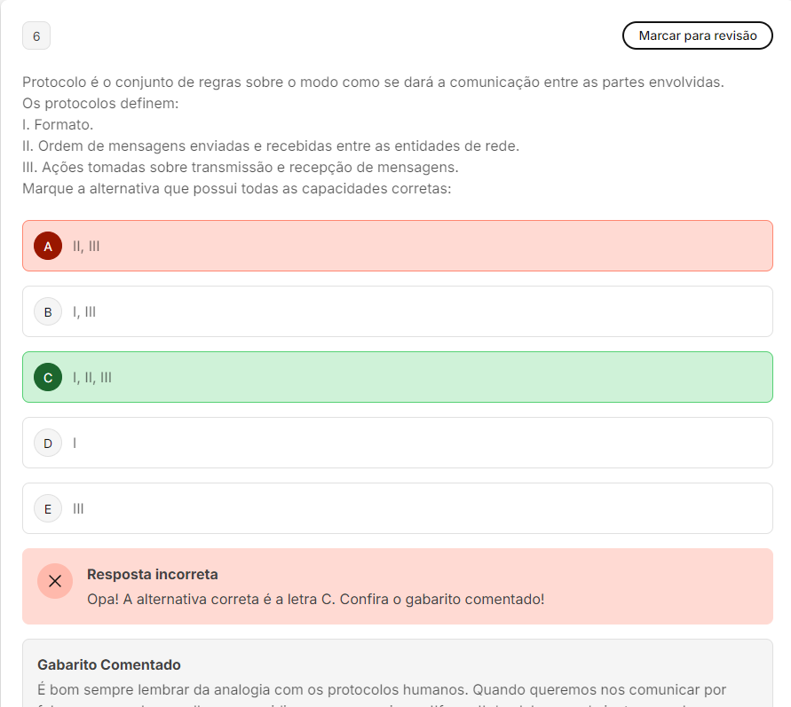 6 Marcar para revisão Protocolo é conjunto de regras sobre modo como se dará a comunicação entre as partes envolvidas. Os protocolos definem: I. II. Ordem de mensagens enviadas e recebidas entre as entidades de rede. III. Ações tomadas sobre transmissão e recepção de mensagens. Marque a alternativa que possui todas as capacidades corretas: A II, III B I, III C I, II, III D E III Resposta incorreta Opa! A alternativa correta é a letra C. Confira o gabarito comentado! Gabarito Comentado É bom sempre lembrar da analogia com os protocolos humanos. Quando queremos nos comunicar por