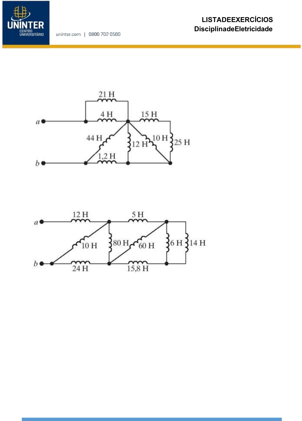 <p>Capacitores e Indutores</p><p>1) Determine a indutância equivalente entre os terminais A e B.</p><p>Resp.: Leq = 8,64 H</p><p>2) Determine a indutância equivalente entre os terminais A e B.</p><p>Resp.: Leq = 20 H</p><p>(</p><p>LISTA</p><p>DE</p><p>EXERCÍCIOS</p><p>Disciplina</p><p>de</p><p>Eletricidade</p><p>)</p><p>(</p><p>Pró-reitoria</p><p>de</p><p>EaD</p><p>e</p><p>CCDD</p><p>) (</p><p>10</p><p>)</p><p>3) Para o circuito apresentado, assinale a alternativa que apresenta a indutância equivalente.</p><p>Resp.: 𝐿𝑒𝑞 = 7,5 𝑚𝐻</p><p>4) Determine a capacitância equivalente entre os terminais A e B.</p><p>Resp.: Ceq=16 uF</p><p>5) Determine a capacitância equivalente entre os terminais A e B.</p><p>Resp.: Ceq = 5 nF</p><p>6) Para o circuito apresentado, assinale a alternativa que apresenta a capacitância equivalente.</p><p>Resp.: 𝐶𝑒𝑞 = 11 𝜇𝐹</p><p>Constante de Tempo</p><p>7) Determine a constante de tempo para o circuito abaixo.</p><p>Resp.:</p><p>𝑟 = 𝐿 [</p><p>𝑅𝑒𝑞</p><p>(</p><p>Sendo,</p><p>) (</p><p>(</p><p>) 𝑅1∗𝑅3𝑅𝑒𝑞 = ) + 𝑅2</p><p>𝑅1+𝑅3</p><p>8) Considerando que o capacitor acabou de ser ligado ao circuito e encontrava-se descarregado, calcule o tempo mínimo para o capacitor ser considerado carregado.</p><p>Resp.: 𝑟 = 5 s; t = 25 s.</p><p>9) Para o circuito apresentado ao lado, calcule qual a tensão no capacitor após 10 s, sendo que o capacitor estava incialmente descarregado e foi conectado ao circuito em t = 0 s.</p><p>Resp.: 𝑟 = 2,04 V</p><p>Circuitos RL</p><p>10) A chave do circuito esteve fechada por um longo tempo antes de ser aberta em t = 0s. Determine a equação que descreve a corrente do indutor:</p><p>Resp.:</p><p>iL(0) = 20A iL(∞) =0 A</p><p>𝑟=L/Req = 2/10 = 0,2 s iL(t) = 20.e-t/0,2 A</p><p>11) A chave do circuito esteve fechada por um longo tempo antes de ser aberta em t = 0s. Determine a equação que descreve a corrente flui através do indutor:</p><p>Resp.: iL(0) = 6 A iL(∞) = 0 A</p><p>𝑟=2/8=0,25</p><p>iL(t) = 6.e-t/0,25 A</p><p>12) Determine a equação que descreve a corrente flui através do indutor:</p><p>Resp.:</p><p>iL(0) = 10 A iL(∞) = 2 A</p><p>𝑟 =</p><p>𝐿</p><p>𝑅𝑇ℎ</p><p>15.10−3</p><p>=</p><p>2,222</p><p>= 6,75 𝑚𝑠</p><p>𝑖(𝑡) = 2 + 8. 𝑒−𝑡⁄6,75.10−3</p><p>13) Dado o circuito RL abaixo e considerando que a chave se encontrava na posição A por um período muito longo e foi comutada para a posição B no instante t = 0s. Determine a equação que descreve a corrente do indutor em função do tempo (iL(t)). Quanto tempo após o chaveamento de A para B a corrente do indutor (iL(t)) será máxima? Calcule a energia armazenada (w(t)) no instante t = 0s e t = ∞.</p><p>Resp.: iL(t) = 4 – 2.e-t/𝑟 ; t = 22,5 ms; w(0) = 20 mJ ; w(∞) = 80 mJ</p><p>Circuitos RC</p><p>14) A chave do circuito esteva na posição A por um longo tempo antes de ser comutada para B em t = 0s. Determine a equação que descreve a tensão do capacitor.</p><p>Resp.:</p><p>vC(0) = 15 V vC(∞) = 30 V</p><p>𝑟=Req.C= 4.103 . 0,5.103 =2 vC(t) = 30 – 15.e-t/2</p><p>15) A chave do circuito esteve fechada por um longo tempo antes de ser aberta em t = 0s. Determine a equação que descreve a tensão do capacitor:</p><p>Resp.:</p><p>vC(0) = 0 V vC(∞) = 40 V</p><p>𝑟=Req.C = 8.103 . 25.10-9 = 0,2.10-3 vC(t) = 40 - 40.e-t/0,2.10^-3</p><p>16) A chave do circuito esteve aberta por um longo tempo antes de ser fechada em t = 0s. Determine a tensão do capacitor:</p><p>Resp.:</p><p>vC(0) = 8 V vC(∞) = 6 V</p><p>𝑟=Req.C = 3 .30.10-9 = 90.10-9</p><p>(</p><p>𝑐</p><p>)𝑣 (𝑡) = 6 + 2 . 𝑒−𝑡⁄90.10−9</p><p>17) Dado o circuito RC abaixo e considerando que a chave se encontrava aberta por um período muito longo e foi fechada no instante t = 0s. Determine a equação que descreve a tensão do capacitor em função do tempo (vc(t)). A partir de qual instante o capacitor já pode ser considerado completamente carregado? Calcule a energia armazenada no capacitor no instante t = 0 segundos.</p><p>Resp.: vC(t) = 3 + 1.e-t/𝑟 V; t = 0,8 segundos; w(0) = 427 mJ</p><p>Circuitos RLC</p><p>18) Para o circuito ao lado, indique o valor de α, ω0 e o tipo de circuito.</p><p>Resp.:</p><p>α = 10; ω0 = 10; Circuito criticamente amortecido</p><p>19) Para o circuito RLC série com fonte, determine qual o tipo de resposta do circuito.</p><p>Resp.: Superamortecido</p><p>20) Para o circuito RLC série sem fonte, determine qual o tipo de resposta do circuito.</p><p>Resp.:</p><p>𝛼 =</p><p>𝑅</p><p>2. 𝐿</p><p>= 2000 𝑁𝑝/𝑠</p><p>𝜔0 = 2000 𝑟𝑎𝑑/𝑠</p><p>Como α = ω0, a resposta será criticamente amortecido.</p><p>𝑖(𝑡) = 𝐴1. 𝑒−𝛼𝑡 + 𝐴2. 𝑡. 𝑒−𝛼𝑡</p><p>21) Dado o circuito RLC paralelo abaixo, determine o valor da indutância para que comportamento da resposta seja superamortecido.</p><p>Resp.:</p><p>Para que seja superamortecido: α > ω0</p><p>1</p><p>2. 𝑅. 𝐶</p><p>1</p><p>></p><p>√𝐿. 𝐶</p><p>1 2 1 2</p><p>( )</p><p>2. 𝑅. 𝐶</p><p>> ( )</p><p>√𝐿. 𝐶</p><p>1 1</p><p>4. 𝑅2. 𝐶2 > 𝐿. 𝐶</p><p>4. 𝑅2. 𝐶2</p><p>𝐿 ></p><p>𝐶</p><p>22) Dado o circuito abaixo determine a resistência para que o circuito seja Superamortecido</p><p>Resp.: R</p>