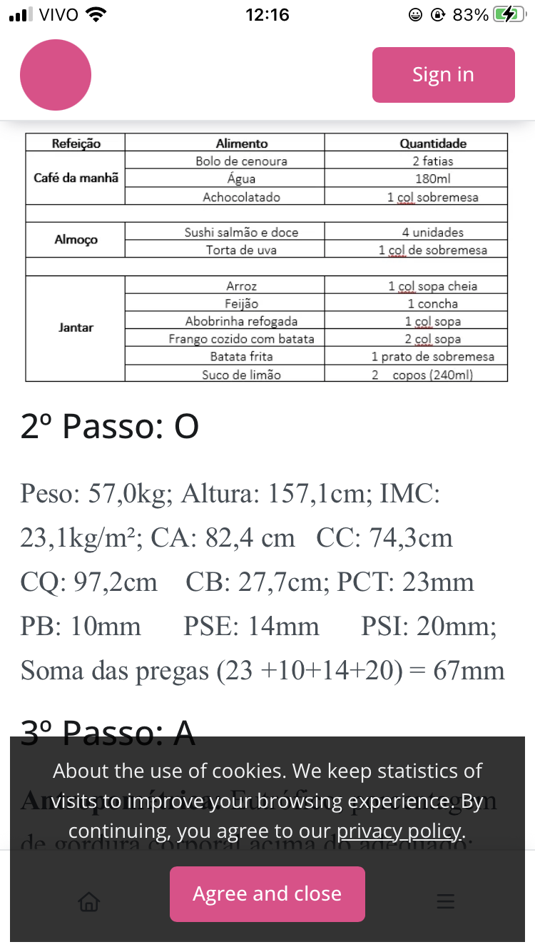 VIVO 12:16 83% Sign in Refeição Alimento Quantidade Bolo de cenoura 2 fatias da manhã Água 180ml Achocolatado 1 col sobremesa Sushi salmão e doce 4 unidades Almoço Torta de uva 1 col de sobremesa Arroz 1 col sopa cheia Feijão 1 concha Abobrinha refogada 1 col sopa Jantar Frango cozido com batata 2 col sopa Batata frita 1 prato de sobremesa Suco de limão 2 copos (240ml) 2° Passo: Peso: 57,0kg; Altura: 157,1cm; IMC: CA: 82,4 cm CC: 74,3cm CQ: 97,2cm CB: 27,7cm; PCT: 23mm PB: 10mm PSE: 14mm PSI: 20mm; Soma das pregas (23 +10+14+20) = 67mm 3° Passo: A About the use of cookies. We keep statistics of Anvisits to improve your browsing experience. By de acima continuing, you agree to our privacy Agree and close