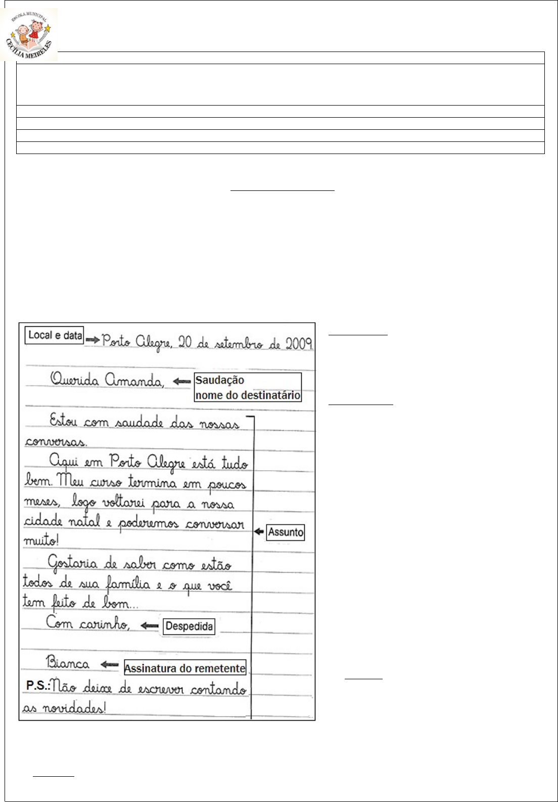 <p>ATIVIDADE PEDAGÓGICA COMPLEMENTAR –APC-</p><p>Escola Municipal Cecilia Meireles – Ensino Fundamental – Fone: 44- 34371766</p><p>E-mail: escmeirelescecilia@hotmail.com</p><p>Componente Curricular: LÍNGUA PORTUGUESA</p><p>Habilidade: PR.EF04LP10. a.4.56 Ler e compreender, com certa autonomia, cartas pessoais de reclamação, dentre outros gêneros do Campo da Vida Cotidiana, de acordo com as convenções do gênero carta, de modo a considerar a situação comunicativa e o tema/assunto/finalidade do texto e compreender as características</p><p>Semana: 4ª 22/03 até 02/04 Ano: 2021 Turma: 4° C</p><p>Nome do aluno:</p><p>Professor: Gleisse Braz Dias</p><p>Orientação: Após a leitura dos comandos, responda as atividades propostas.</p><p>· Relembrando o gênero textual CARTA PESSOAL</p><p>LOCAL E DATA: Cidade onde a carta foi escrita (utilizar vírgula para separar local da data). Em seguida colocar dia, mês e ano.</p><p>SAUDAÇÂO: Cumprimento inicial. Modo como se cumprimenta o destinatário (pessoa que recebe a carta).</p><p>ASSUNTO: Tema, conteúdo da mensagem.</p><p>DESPEDIDA: Cumprimento final.</p><p>ASSINATURA: Nome do remetente (pessoa que escreveu a carta).</p><p>1) Marque X somente na resposta certa.</p><p>Remetente é a pessoa que...</p><p>( )escreveu a carta</p><p>( )recebeu a carta</p><p>2) Marque X somente na resposta certa.</p><p>Destinatário é a pessoa que...</p><p>( )escreveu a carta</p><p>( )recebeu a carta</p><p>3) De acordo com a carta, anote...</p><p>A) Qual o nome do remetente?</p><p>________________________________</p><p>B) Qual o nome do destinatário?</p><p>_________________________________</p><p>C) Local onde foi escrita a carta?</p><p>_________________________________</p><p>D) De acordo com o assunto da carta, quando Bianca voltará para sua cidade natal (cidade de origem)?</p><p>_________________________________</p><p>_________________________________</p><p>4) Circule na carta, com lápis de cor, o modo de cumprimento da saudação.</p><p>5) Caso o remetente assinou e esqueceu de escrever algo no assunto da carta, então pode escrever um “P.S.” no final, ou seja, um lembrete escrito depois.</p><p>Circule na carta, com lápis colorido, a informação que está no P.S.</p><p>Nome: ____________________________________________________________4º C Português</p><p>· Agora veja um exemplo de uma CARTA DE RECLAMAÇÃO</p><p>As formas de comunicação mudaram muito, hoje em dia muitas pessoas se comunicam por mensagens pelo WhatsApp, emojis (imagens), ligações telefônicas. Mas mesmo assim, a carta é muito útil em situações diversas.</p><p>A carta é um dos mais antigos meios de comunicação. É importante saber a estrutura básica.</p><p>Há vários tipos de cartas, dependendo do seu assunto: carta pessoal, carta comercial, carta bancária, carta oficial, carta de reclamação, entre outras.</p><p>VEJAM AGORA AS CARACTERÍSTICAS DA CARTA DE RECLAMAÇÃO,</p><p>6) Circule com lápis colorido a data em que a carta foi escrita.</p><p>7)No corpo do texto são apresentados dois problemas. Complete as frases abaixo e acordo com o texto:</p><p>* Percebi que os carrinhos são usados pelos clientes e... ________________________________________________________________________________________________________________</p><p>* Além disso, os vidros de álcool gel da entrada do mercado estão... ________________________________________________________________________________________________________________</p><p>8) Releia o P.S. (Lembrete) e marque F (falso) ou V (verdadeiro)</p><p>( ) É dever de todos os cidadãos cuidar das formas de prevenção ao coronavírus.</p><p>( ) Os cidadãos podem fazer o que quiser e não precisa se prevenir.</p><p>( ) Os estabelecimentos comerciais também dever cuidar das formas de prevenção ao coronavírus.</p><p>( ) A parte do P.S (Lembrete) aparece no início da carta.</p><p>( ) A parte do P.S (Lembrete) aparece no final da carta.</p><p>9) Escreva o que se pede...</p><p>A) Quem é o destinatário dessa carta de reclamação:____________________________________</p><p>B) Quem é o remetente dessa carta de reclamação:_____________________________________</p><p>10) Agora é com você, imagine que você fosse escrever uma carta de reclamação.</p><p>Para quem escreveria? Qual seria sua reclamação?</p><p>_____________________________________________________________________________________________________________________________________________________________________________________________________________________________________________</p><p>Nome: ___________________________________________________________4º C Português</p><p>· ORDEM ALFABÉTICA</p><p>A-B-C-D-E-F-G-H-I-J-K-L-M-N-O-P-Q-R-S-T-U-V-W-X-Y-Z</p><p>A organização das palavras em ORDEM ALFABÉTICA é muito importante.</p><p>Podemos organizar listas de presença, listas telefônicas, a lista de chamada da escola, o dicionário e vários outros documentos.</p><p>· OBSERVANDO A PRIMEIRA LETRA DA PALAVRA: Cavalo, Águia, Ema, Girafa, Dragão;Águia, Cavalo, Dragão, Ema, Girafa</p><p>Fica assim:</p><p>· OBSERVANDO TAMBÉM A SEGUNDA LETRA. ISSO ACONTECE QUANDO A PRIMEIRA LETRA É IGUAL EM TODAS AS PALAVRAS, ENTÃO É PRECISO OLHAR A SEGUNDA LETRA:</p><p>ÁGuia, ARara, AVestruz, ABelha, ASno;ABelha, ÁGuia, ARara, ASno, AVestruz,</p><p>Fica assim:</p><p>11) AGORA É A SUA VEZ!!!</p><p>a) Reescreva as palavras do quadro abaixo em ordem alfabética observando a primeira letra:NINHO – CAMELO – RAZÃO- ÚLTIMO – AMOR- SOL – QUEIJO – FLAUTA – ENSINO – HOJE – VAGÃO – LIVRO – DOURADO - JABUTI</p><p>________________________________________________________________________________________________________________________________________________________________________________________________________________________________________________________________________________________________________________________________________________________</p><p>b