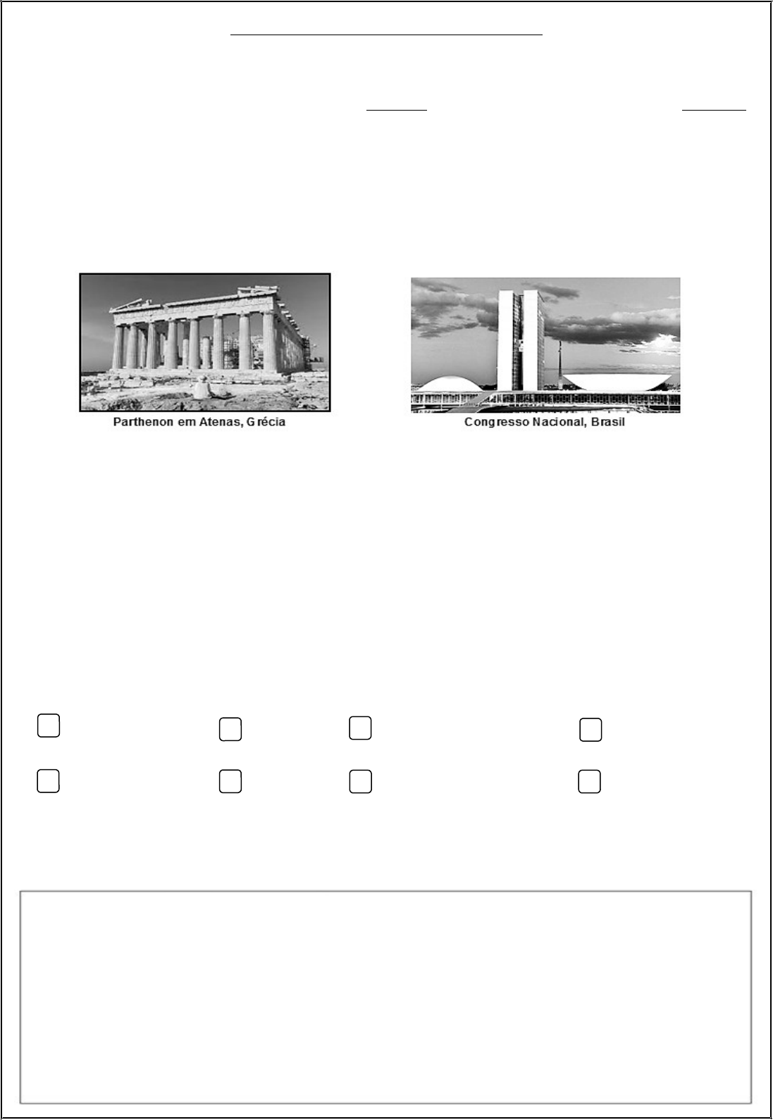 <p>Patrimônio cultural material e imaterial</p><p>Os povos antigos deixaram muitas contribuições: a forma de organizar o tempo, as obras de arte, os bens arquitetônicos (construções), a culinária, música, dança, religiosa e muito mais.</p><p>O patrimônio cultural se divide entre material (estruturas físicas, objetos) e imaterial (manifestação culturais, práticas, saberes, modos de fazer). Esse conhecimento chega até nós trazendo marcas do passado e colaborando para formar a cultura do presente.</p><p>As obras arquitetônicas são exemplos de bens que fazem parte do patrimônio material e que são legados culturais. Um exemplo é o Parthenon, templo dedicado à deusa Atena e construído há 2.500 anos. A forma de construção das colunas foi especialmente desenvolvida pelos antigos gregos e as colunas foram inspiração para a arquitetura ao longo da História.</p><p>A arquitetura também pode ser um símbolo da política, como exemplo o Congresso Nacional, que fica em Brasília e foi projetado pelo arquiteto Oscar Niemeyer.</p><p>1) Quais contribuições os povos antigos deixaram?</p><p>__________________________________________________________________________________________________________________________________________________________________________________________________________________________________________</p><p>2) O patrimônio histórico se divide entre material e imaterial. Explique cada um.</p><p>A) material: ___________________________________________________________________________</p><p>_____________________________________________________________________________________</p><p>B) imaterial: __________________________________________________________________________</p><p>_____________________________________________________________________________________</p><p>3) Marque X somente nas palavras que representam patrimônio material.</p><p>danças. música contação de história prédios</p><p>arquitetura livros escultura brinquedos</p><p>4) Circule, com lápis colorido, somente a figura do patrimônio histórico material que foi projetado pelo arquiteto Oscar Niemeyer.</p><p>5) Escreva o nome de um patrimônio material de Amaporã e desenhe.</p><p>COMPONENTE CURRICULAR: HISTÓRIA</p><p>CONTEÚDO: PATRIMÔNIOS HISTÓRICOS E CULTURAIS - MATERIAIS E IMATERIAIS.</p><p>Patrimônios históricos imateriais</p><p>Além dos patrimônios materiais, existem também os patrimônios imateriais, que são representados através das manifestação culturais, práticas, saberes, modos de fazer.</p><p>A capoeira, se caracteriza como imaterial, é uma expressão cultural brasileira de origem afro-brasileira, que compreende os elementos: arte-marcial, esporte, cultura popular, e música. Hoje é considerada um dos maiores símbolos da cultura brasileira.</p><p>O frevo também faz parte da cultura imaterial. É um ritmo musical e uma dança brasileira com origem no estado de Pernambuco, as características do frevo são: passos de dança com ritmo acelerado, roupas coloridas e o uso da sombrinha também colorida como acessório.</p><p>Fonte: Buriti mais: história, 5º Ano. Pág. 132-133 (adaptação)</p><p>1) Como são representados os patrimônios históricos imateriais?</p><p>____________________________________________________________________________________________________________________________________________________________</p><p>2) O que é frevo?</p><p>____________________________________________________________________________________________________________________________________________________________</p><p>3) Quais são as características do frevo?</p><p>__________________________________________________________________________________________________________________________________________________________________________________________________________________________________________</p><p>4) Em qual estado brasileiro o frevo teve origem? ____________________________________</p><p>5) Qual a origem da capoeira?</p><p>( ) portuguesa ( ) afro-brasileira ( ) espanhola ( ) japonesa ( ) francesa</p><p>6)Contorne com lápis colorido a figura que representa o patrimônio histórico imaterial da capoeira.</p><p>image1.png</p><p>image2.png</p><p>image3.png</p>