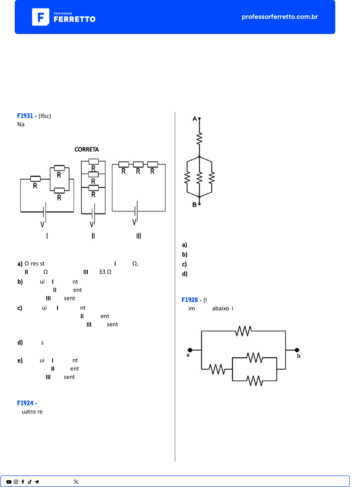 <p>Vestibulares</p><p>Eletrodinâmica</p><p>Associação de Resistores</p><p>F1931 - (Ifsc)</p><p>Na figura abaixo, são apresentados três circuitos com</p><p>resistores de 1,0 Ω cada e bateria de 3,0 V. Com base nos</p><p>seus conhecimentos sobre associação de resistores,</p><p>assinale a proposição CORRETA.</p><p>a) O resistor equivalente do circuito I é 1,5 Ω, no circuito</p><p>II é 3,0 Ω e no circuito III é 0,33 Ω.</p><p>b) O circuito I apresenta uma associação mista, enquanto</p><p>o circuito II apresenta uma associação em série e o</p><p>circuito III apresenta uma associação em paralelo.</p><p>c) O circuito I apresenta uma associação em série,</p><p>enquanto o circuito II apresenta uma associação em</p><p>paralelo e o circuito III apresenta uma associação</p><p>mista.</p><p>d) Os três circuitos, por possuírem os mesmos resistores</p><p>e a mesma d.d.p., dissipam a mesma potência.</p><p>e) O circuito I apresenta uma associação mista, enquanto</p><p>o circuito II apresenta uma associação em paralelo e o</p><p>circuito III apresenta uma associação em série.</p><p>F1924 - (Ifsul)</p><p>Quatro resistores, todos de mesma Resistência Elétrica R,</p><p>são associados entre os pontos A e B de um circuito</p><p>elétrico, conforme a configuração indicada na figura.</p><p>A resistência elétrica equivalente entre os pontos A e B é</p><p>igual a</p><p>a) R/4</p><p>b) 3R/4</p><p>c) 4R/3</p><p>d) 4R</p><p>F1928 - (Ifsul)</p><p>A imagem abaixo ilustra a associação de resistores em</p><p>um circuito misto.</p><p>Considerando que todos os resistores possuem a mesma</p><p>resistência elétrica R, a resistência equivalente da</p><p>associação é igual a</p><p>1@professorferretto @prof_ferretto</p><p>a) R</p><p>b) 4R</p><p>c) 3R/5</p><p>d) 4R/3</p><p>F0472 - (Ufsm)</p><p>Em uma instalação elétrica domés�ca, as tomadas são</p><p>ligadas em __________________ para que a mesma</p><p>_________________________ em todos os</p><p>eletrodomés�cos ligados a essa instalação.</p><p>Assinale a alterna�va que completa as lacunas, na</p><p>ordem.</p><p>a) paralelo – tensão seja aplicada</p><p>b) paralelo – corrente circule</p><p>c) paralelo – potência atue</p><p>d) série – tensão seja aplicada</p><p>e) série – corrente circule</p><p>F1921 - (Pucrs)</p><p>Dois resistores ôhmicos de resistências elétricas R1 e R2</p><p>são associados em série, e a associação é ligada aos</p><p>extremos de uma bateria considerada ideal. Sabe-se que</p><p>o valor da resistência elétrica de R2 é quatro vezes menor</p><p>do que o valor da resistência elétrica de R1. Caso a</p><p>intensidade da corrente elétrica no resistor R1 seja igual a</p><p>2 A, qual dos valores abaixo representa corretamente a</p><p>intensidade da corrente elétrica, em ampères (A), no</p><p>resistor R2?</p><p>a) 4</p><p>b) 2</p><p>c) 1</p><p>d) 0,5</p><p>e) 0,25</p><p>F1148 - (Uece)</p><p>Considerando dois resistores, R1 = 2Ω e R2 = 3Ω, ligados</p><p>em série e com os terminais livres da associação</p><p>conectados aos polos de uma bateria, pode-se afirmar</p><p>corretamente que</p><p>a) a corrente elétrica nos dois resistores é igual e a</p><p>tensão elétrica é maior em R1.</p><p>b) a corrente elétrica nos dois resistores é igual e a</p><p>tensão elétrica é maior em R2.</p><p>c) a corrente elétrica é maior em R1 e a tensão elétrica é</p><p>igual nos dois.</p><p>d) a corrente elétrica é maior em R2 e a tensão elétrica é</p><p>igual nos dois.</p><p>F1146 - (Ifsul)</p><p>Três resistores ôhmicos, R1 = 2Ω, R2 = 4Ω e R3 = 4Ω, estão</p><p>associados em paralelo. Quando ligados a um gerador</p><p>ideal, a corrente elétrica total no circuito é igual a 12 A.</p><p>A corrente elétrica e a diferença de potencial elétrico no</p><p>resistor R1 são iguais a</p><p>a) 12 A e 12 V.</p><p>b) 12 A e 6 V.</p><p>c) 6 A e 12 V.</p><p>d) 6 A e 6 V.</p><p>F1142 - (Cps)</p><p>Quatro lâmpadas de filamento, idên�cas, são conectadas</p><p>a duas pilhas obedecendo ao circuito elétrico.</p><p>Inicialmente, as quatro lâmpadas encontram-se acesas.</p><p>Se, em dado momento, somente a lâmpada L4 �ver seu</p><p>filamento rompido, apagando-se, é correto concluir que</p><p>Admita que, se apenas uma dessas lâmpadas fosse ligada</p><p>às duas pilhas, ela não se queimaria por sobrecarga.</p><p>a) só L3 permanecerá acesa.</p><p>b) só L1 e L2 permanecerão acesas.</p><p>c) só L1 e L3 permanecerão acesas.</p><p>d) as demais lâmpadas permanecerão acesas.</p><p>e) nenhuma das lâmpadas permanecerá acesa.</p><p>2@professorferretto @prof_ferretto</p><p>F1144 - (Udesc)</p><p>Um resistor de resistência R1 = 10 Ω é ligado em série</p><p>com um resistor de resistência R2 = 35 Ω. Uma fonte de</p><p>tensão de 9 V é ligada a esta associação.</p><p>Assinale a alterna�va que corresponder à corrente</p><p>elétrica no resistor R1 e a diferença de potencial elétrico</p><p>entre as extremidades do resistor R2, respec�vamente.</p><p>a) 0,2 A e 1,4 V</p><p>b) 1,2 A e 4,2 V</p><p>c) 0,5 A e 1,8 V</p><p>d) 0,2 A e 7,0 V</p><p>e) 1,2 A e 1,4 V</p><p>F1927 - (Unisc)</p><p>Os seguintes circuitos elétricos têm as mesmas</p><p>resistências valendo cada uma R. Afirma-se que os</p><p>circuitos que tem entre os pontos a e b a menor e a</p><p>maior resistência equivalente são, respec�vamente, os</p><p>seguintes circuitos:</p><p>a) 1 e 2</p><p>b) 3 e 4</p><p>c) 4 e 3</p><p>d) 3 e 2</p><p>e) 2 e 4</p><p>F1932 - (Uece)</p><p>Considere um fio condutor, fabricado com uma liga</p><p>metálica que confere uma determinada resistência</p><p>elétrica proporcional ao comprimento do fio e com pouca</p><p>variação em função da temperatura ( ± 1 ˚C). A</p><p>configuração que produz a mesma resistência</p><p>equivalente a uma peça de 2 m de fio é</p><p>a) 2 peças de 4 m ligadas em paralelo.</p><p>b) 2 peças de 4 m ligadas em série.</p><p>c) 4 peças de 2 m liga