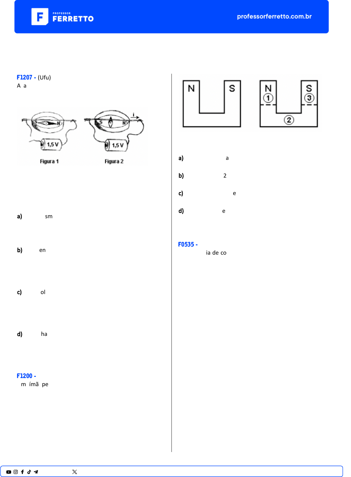 <p>Eletromagnetismo</p><p>F1207 - (Ufu)</p><p>A agulha de uma bússola, inicialmente, aponta para a</p><p>marcação Norte quando não passa corrente pelo fio</p><p>condutor, conforme Figura1.</p><p>Ao ligar as extremidades do fio condutor a uma pilha, por</p><p>onde passa uma corrente, a agulha muda de direção,</p><p>conforme Figura 2. Com base neste experimento, é</p><p>correto afirmar que</p><p>a) magne�smo e eletricidade são fenômenos</p><p>completamente independentes no campo da �sica; o</p><p>que ocorre é uma interação entre o fio e a agulha,</p><p>independente de haver ou não corrente.</p><p>b) a corrente elétrica cria um campo magné�co de forma</p><p>que a agulha da bússola é alinhada na direção do</p><p>campo magné�co resultante. Este é o campo</p><p>magné�co da Terra somado, vetorialmente, ao campo</p><p>magné�co criado pela corrente que percorre o fio.</p><p>c) a bússola funciona devido aos polos geográficos, não</p><p>tendo relação alguma com o campo magné�co da</p><p>Terra. A mudança de posição da agulha acontece pelo</p><p>fato de o fio alterar a posição dos polos geográficos da</p><p>Terra.</p><p>d) a agulha muda de direção porque existe uma força</p><p>coulombiana repulsiva entre os elétrons do fio e os</p><p>elétrons da agulha, conhecida como lei de Coulomb.</p><p>F1200 - (Pucmg)</p><p>Um ímã permanente, em forma de "ferradura", cujos</p><p>polos norte e sul estão indicados na figura a seguir, é</p><p>dividido em três partes.</p><p>É CORRETO concluir que:</p><p>a) a parte 1 terá apenas o polo norte e a parte 2 terá</p><p>apenas o polo sul.</p><p>b) as partes 1 e 2 formarão novos ímãs, mas a parte 3</p><p>não.</p><p>c) as partes 1, 2 e 3 perderão suas propriedades</p><p>magné�cas.</p><p>d) as partes 1, 2 e 3 formarão três novos ímãs, cada uma</p><p>com seus polos norte e sul.</p><p>F0535 - (Enem)</p><p>A tecnologia de comunicação da e�queta RFID (chamada</p><p>de e�queta inteligente) é usada há anos para rastrear</p><p>gado, vagões de trem, bagagem aérea e carros nos</p><p>pedágios. Um modelo mais barato dessas e�quetas pode</p><p>funcionar sem baterias e é cons�tuído por três</p><p>componentes: um microprocessador de silício; uma</p><p>bobina de metal, feita de cobre ou de alumínio, que é</p><p>enrolada em um padrão circular; e um encapsulador, que</p><p>é um material de vidro ou polímero envolvendo o</p><p>microprocessador e a bobina. Na presença de um campo</p><p>de radiofrequência gerado pelo leitor, a e�queta</p><p>transmite sinais. A distância de leitura é determinada</p><p>pelo tamanho da bobina e pela potência da onda de</p><p>rádio emi�da pelo leitor.</p><p>Disponível em: h�p:eleletronicos.hsw.uol.com.br. Acesso</p><p>em: 27 fev. 2012 (adaptado).</p><p>A e�queta funciona sem pilhas porque o campo:</p><p>1@professorferretto @prof_ferretto</p><p>a) elétrico da onda de rádio agita elétrons da bobina.</p><p>b) elétrico da onda de rádio cria uma tensão na bobina.</p><p>c) magné�co da onda de rádio induz corrente na bobina.</p><p>d) magné�co da onda de rádio aquece os fios da bobina.</p><p>e) magné�co da onda de rádio diminui a ressonância no</p><p>interior da bobina.</p><p>F0498 - (Ifmg)</p><p>Em relação às propriedades e aos comportamentos</p><p>magné�cos dos ímãs, das bússolas e do nosso planeta, é</p><p>correto afirmar que</p><p>a) a agulha de uma bússola inverte seu sen�do ao cruzar</p><p>a linha do Equador.</p><p>b) um pedaço de ferro é atraído pelo polo norte de um</p><p>ímã e repelido pelo polo sul.</p><p>c) as propriedades magné�cas de um ímã perdem-se</p><p>quando ele é cortado ao meio.</p><p>d) o polo norte geográfico da Terra corresponde,</p><p>aproximadamente, ao seu polo sul magné�co.</p><p>F1337 - (Unesp)</p><p>O microfone é um disposi�vo capaz de converter ondas</p><p>sonoras em sinais elétricos, transmi�ndo informações</p><p>para um alto-falante ou um gravador. Ele é cons�tuído</p><p>por uma membrana oscilante, uma bobina e um ímã.</p><p>Quando ondas sonoras a�ngem a membrana oscilante,</p><p>ela passa a vibrar, fazendo a bobina oscilar com a mesma</p><p>frequência das ondas na região onde atua o campo</p><p>magné�co criado pelo ímã do microfone, gerando uma</p><p>corrente elétrica induzida.</p><p>Essa corrente é produzida devido ao fato de a vibração da</p><p>bobina</p><p>a) provocar a separação dos polos norte e sul do ímã do</p><p>microfone, gerando uma corrente elétrica induzida</p><p>entre esses dois polos.</p><p>b) provocar uma variação do fluxo magné�co através</p><p>dela, gerando uma tensão elétrica e,</p><p>consequentemente, uma corrente elétrica induzida.</p><p>c) eliminar a tensão elétrica provocada pelo ímã do</p><p>microfone, criando uma corrente elétrica constante e</p><p>transformando energia mecânica em elétrica.</p><p>d) causar uma variação na constante elás�ca da</p><p>membrana oscilante, transformando ondas sonoras</p><p>em sinais elétricos.</p><p>e) gerar uma variação do comprimento do fio a ser</p><p>percorrido pela corrente, modificando sua resistência</p><p>elétrica e possibilitando o movimento dos elétrons</p><p>desse fio.</p><p>F1191 - (Mackenzie)</p><p>Considere as seguintes afirmações.</p><p>I. Quando se coloca um ímã em contato com limalha</p><p>(fragmentos) de ferro, estes não aderem a ele em toda a</p><p>sua extensão, mas predominantemente nas regiões</p><p>próximas das extremidades.</p><p>II. Cortando-se um ímã em duas partes iguais, que por</p><p>sua vez podem ser redivididas em outras tantas, observa-</p><p>se que cada uma dessas partes cons�tui um novo ímã,</p><p>que embora menor tem sempre dois polos.</p><p>III. Polos de mesmo nome se atraem e de nomes</p><p>diferentes se repelem.</p><p>Com relação às afirmações, podemos dizer que</p><p>a) apenas I é correta.</p><p>b) apenas I e II são 