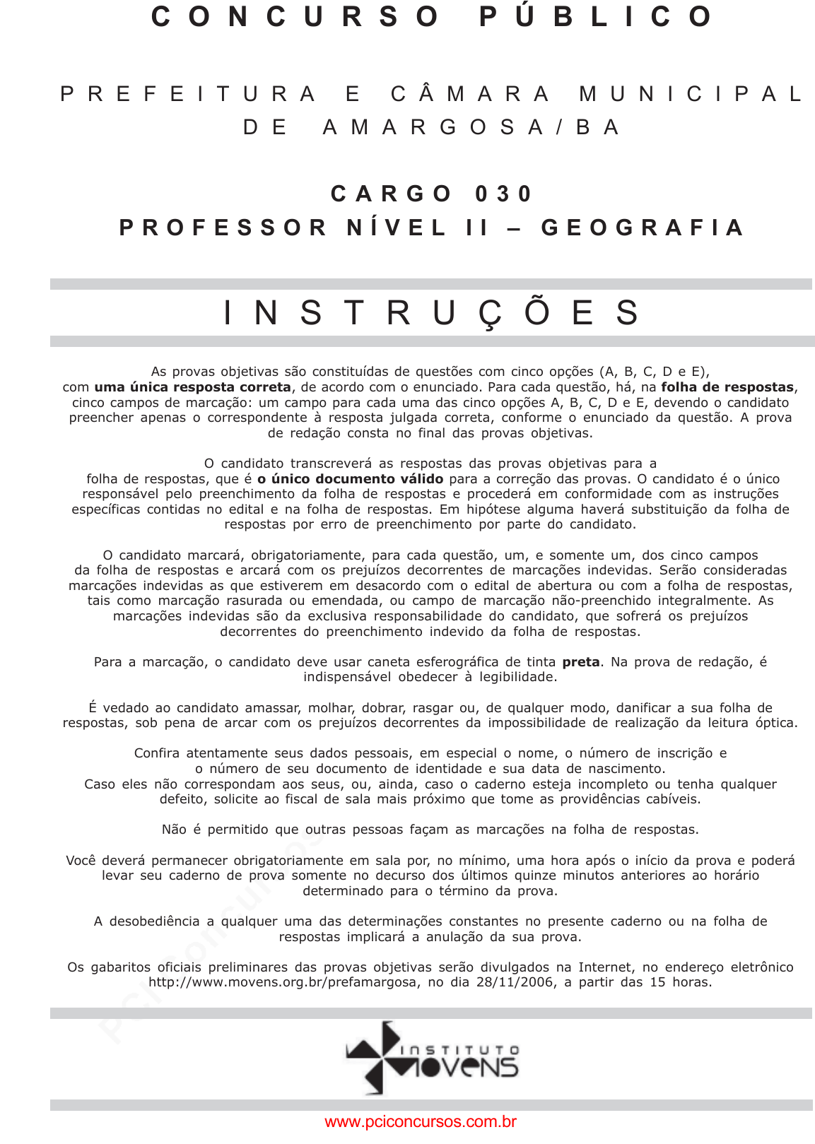 <p>pcimarkpci MDAwMDowMDAwOjAwMDA6MDAwMDowMDAwOmZmZmY6YjEzMzo0OWY3:U3VuLCAyMCBPY3QgMjAyNCAyMzoxNjoyNyAtMDMwMA==</p><p>www.pciconcursos.com.br</p><p>C O N C U R S O P Ú B L I C O</p><p>P R E F E I T U R A E C Â M A R A M U N I C I P A L</p><p>D E A M A R G O S A / B A</p><p>C A R G O 0 3 0</p><p>P R O F E S S O R N Í V E L I I – G E O G R A F I A</p><p>I N S T R U Ç Õ E S</p><p>As provas objetivas são constituídas de questões com cinco opções (A, B, C, D e E),</p><p>com uma única resposta correta, de acordo com o enunciado. Para cada questão, há, na folha de respostas,</p><p>cinco campos de marcação: um campo para cada uma das cinco opções A, B, C, D e E, devendo o candidato</p><p>preencher apenas o correspondente à resposta julgada correta, conforme o enunciado da questão. A prova</p><p>de redação consta no final das provas objetivas.</p><p>O candidato transcreverá as respostas das provas objetivas para a</p><p>folha de respostas, que é o único documento válido para a correção das provas. O candidato é o único</p><p>responsável pelo preenchimento da folha de respostas e procederá em conformidade com as instruções</p><p>específicas contidas no edital e na folha de respostas. Em hipótese alguma haverá substituição da folha de</p><p>respostas por erro de preenchimento por parte do candidato.</p><p>O candidato marcará, obrigatoriamente, para cada questão, um, e somente um, dos cinco campos</p><p>da folha de respostas e arcará com os prejuízos decorrentes de marcações indevidas. Serão consideradas</p><p>marcações indevidas as que estiverem em desacordo com o edital de abertura ou com a folha de respostas,</p><p>tais como marcação rasurada ou emendada, ou campo de marcação não-preenchido integralmente. As</p><p>marcações indevidas são da exclusiva responsabilidade do candidato, que sofrerá os prejuízos</p><p>decorrentes do preenchimento indevido da folha de respostas.</p><p>Para a marcação, o candidato deve usar caneta esferográfica de tinta preta. Na prova de redação, é</p><p>indispensável obedecer à legibilidade.</p><p>É vedado ao candidato amassar, molhar, dobrar, rasgar ou, de qualquer modo, danificar a sua folha de</p><p>respostas, sob pena de arcar com os prejuízos decorrentes da impossibilidade de realização da leitura óptica.</p><p>Confira atentamente seus dados pessoais, em especial o nome, o número de inscrição e</p><p>o número de seu documento de identidade e sua data de nascimento.</p><p>Caso eles não correspondam aos seus, ou, ainda, caso o caderno esteja incompleto ou tenha qualquer</p><p>defeito, solicite ao fiscal de sala mais próximo que tome as providências cabíveis.</p><p>Não é permitido que outras pessoas façam as marcações na folha de respostas.</p><p>Você deverá permanecer obrigatoriamente em sala por, no mínimo, uma hora após o início da prova e poderá</p><p>levar seu caderno de prova somente no decurso dos últimos quinze minutos anteriores ao horário</p><p>determinado para o término da prova.</p><p>A desobediência a qualquer uma das determinações constantes no presente caderno ou na folha de</p><p>respostas implicará a anulação da sua prova.</p><p>Os gabaritos oficiais preliminares das provas objetivas serão divulgados na Internet, no endereço eletrônico</p><p>http://www.movens.org.br/prefamargosa, no dia 28/11/2006, a partir das 15 horas.</p><p>www.pciconcursos.com.br</p><p>pcimarkpci MDAwMDowMDAwOjAwMDA6MDAwMDowMDAwOmZmZmY6YjEzMzo0OWY3:U3VuLCAyMCBPY3QgMjAyNCAyMzoxNjoyNyAtMDMwMA==</p><p>www.pciconcursos.com.br</p><p>Concurso Público - Prefeitura e Câmara Municipal de Amargosa/BA</p><p>2 Professor Nível II – Disciplina: Geografia</p><p>PROVA DE CONHECIMENTOS</p><p>ESPECÍFICOS</p><p>01. Suponha que são 9h em Salvador, cidade</p><p>localizada no 2.º fuso brasileiro, e que você,</p><p>estando naquela cidade, precisa planejar</p><p>uma ligação interurbana para uma pessoa</p><p>que se encontra em Rio Branco, Acre, que</p><p>está localizada a oeste de Salvador, no 4.º</p><p>fuso brasileiro. A pessoa só poderá ser</p><p>encontrada às 11h, hora local deste estado.</p><p>Você deve</p><p>(A) aguardar duas horas para fazer sua ligação.</p><p>(B) aguardar que sejam 11h em Brasília, hora</p><p>oficial do país.</p><p>(C) fazer sua ligação imediatamente.</p><p>(D) telefonar quando forem 12h em Salvador.</p><p>(E) ligar às 13h, horário de Salvador.</p><p>02. “O IBGE – Instituto Brasileiro de Geografia</p><p>e Estatística – tem como uma de suas</p><p>atribuições elaborar divisões regionais do</p><p>território brasileiro, com finalidade de</p><p>viabilizar a agregação e divulgação de dados</p><p>estatísticos”. A divisão regional evoluiu em</p><p>decorrência das transformações no espaço</p><p>brasileiro. Em 1970, foram definidas as</p><p>macrorregiões, conforme o mapa abaixo.</p><p>(Fonte: IBGE/2006)</p><p>A respeito da aplicabilidade das regionalizações</p><p>de um território, assinale Falso (F) ou</p><p>Verdadeiro (V).</p><p>I – Podem ser utilizadas para elaboração de</p><p>políticas públicas.</p><p>II – Subsidiam o sistema de decisões quanto à</p><p>localização de atividades econômicas.</p><p>III – Subsidiam o planejamento das estruturas</p><p>espaciais como, por exemplo, as regiões</p><p>metropolitanas.</p><p>IV – Tornam mais complexo o estudo e a</p><p>identificação das estruturas espaciais de</p><p>aglomerações urbanas e rurais.</p><p>V – Têm por base, no mapa, as características</p><p>geoeconômicas e a formação histórico-</p><p>econômica do Brasil.</p><p>São verdadeiros apenas os itens</p><p>(A) I, II e III.</p><p>(B) I, IV e V.</p><p>(C) II e III.</p><p>(D) III e V.</p><p>(E) IV e V.</p><p>03. Leia o texto para responder à questão.</p><p>[...] Berçário de diversas espécies marinhas e</p><p>donas de uma flora variadíssima, as regiões de mangue</p><p>estão sendo devastadas pela criação de 