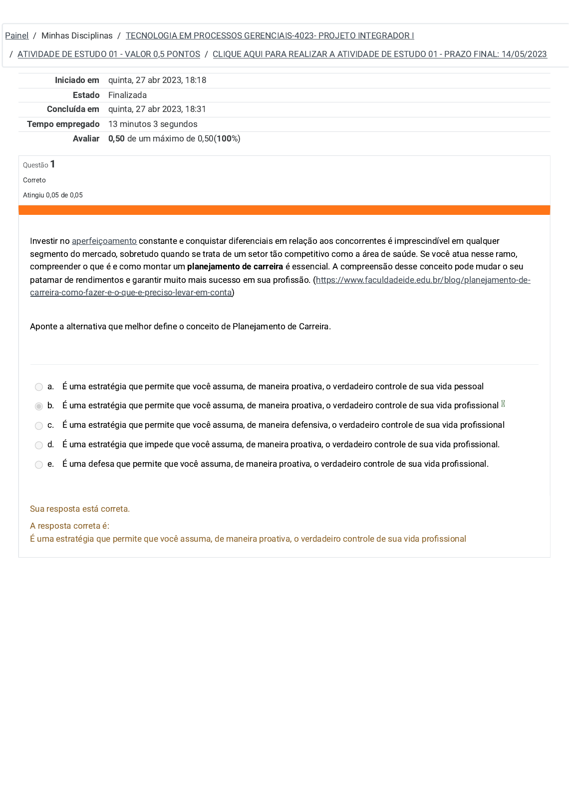 Painel / Minhas Disciplinas / TECNOLOGIA EM PROCESSOS GERENCIAIS-4023- PROJETO INTEGRADOR / ATIVIDADE DE ESTUDO 01 VALOR 0,5 PONTOS / CLIQUE AQUI PARA REALIZAR A ATIVIDADE DE ESTUDO 01 PRAZO FINAL: 14/05/2023 Iniciado em quinta, 27 abr 2023, 18:18 Estado Finalizada Concluída em quinta, 27 abr 2023, 18:31 Tempo empregado 13 minutos 3 segundos Avaliar 0,50 de um máximo de 0,50(100%) Questão 1 Correto Atingiu 0,05 de 0,05 Investir no aperfeiçoamento constante e conquistar diferenciais em relação aos concorrentes é imprescindível em qualquer segmento do mercado, sobretudo quando se trata de um setor tão competitivo como a área de saúde. Se você atua nesse ramo, compreender o que é e como montar um planejamento de carreira é essencial. A compreensão desse conceito pode mudar o seu patamar de rendimentos e garantir muito mais sucesso em sua profissão. Aponte a alternativa que melhor define o conceito de Planejamento de Carreira. a. É uma estratégia que permite que você assuma, de maneira proativa, o verdadeiro controle de sua vida pessoal b. É uma estratégia que permite que você assuma, de maneira proativa, o verdadeiro controle de sua vida profissional X C. É uma estratégia que permite que você assuma, de maneira defensiva, o verdadeiro controle de sua vida profissional d. É uma estratégia que impede que você assuma, de maneira proativa, o verdadeiro controle de sua vida profissional. e. É uma defesa que permite que você assuma, de maneira proativa, o verdadeiro controle de sua vida profissional. Sua resposta está correta. A resposta correta é: É uma estratégia que permite que você assuma, de maneira proativa, verdadeiro controle de sua vida profissional