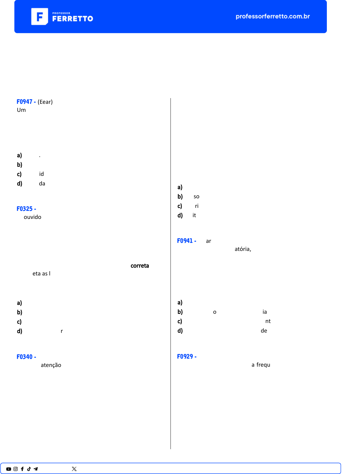 <p>Vestibulares</p><p>Ondulatória</p><p>F0947 - (Eear)</p><p>Um professor de música esbraveja com seu discípulo:</p><p>“Você não é capaz de dis�nguir a mesma nota musical</p><p>emi�da por uma viola e por um violino!”.</p><p>A qualidade do som que permite essa dis�nção à que se</p><p>refere o professor é a (o)</p><p>a) altura.</p><p>b) �mbre.</p><p>c) intensidade.</p><p>d) velocidade de propagação.</p><p>F0325 - (Acafe)</p><p>O ouvido humano é o responsável pelo nosso sen�do</p><p>audi�vo. Ele dis�ngue no som três qualidades que são:</p><p>altura, intensidade e �mbre. A altura é a qualidade que</p><p>permite ao mesmo diferenciar sons graves de sons</p><p>agudos, dependendo somente da frequência do som.</p><p>Considerando os conhecimentos sobre ondas sonoras e o</p><p>exposto acima, assinale a alterna�va correta que</p><p>completa as lacunas das frases a seguir.</p><p>Podemos afirmar que o som será mais _______ quanto</p><p>________ for sua frequência.</p><p>a) grave - maior</p><p>b) agudo - menor</p><p>c) agudo - maior</p><p>d) intenso - maior</p><p>F0340 - (Ifsul)</p><p>Leia com atenção o texto que segue:</p><p>O som é um �po de onda que necessita de um meio para</p><p>se propagar. Quando estamos analisando a produção e a</p><p>captação de uma onda sonora, estamos diante de três</p><p>par�cipantes: a fonte sonora, o meio onde ela se propaga</p><p>e o observador que está captando as ondas. Temos então</p><p>três referenciais bem definidos.</p><p>O �po de onda captada dependerá de como a fonte e o</p><p>observador se movem em relação ao meio de</p><p>propagação da onda. Vamos considerar o meio parado</p><p>em relação ao solo. Neste caso temos ainda três</p><p>situações diferentes: a fonte se movimenta e o</p><p>observador está parado; a fonte está parada e o</p><p>observador está em movimento; a fonte e o observador</p><p>estão em movimento. Nos três casos podemos ter uma</p><p>aproximação ou um afastamento entre a fonte e o</p><p>observador.</p><p>O texto refere-se a um fenômeno ondulatório facilmente</p><p>observado nas ondas sonoras. Esse fenômeno é</p><p>denominado</p><p>a) Superposição.</p><p>b) Ressonância.</p><p>c) Polarização.</p><p>d) Efeito Doppler.</p><p>F0941 - (Eear)</p><p>No estudo de ondulatória, um dos fenômenos mais</p><p>abordados é a reflexão de um pulso numa corda. Quando</p><p>um pulso transversal propagando-se em uma corda</p><p>devidamente tensionada encontra uma extremidade fixa,</p><p>o pulso retorna à mesma corda, em sen�do contrário e</p><p>com</p><p>a) inversão de fase.</p><p>b) alteração no valor da frequência.</p><p>c) alteração no valor do comprimento de onda.</p><p>d) alteração no valor da velocidade de propagação.</p><p>F0929 - (Ufpr)</p><p>O gráfico ao lado apresenta a frequência f de uma onda</p><p>sonora que se propaga num dado meio em função do</p><p>comprimento de onda 𝜆 dessa onda nesse meio.</p><p>1@professorferretto @prof_ferretto</p><p>Com base nesse gráfico, assinale a alterna�va que</p><p>expressa corretamente o módulo da velocidade do som v</p><p>no meio considerado, quando a frequência da onda</p><p>sonora é de 25 Hz.</p><p>a) v = 250 m/s.</p><p>b) v = 340 m/s.</p><p>c) v = 750 m/s.</p><p>d) v = 1.000 m/s.</p><p>e) v = 1.500 m/s.</p><p>F0932 - (Ifsul)</p><p>Considerando os conteúdos estudados sobre Ondas e a</p><p>sua propagação em meios elás�cos, analise as afirma�vas</p><p>abaixo e marque (V) para as verdadeiras e (F) para as</p><p>falsas.</p><p>(__) O som é uma onda mecânica, pois necessita de um</p><p>meio material para se propagar.</p><p>(__) As ondas eletromagné�cas são, sempre, do �po</p><p>transversal.</p><p>(__) Ao sofrer reflexão, a onda luminosa refle�da retorna</p><p>ao meio de origem, portanto a sua velocidade de</p><p>propagação não se altera.</p><p>(__) A capacidade que uma onda tem de contornar</p><p>obstáculos é chamada de polarização.</p><p>A sequência correta é</p><p>a) V – F – F – V</p><p>b) V – V – F – V</p><p>c) F – V – V – F</p><p>d) V – V – V – F</p><p>F0950 - (Pucrs)</p><p>Em relação às ondas sonoras, é correto afirmar:</p><p>a) O fato de uma pessoa ouvir a conversa de seus</p><p>vizinhos de apartamento através da parede da sala é</p><p>um exemplo de reflexão de ondas sonoras.</p><p>b) A qualidade fisiológica do som que permite dis�nguir</p><p>entre um piano e um violino, tocando a mesma nota, é</p><p>chamada de �mbre e está relacionada com a forma da</p><p>onda.</p><p>c) Denominam-se infrassom e ultrassom as ondas</p><p>sonoras cujas frequências estão compreendidas entre</p><p>a mínima e a máxima percebidas pelo ouvido humano.</p><p>d) A grandeza �sica que diferencia o som agudo, emi�do</p><p>por uma flauta, do som grave, emi�do por uma tuba,</p><p>é a amplitude da onda.</p><p>e) A propriedade das ondas sonoras que permite aos</p><p>morcegos localizar obstáculos e suas presas é</p><p>denominada refração.</p><p>F0931 - (Ifsul)</p><p>Considerando o estudo sobre Ondas e os fenômenos</p><p>ondulatórios, analise as afirmações abaixo.</p><p>I. No fenômeno da reflexão das ondas, o ângulo formado</p><p>entre o raio de onda incidente e a reta normal à</p><p>super�cie, é sempre igual ao ângulo formado entre o raio</p><p>de onda refle�do e a reta normal à super�cie.</p><p>II. No fenômeno da refração, a onda passa de um meio</p><p>para outro, mas a sua velocidade não se altera, o que faz</p><p>com que o seu comprimento de onda permaneça o</p><p>mesmo.</p><p>III. No fenômeno da difração, as ondas têm a capacidade</p><p>de contornar obstáculos ou fendas.</p><p>IV. No fenômeno da polarização das ondas, a direção de</p><p>vibração é perpendicular à direção de propagação e</p><p>ocorre com ondas longitudinais.</p><p>Estão corretas apenas as afirma�vas</p><p>a) I e II.</p><p>b) II, III e IV.</p><p>c) 