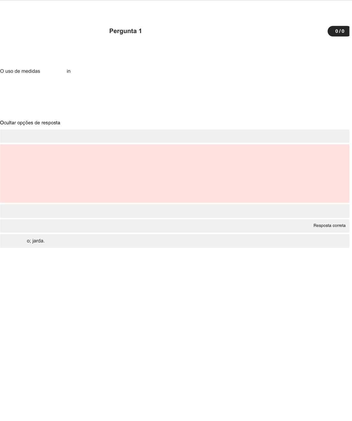 <p>Conteúdo do exercício</p><p>Ocultar opções de resposta</p><p>Pergunta 1 0 / 0</p><p>O uso de medidas do sistema inglês ainda vigora, pois diversas máquinas, equipamentos, instrumentos e componentes são produzidos usando esse sistema.</p><p>O sistema inglês de medidas é tradicionalmente muito empregado na Inglaterra e nos Estados Unidos. Embora no Brasil, o sistema métrico seja o oficial, o</p><p>sistema inglês possui uma relevância principalmente na área metalmecânica, devido à grande quantidade de importação de máquinas, equipamentos e</p><p>ferramentas, assim como empresas instaladas no Brasil oriundas desses países.</p><p>Com base nesse contexto apresentado, quais dessas unidades de medida são usadas até hoje?</p><p>braço; dedo; pé.</p><p>Incorreta:</p><p>polegada; palma; pé.</p><p>dedo; polegada; jarda.</p><p>Resposta corretapolegada; pé; jarda.</p><p>braço; dedo; jarda.</p><p>Comentários</p><p>Ocultar opções de resposta</p><p>polegada; pé; jarda.</p><p>Pergunta 2 0 / 0</p><p>Como regra prática, nas conversões de unidade do sistema inglês para o sistema internacional considera-se que 1” (polegada) equivale a 25,4 mm. Considere</p><p>as medidas 11/16", 2. 3/4", 15/16".</p><p>As medidas apresentadas, quais valem respectivamente em milímetro (mm)?</p><p>19,525 mm -- 67,870 mm -- 21,320 mm</p><p>Comentários</p><p>17,462 mm -- 67,870 mm -- 23,812 mm</p><p>Incorreta:</p><p>18,650 mm -- 68,750 mm -- 24,812 mm</p><p>Resposta correta17,462 mm -- 69,850 mm -- 23,812 mm</p><p>19,525 mm -- 69,850 mm -- 24,812 mm</p><p>17,462 mm -- 69,850 mm -- 23,812 mm</p><p>Ocultar opções de resposta</p><p>Pergunta 3 0 / 0</p><p>Umas das características da unidade de graus Fahrenheit é que o ponto de fusão da água é de 32 °F e seu ponto de ebulição é de 212 °F. Confrontando a</p><p>proporcionalidade com o graus Celsius é para cada 1,8 °F equivale a 1 °C. O zero absoluto nesta escala é definido em - 459,67 °F. Quanto equivale uma</p><p>temperatura da água a um estado vaporizado em uma temperatura de 250 °C para °F?</p><p>4,82 ºF</p><p>482 ºF</p><p>Resposta correta4820 ºF</p><p>Incorreta:</p><p>0,482 ºF</p><p>48,2 ºF</p><p>Comentários</p><p>4820 ºF</p><p>Pergunta 4 0 / 0</p><p>O metro possui variações dos múltiplos e submúltiplos.</p><p>I. 4,32 Km para dm.</p><p>II. 43,25 hm para mm.</p><p>III. 0,5 cm para m.</p><p>IV. 80,5 m para dam.</p><p>V. 0,45 mm para dm.</p><p>Considere as medidas propostas, assinale a alternativa que se refere as transformações corretas.</p><p>Ocultar opções de resposta</p><p>Comentários</p><p>I. 432000 dm; II. 432500 mm; III. 0,005m; IV. 0,805dam; V. 0,045dm.</p><p>Incorreta:</p><p>I. 43200 dm; II. 4325000 mm; III. 0,05m; IV. 8,05dam; V. 0,0045dm.</p><p>I. 43200 dm; II. 43250000 mm; III. 0,005m; IV. 8,05dam; V. 0,0045dm.</p><p>I. 432000 dm; II. 4325000 mm; III. 0,0005m; IV. 8,05dam; V. 0,0045dm.</p><p>Resposta corretaI. 43200 dm; II. 4325000 mm; III. 0,005m; IV. 8,05dam; V. 0,0045dm.</p><p>I. 43200 dm; II. 4325000 mm; III. 0,005m; IV. 8,05dam; V. 0,0045dm.</p><p>Ocultar opções de resposta</p><p>Pergunta 5 0 / 0</p><p>A importância da grafia das unidades de medida, devem ser seguidas algumas regras, para evitar problemas referentes à incorrência em projetos, em</p><p>fabricação de peças, em sistemas de controle, entre outros.</p><p>Diante dessa questão é correto afirmar.</p><p>No emprego da grafia correta na unidade de temperatura grau Kelvin, igualmente das unidades de graus Celsius e graus Fahrenheit.</p><p>Incorreta:</p><p>Não deve haver espaçamento entre o número e o seu símbolo deve ser usado, para evitar casos de</p><p>possibilidade de fraude, preservando o não acréscimo de outro algarismo entre o número e seu símbolo.</p><p>O emprego de letras maiúsculas no início das unidades de medida, que possuam nomes de cientistas, como Newton, Kelvin, Ampere, entre outros.</p><p>A unidade que estiver composta de um prefixo, deve usar hífen e espaço como, por exemplo, mega – pascal, giga – newton, entre outros, mesmo que esta</p><p>ação contrarie o Novo Acordo Ortográfico da Língua Portuguesa.</p><p>Resposta corretaQuando a uma unidade de medida com denominador como, por exemplo, m/s deve-se incluir a palavra por metro por segundo.</p><p>Comentários</p><p>Ocultar opções de resposta</p><p>Quando a uma unidade de medida com denominador como, por exemplo, m/s deve-se incluir a palavra por metro por segundo.</p><p>Pergunta 6 0 / 0</p><p>A regra de conversões de unidade do sistema métrico para o sistema inglês aplica-se que cada 25,4 mm equivale a uma 1” (polegada).</p><p>Considere as medidas de 61,9125 mm, 38,100 mm, 77,7875 mm.</p><p>As medidas apresentadas, quais valem respectivamente em polegada fracionária?</p><p>2. 3/4". -- 1. 7/8”. -- 3. 1/16”.</p><p>Comentários</p><p>2. 3/4". -- 1.7/8”. -- 3. 1/2".</p><p>Incorreta:</p><p>2. 7/16”. -- 1.3/4”. -- 3. 1/2".</p><p>Resposta correta2. 7/16”. -- 1.1/2". -- 3. 1/16”.</p><p>2. 7/16”. -- 1.3/4”. -- 3. 1/8”.</p><p>2. 7/16”. -- 1.1/2". -- 3. 1/16”.</p><p>Ocultar opções de resposta</p><p>Pergunta 7 0 / 0</p><p>Como a utilização de medidas do sistema inglês ainda vigora, pois diversas máquinas, equipamentos, instrumentos e componentes são produzidos com</p><p>medidas em polegada fracionária ou com polegada milesimal. Para tanto, necessita conhecer as suas conversões para outros sistemas. Considere as medidas</p><p>13/16", 1. 1/4", 15/128".</p><p>As medidas apresentadas, quais valem respectivamente em polegada milesimal?</p><p>0,8125”; 0,25”; 0,1016”; respectivamente.</p><p>0,6875”; 0,25”; 0,1016”; respectivamente.</p><p>Incorreta:</p><p>0,6875”; 0,25”; 0,1172”; respectivamente.</p><p>0,8125”; 1,25”; 0,1016”; respectivamente.</p><p>Resposta correta0,8125”; 1,25”; 0,1172”; respectivamente.</p><p>Comentários</p><p>0,8125”; 1,25”; 0,1172”; respectivamente.</p><p>Pergunta 8 0 
