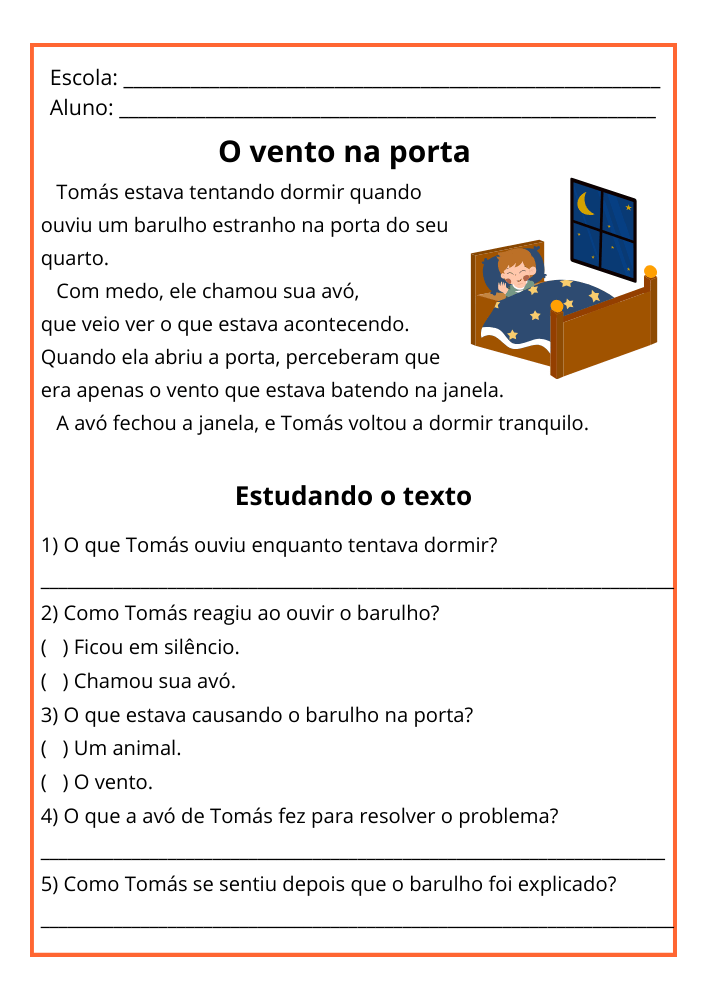 Escola: Aluno: o vento na porta Tomás estava tentando dormir quando ouviu um barulho estranho na porta do seu quarto. Com medo, ele chamou sua avó, que veio ver o que estava acontecendo. Quando ela abriu a porta, perceberam que era apenas o vento que estava batendo na janela. A avó fechou a janela, e Tomás voltou a dormir tranquilo. Estudando o texto 1) que Tomás ouviu enquanto tentava dormir? 2) Como Tomás reagiu ao ouvir o barulho? ( ) Ficou em silêncio. ( ) Chamou sua avó. 3) que estava causando o barulho na porta? ( ) Um animal. ( ) vento. 4) que a avó de Tomás fez para resolver o problema? 5) Como Tomás se sentiu depois que o barulho foi explicado?