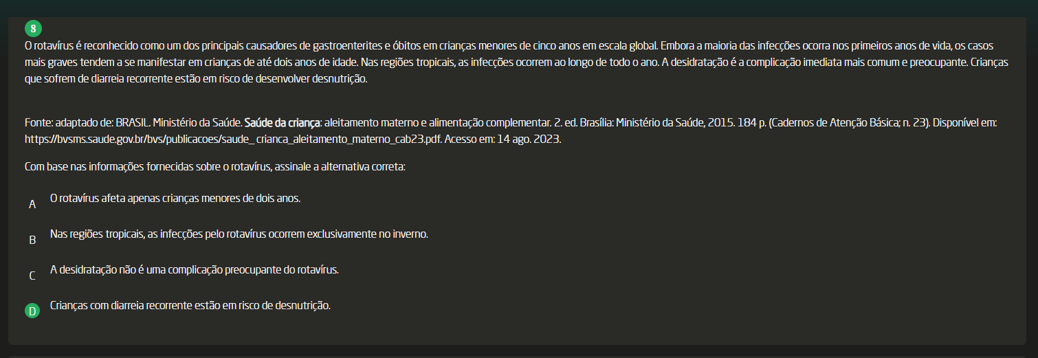 8 0 rotavírus é reconhecido como um dos principais causadores de gastroenterites e óbitos em crianças menores de cinco anos em escala global. Embora a maioria das infecções ocorra nos primeiros anos de vida, os casos mais graves tendem a se manifestar em crianças de até dois anos de idade. Nas regiões tropicais, as infecções ocorrem ao longo de todo ano. A desidratação é a complicação imediata mais comum e preocupante. Crianças que sofrem de diarreia recorrente estão em risco de desenvolver desnutrição. Fonte: adaptado de: BRASIL Ministério da Saúde da criança: aleitamento materno e alimentação complementar. 2. ed. Brasília: Ministério da Saúde, 2015. 184 p. (Cadernos de Atenção Básica: n. 23). Disponível em: em: 14 ago. 2023. Com base nas informações fornecidas sobre rotavírus, assinale a alternativa correta: A 0 rotavírus afeta apenas crianças menores de dois anos. B Nas regiões tropicais, as infecções pelo rotavírus ocorrem exclusivamente no inverno. C A desidratação não é uma complicação preocupante do rotavírus. D Crianças com diarreia recorrente estão em risco de desnutrição.