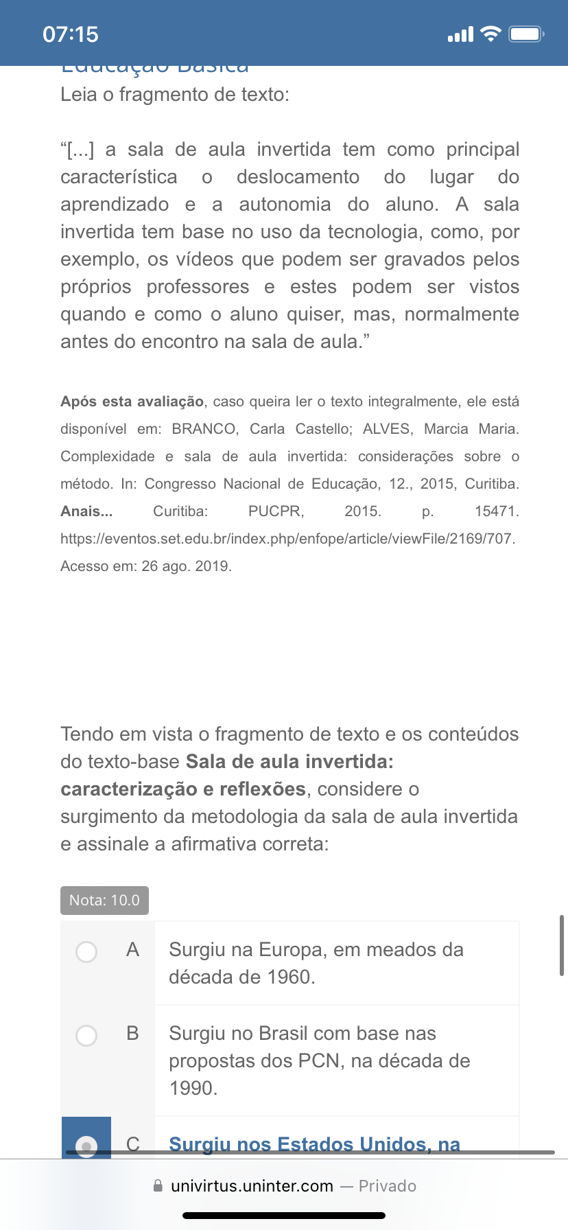 07:15 Leia o fragmento de texto: "[...] a sala de aula invertida tem como principal característica o deslocamento do lugar do aprendizado e a autonomia do aluno. A sala invertida tem base no uso da tecnologia, como, por exemplo, os vídeos que podem ser gravados pelos próprios professores e estes podem ser vistos quando e como o aluno quiser, mas, normalmente antes do encontro na sala de aula." Após esta avaliação, caso queira ler o texto integralmente, ele está disponível em: BRANCO, Carla ALVES, Marcia Maria. Complexidade e sala de aula invertida: considerações sobre o método. In: Congresso Nacional de Educação, 12., 2015, Curitiba. Anais... Curitiba: PUCPR, 2015. p. 15471. https://eventos.set.edu.br/index.php/enfope/article/viewFile/2169/707 Acesso em: 26 ago. 2019. Tendo em vista o fragmento de texto e os conteúdos do texto-base Sala de aula invertida: caracterização e reflexões, considere o surgimento da metodologia da sala de aula invertida e assinale a afirmativa correta: Nota: 10.0 A Surgiu na Europa, em meados da década de 1960. B Surgiu no Brasil com base nas propostas dos PCN, na década de 1990. C Surgiu nos Estados Unidos, na univirtus.uninter.com - Privado