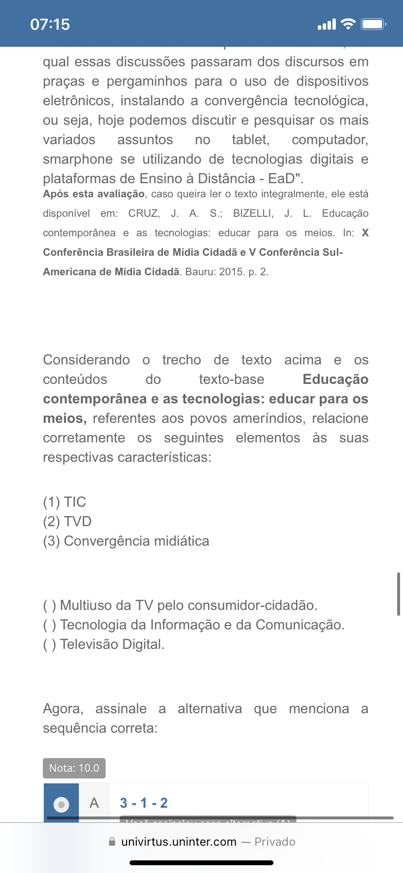 07:15 qual essas discussões passaram dos discursos em praças e pergaminhos para o uso de dispositivos eletrônicos, instalando a convergência tecnológica, ou seja, hoje podemos discutir e pesquisar os mais variados assuntos no tablet, computador, smarphone se utilizando de tecnologias digitais e plataformas de Ensino à Distância - EaD". Após esta avaliação, caso queira ler o texto integralmente, ele está disponível em: CRUZ, J. A. S.; BIZELLI, J. L. Educação contemporânea e as tecnologias: educar para os In: X Conferência Brasileira de Mídia Cidadã e V Conferência Sul- Americana de Mídia Bauru: 2015. p. 2. Considerando o trecho de texto acima e os conteúdos do texto-base Educação contemporânea e as tecnologias: educar para os meios, referentes aos povos ameríndios, relacione corretamente os seguintes elementos às suas respectivas características: (1) TIC (2) TVD (3) Convergência midiática Multiuso da TV pelo Tecnologia da Informação e da Comunicação. Televisão Digital. Agora, assinale a alternativa que menciona a sequência correta: Nota: 10.0 A univirtus.uninter.com - Privado