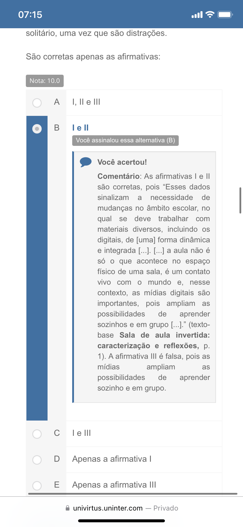 07:15 solitário, uma vez que são distrações. São corretas apenas as afirmativas: Nota: 10.0 A I, e III B Você assinalou essa alternativa (B) Você acertou! Comentário: As afirmativas e são corretas, pois "Esses dados sinalizam a necessidade de mudanças no âmbito escolar, no qual se deve trabalhar com materiais diversos, incluindo os digitais, de [uma] forma dinâmica e integrada [...]. [...] a aula não é só o que acontece no espaço físico de uma sala, é um contato vivo com o mundo e, nesse contexto, as mídias digitais são importantes, pois ampliam as possibilidades de aprender sozinhos e em grupo [...]." (texto- base Sala de aula invertida: caracterização e reflexões, p. 1). A afirmativa III é falsa, pois as mídias ampliam as possibilidades de aprender sozinho e em grupo. C e III D Apenas a afirmativa E Apenas a afirmativa III univirtus.uninter.com - Privado